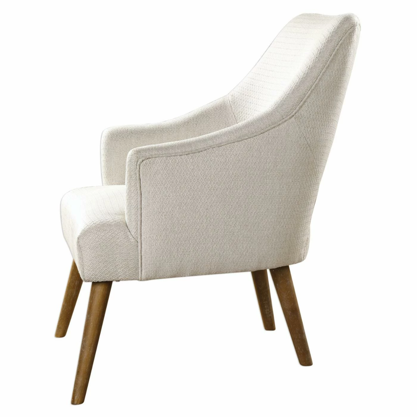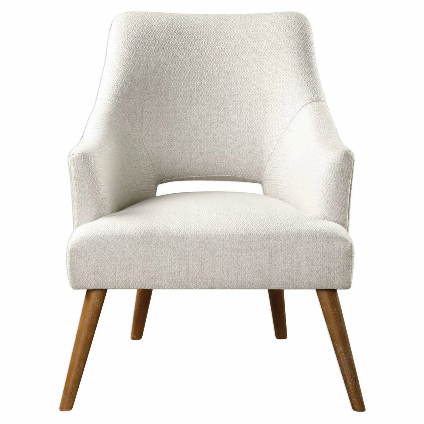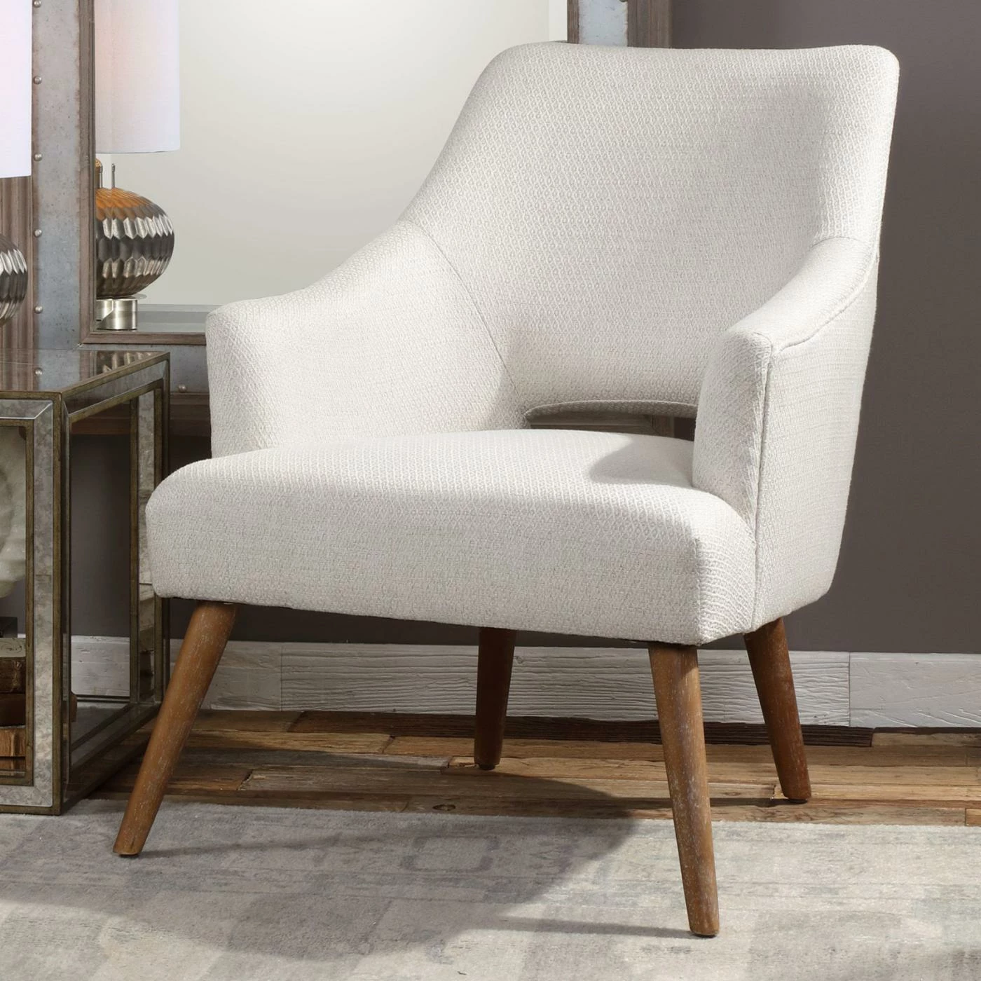 For an updated take on a retro style, the Uttermost Dree Retro Accent Chair is upholstered in neutral chenille fabric with a subtle woven argyle pattern. Your new favorite accent chair sits on tapered dowel legs in a lightly washed golden oak finish. This versatile accent chair feels right at home in a living room, den, or bedroom.