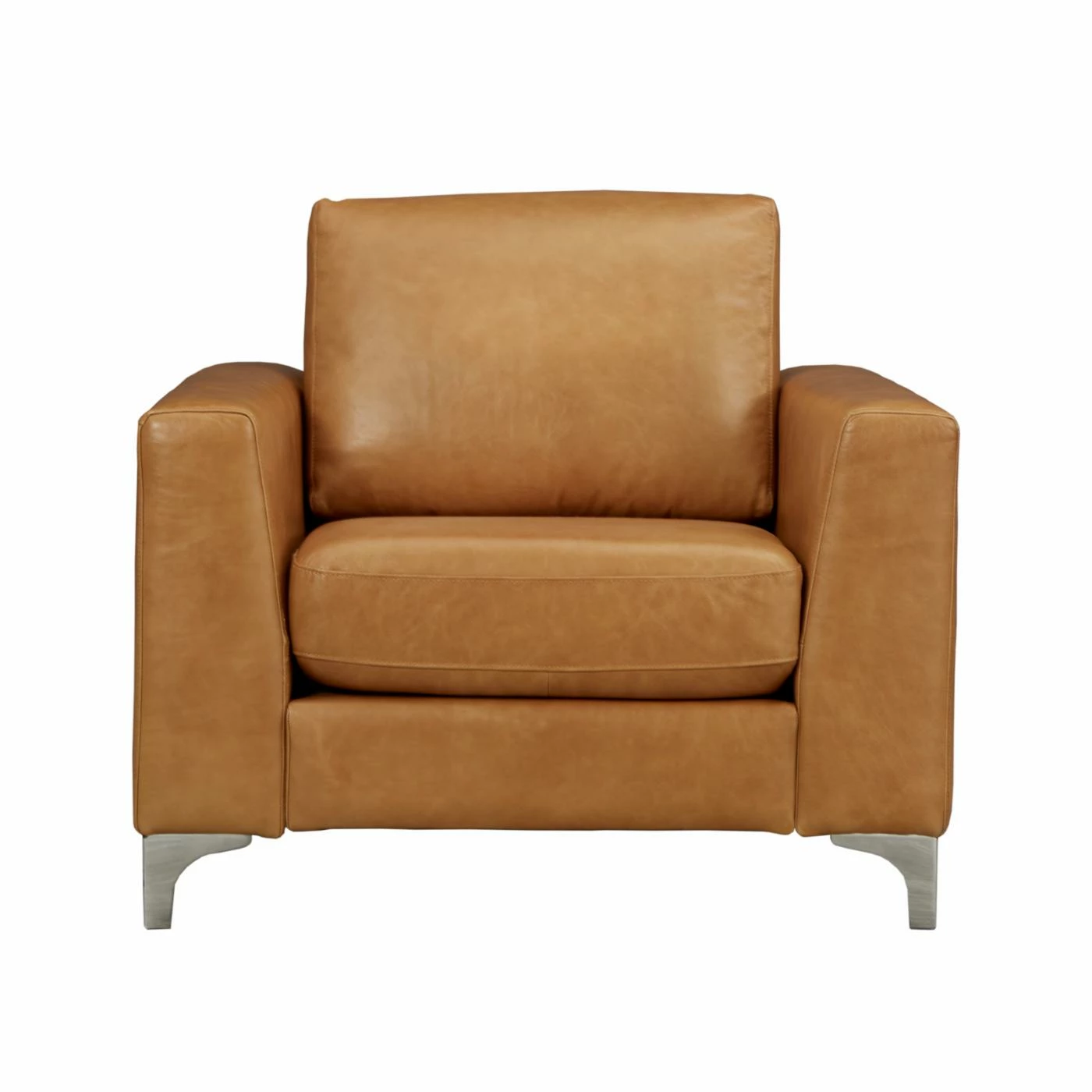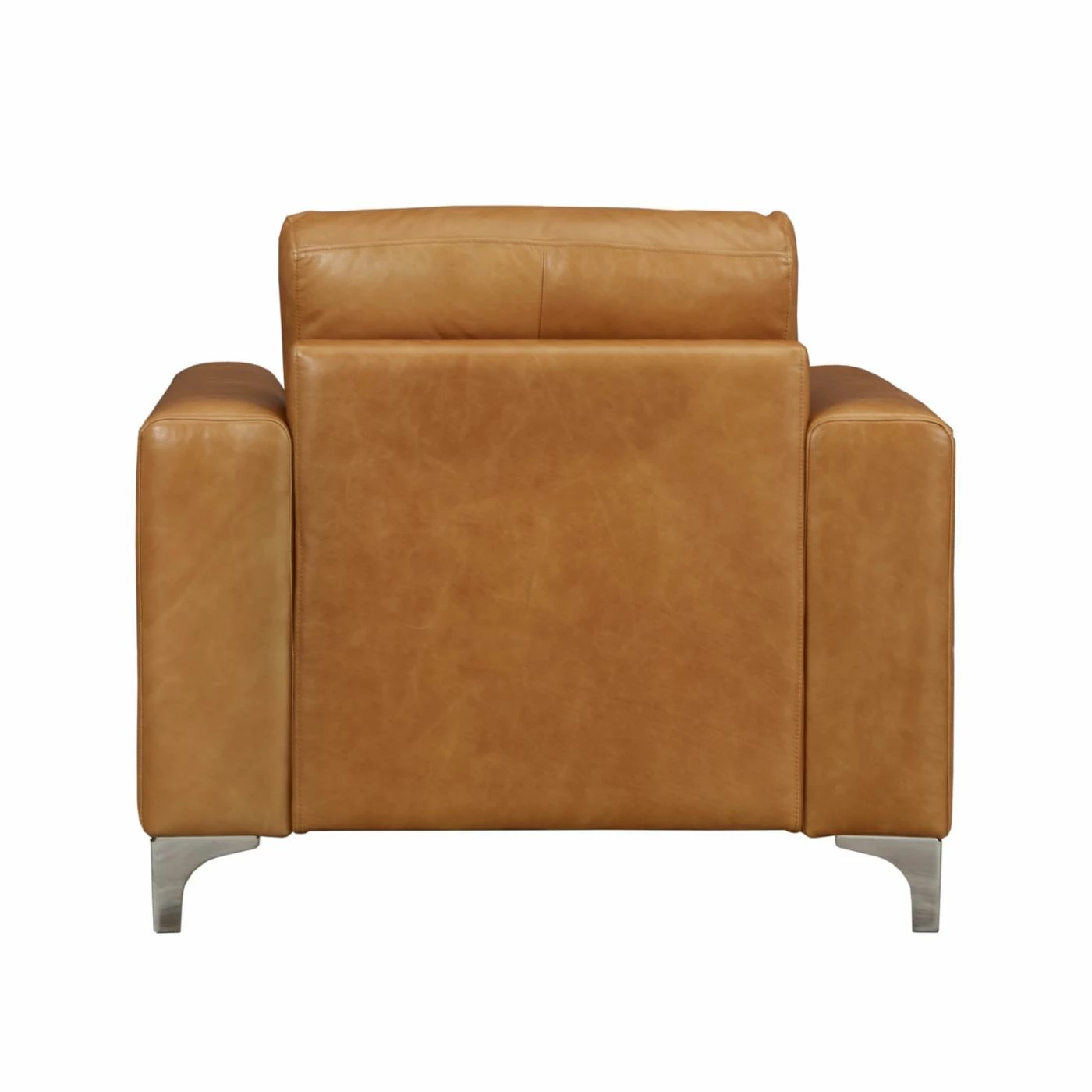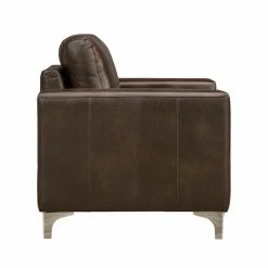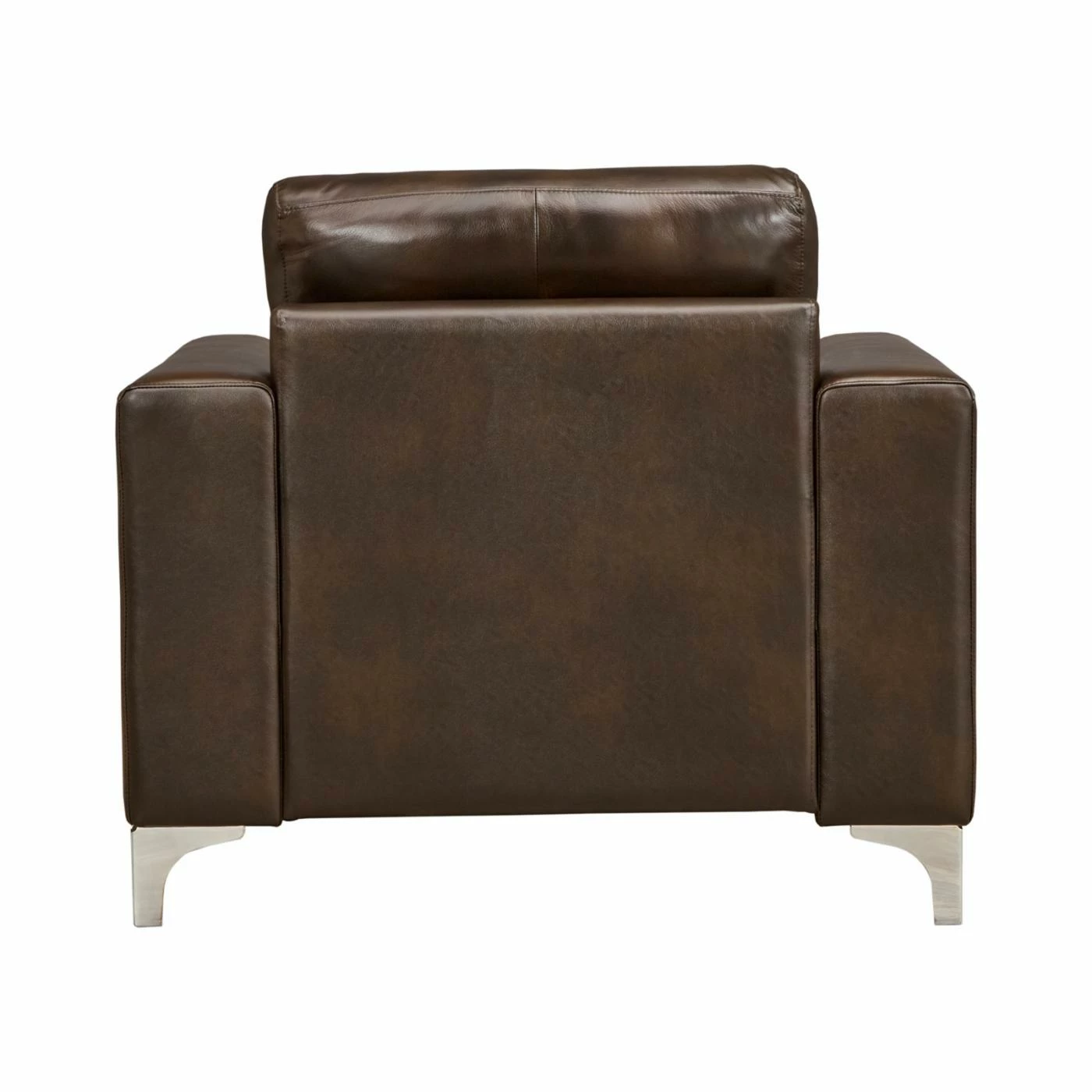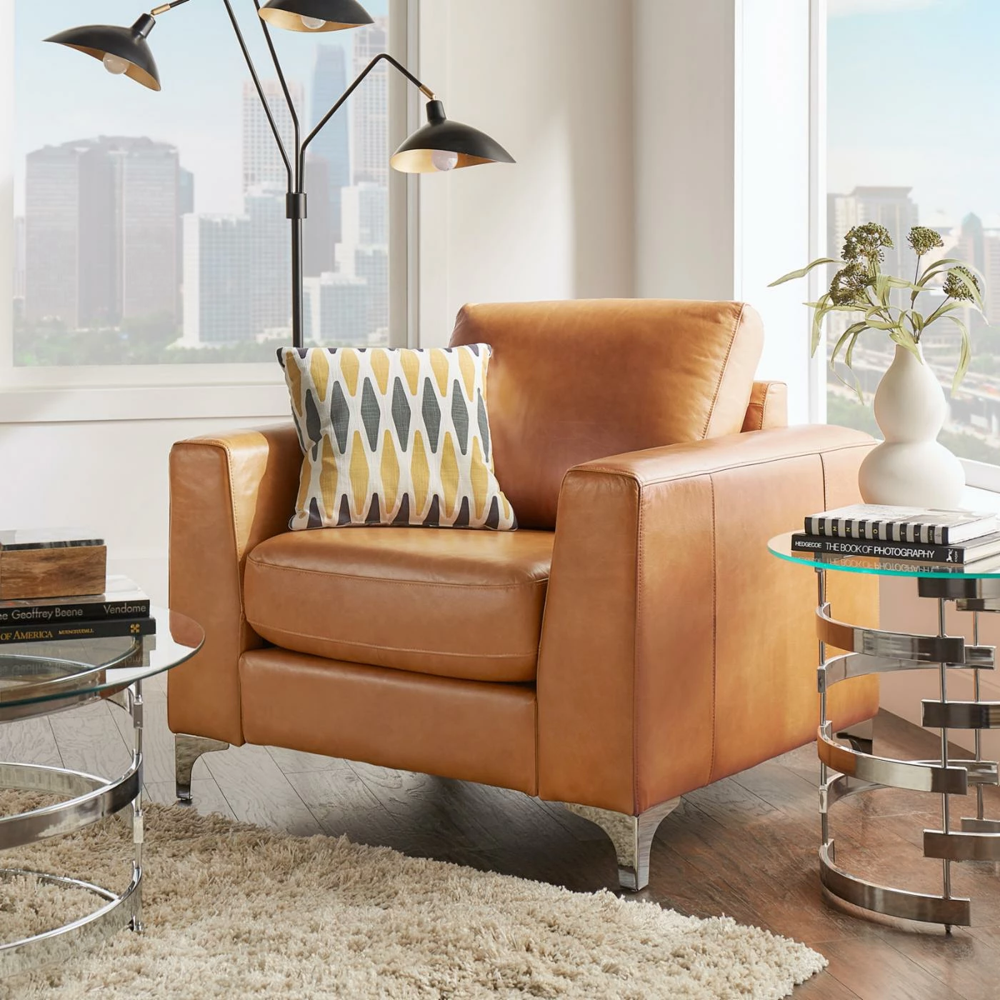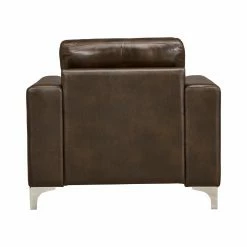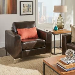 Add a new point of comfort to your space with the Weston Home Bronston Aniline Leather Accent Chair with removable seat and back cushions. Behind your back you’ll enjoy the pleasure of a fiber fill while the seat cushion offers you the plush comforts of foam. The chair is upholstered with a mix of leather and leather-inspired materials that are easy to clean and designed to withstand wear and tear. Plus, this chair is supported by tapered metal legs with a chrome finish, which add flair and offer over three inches of clearance below.
