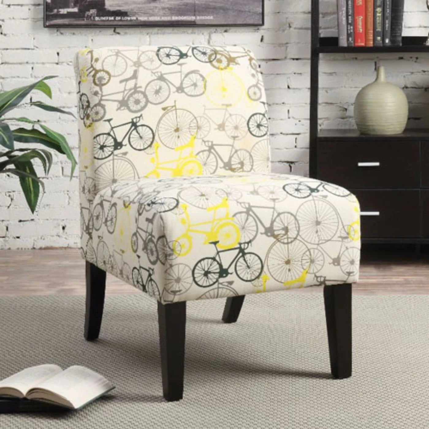 Fun will come pedaling into your dΓ©cor with the Benzara Bicycle Accent Chair. The crisp fabric upholstery is covered with a whimsical bicycle print with cheerful pops of yellow. Black solid poplar wood legs support the comfortable foam-cushioned chair. No assembly required.