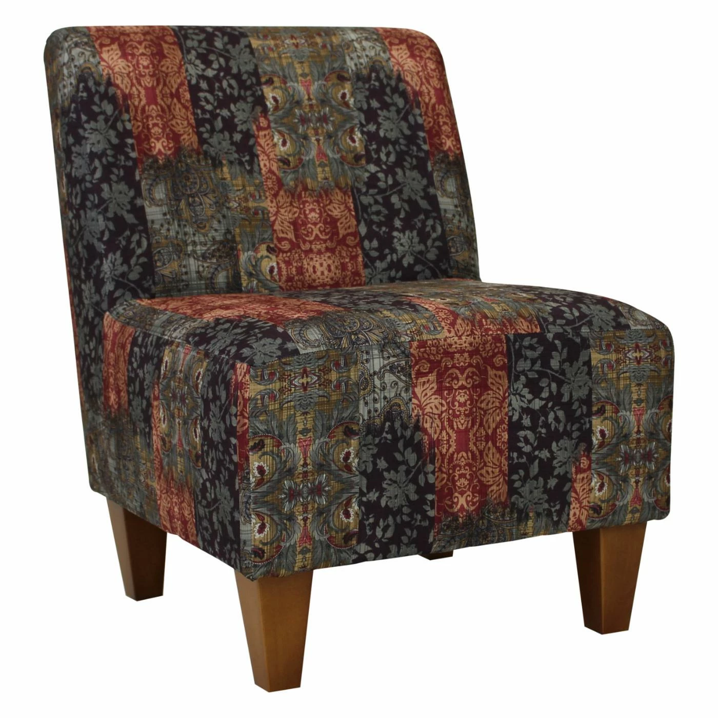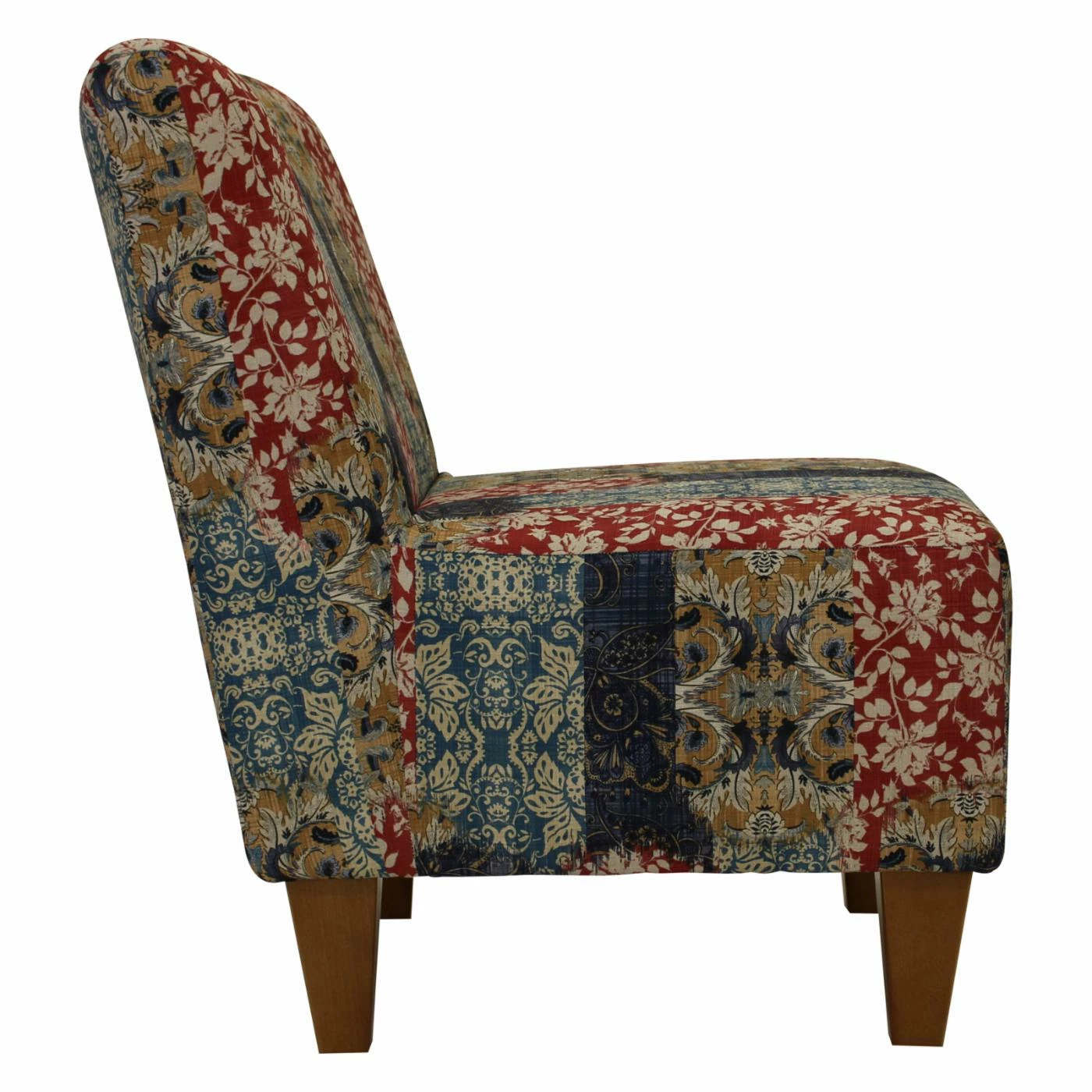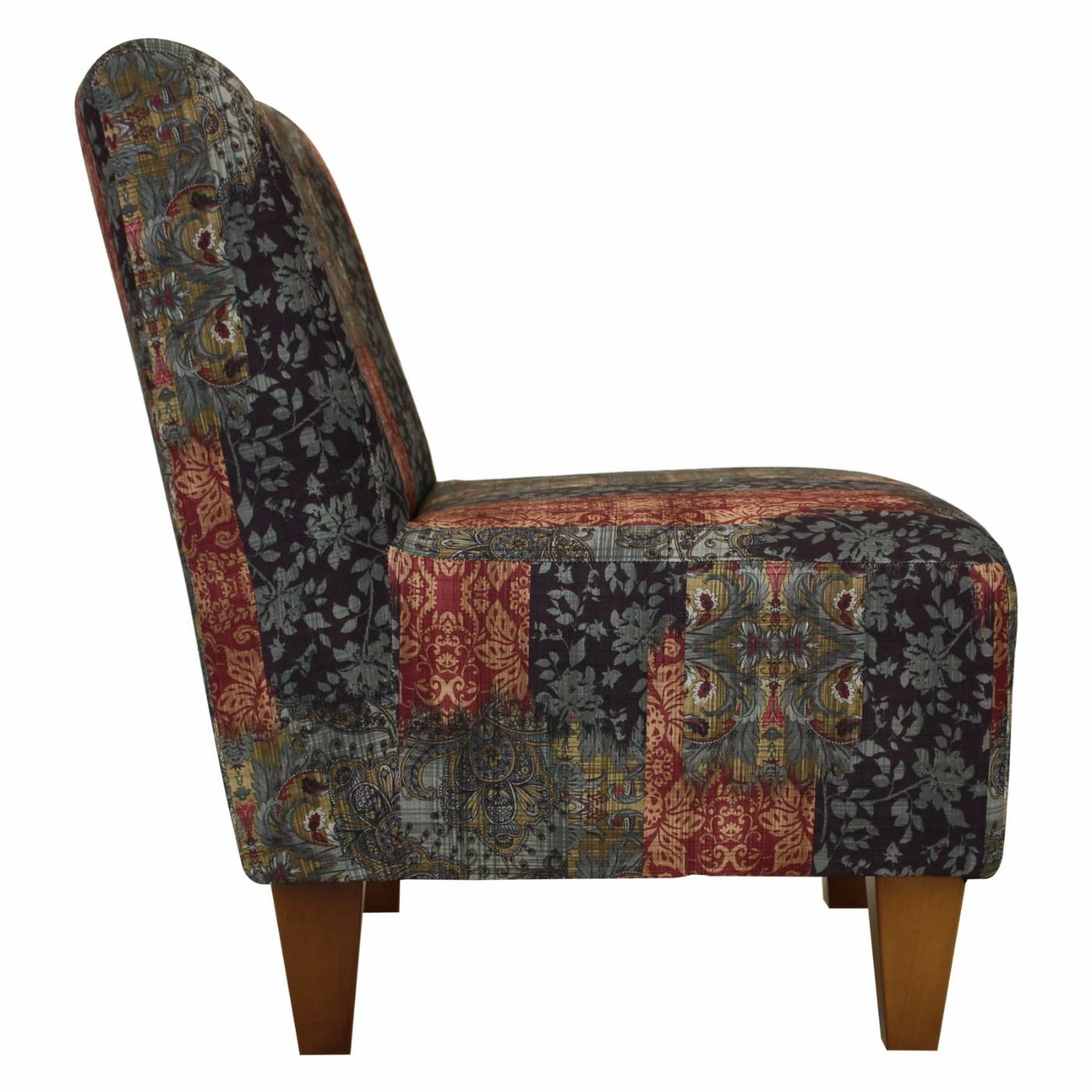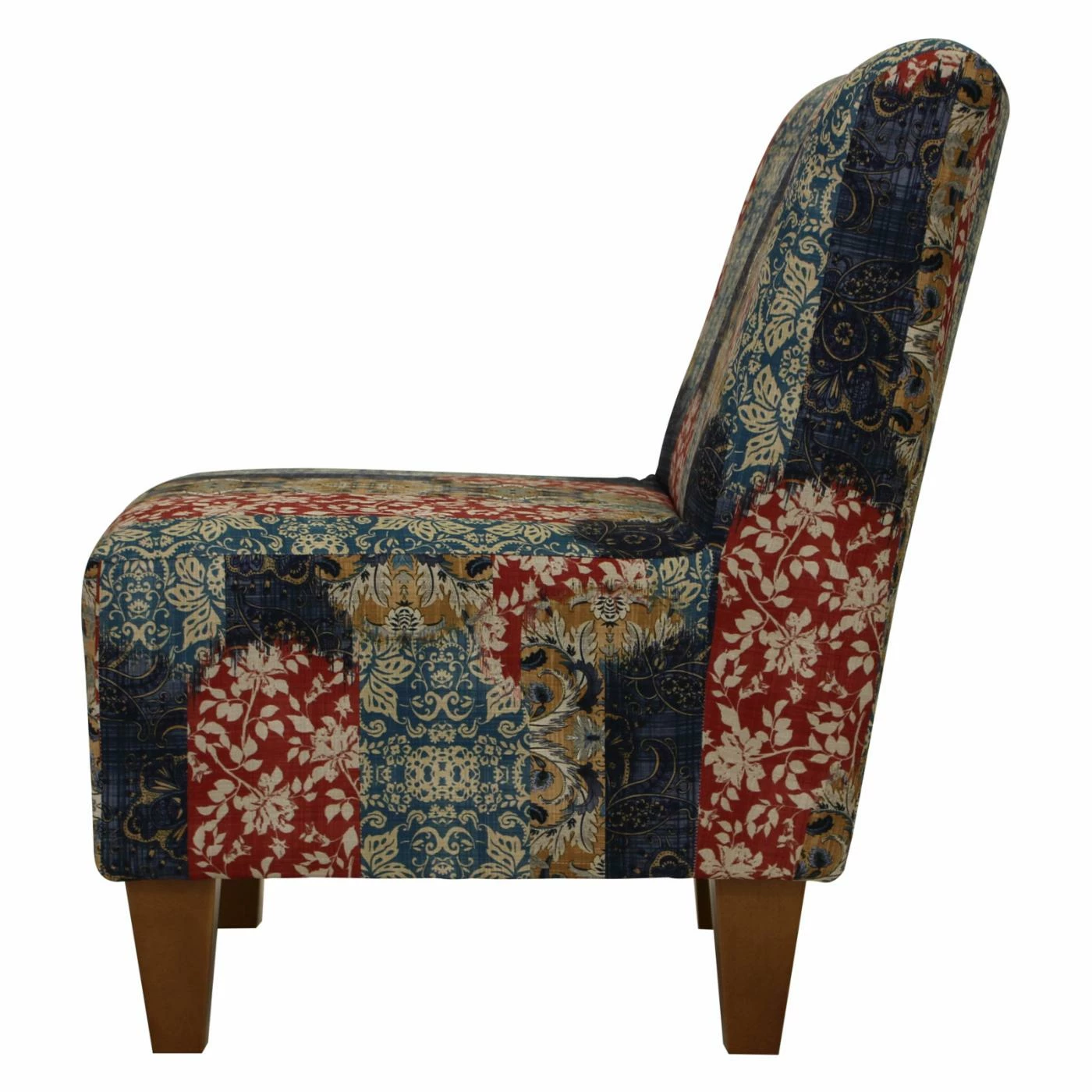 The Fox Hill Penelope Patchwork Armless Slipper Chair features a rich melange of exotic prints. With a wide seat and a strong wooden frame, this chair is ready to stand guard in your bedroom, den, or living room. Square tapered legs in a medium brown finish complete the look. Requires minimal assembly; made in the USA.