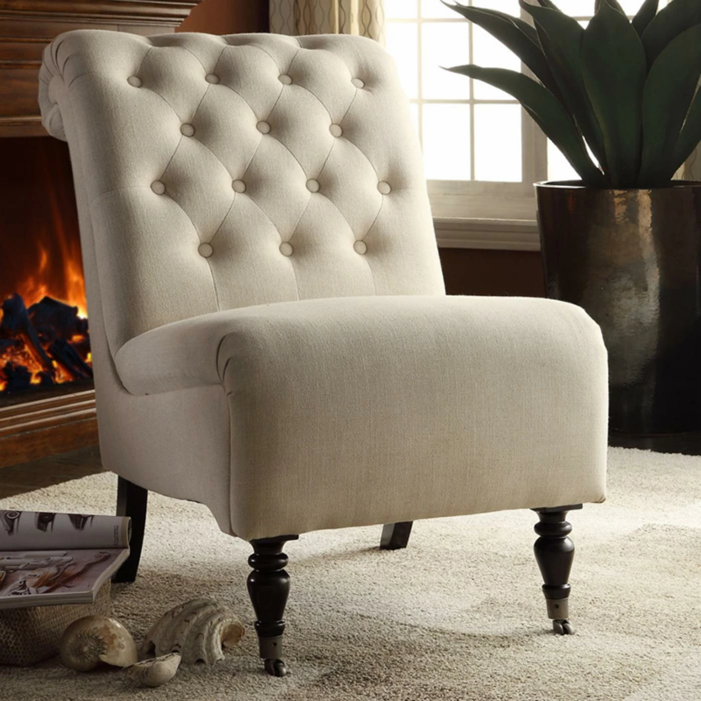The sophisticated Linon Cora Roll Back Tufted Chair brings elegance and comfortable seating to your space. Its rolled and tufted back creates a chic silhouette. It’s perfect in your living area, library, or bedroom. The linen textured fabric comes in handsome color options with coordinating finishes on the legs. Small metal casters on the elegantly turned front legs add charm and mobility.