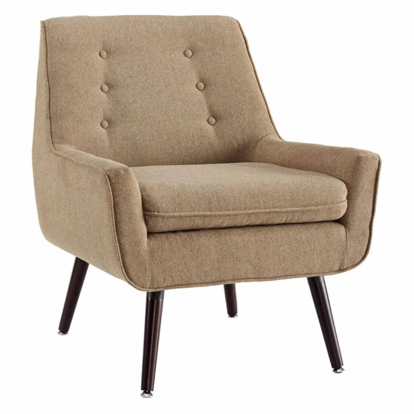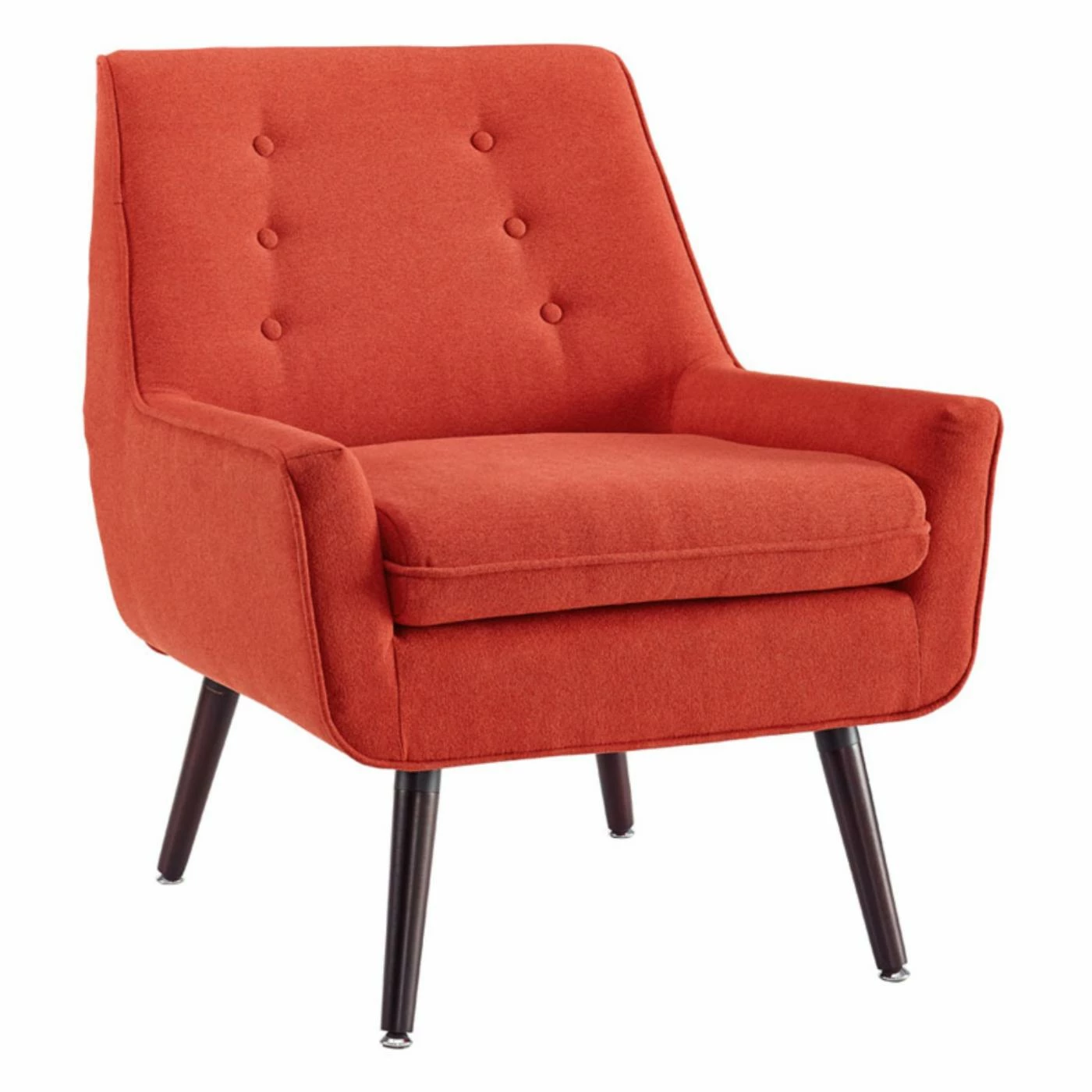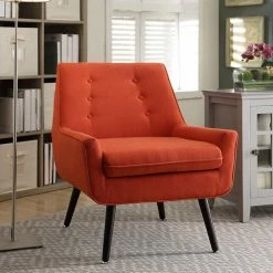 The wooden frame of the Linon Tiffany Accent Chair gives it strong structure and features angled legs for a retro twist. This accent chair features thick cushioning, a reclined backrest, and low armrests for comfort. Button tufting accents the fabric upholstery with polished charm. Choose from available upholstery colors to best complement your space.