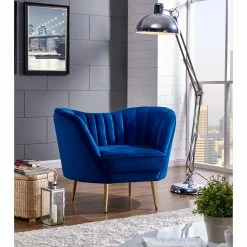 Bring back the elegant simplicity of the mid 20th century with the Meridian Furniture Inc Margo Velvet Chair. Upholstered in velvet with a rounded back and arms which are accented by beveled tufting, this accent chair adds mid-century style in any room. Stainless steel legs are finished in gold to complete the look. With your choice of available fabric colors, youβll have fun choosing the right look for your home. This item matches other pieces in the Meridian Furniture Inc Margo Velvet Collection.