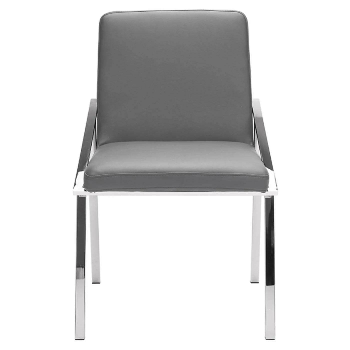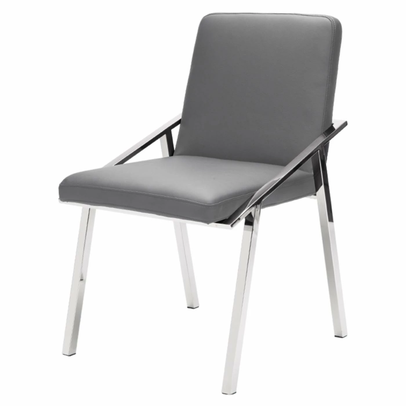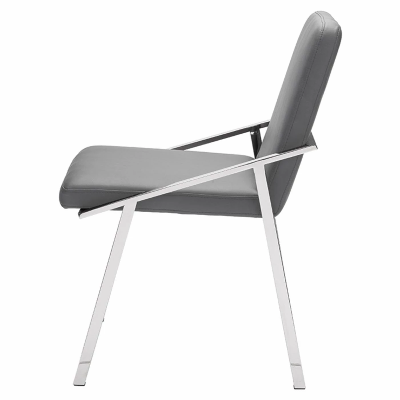The modernized Nuevo Nika Accent Chair has a simple silhouette with designer details. This accent chair features a stainless steel frame with angled arms and a polished chrome finish. Its seat and back are comfortably cushioned and upholstered in faux leather. Choose from available Naugahyde colors to make the chairs yours.