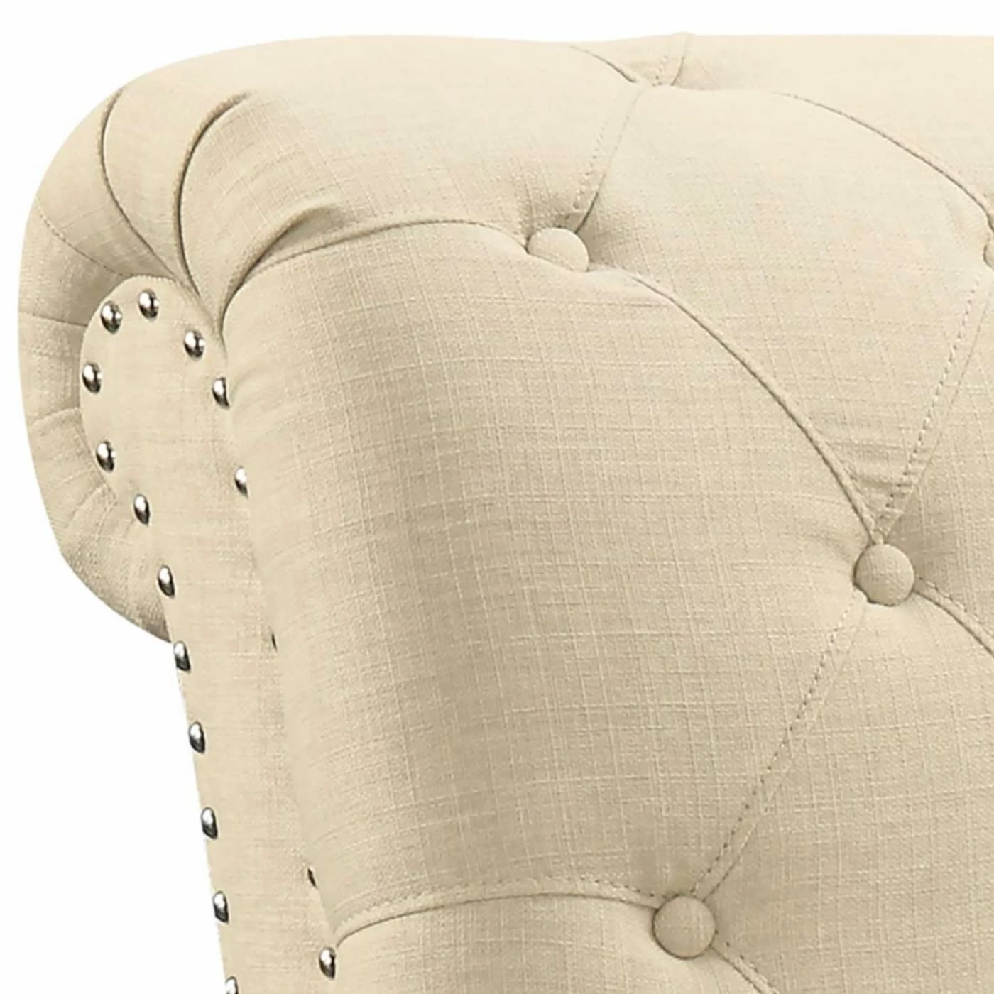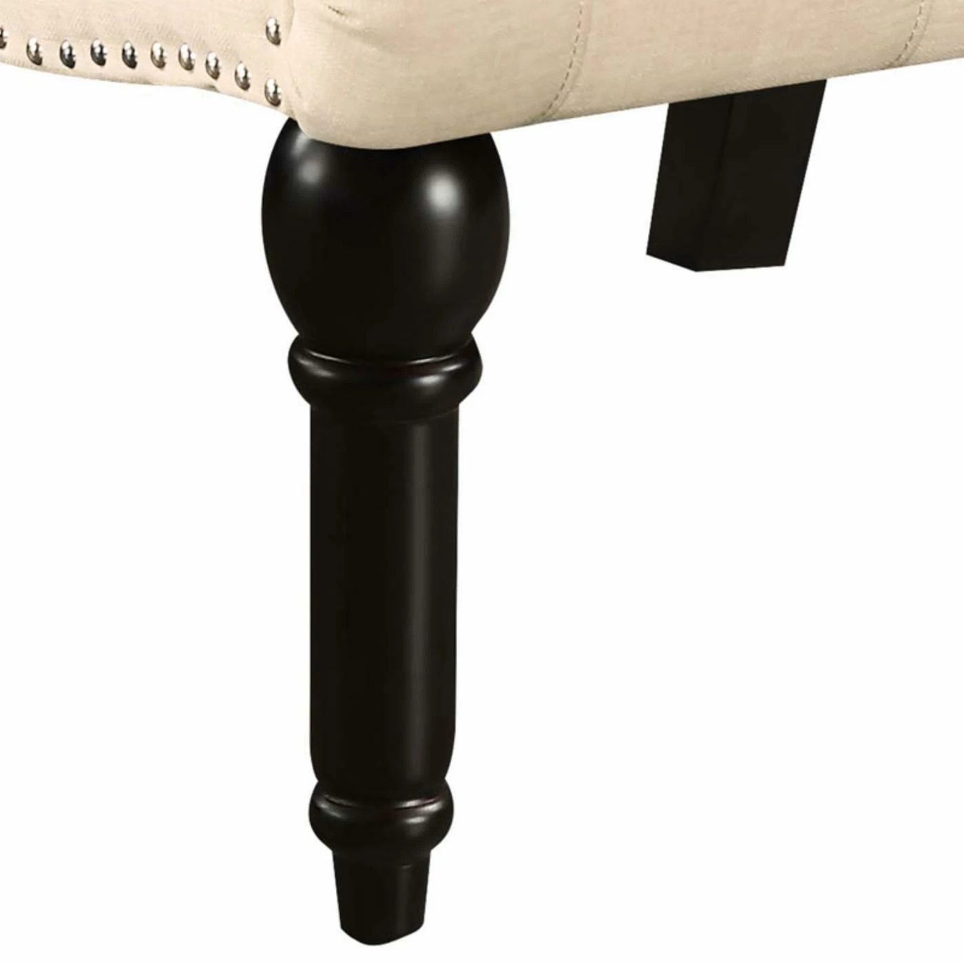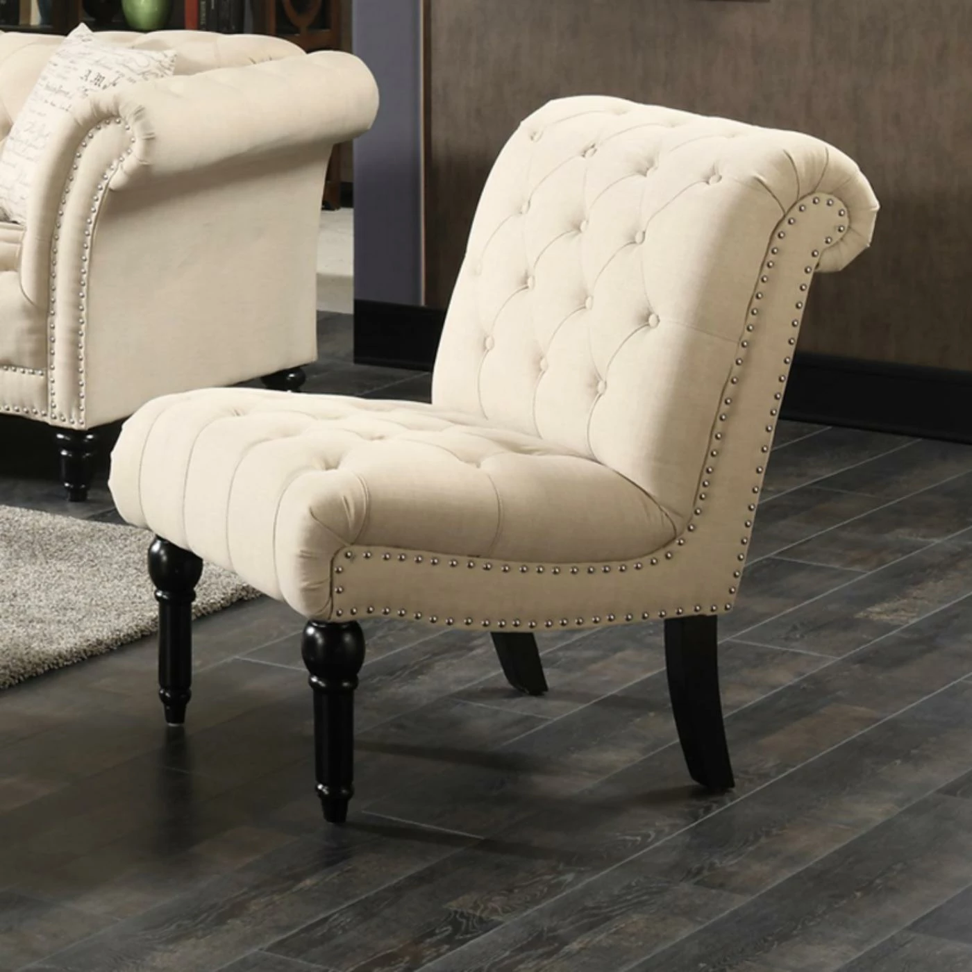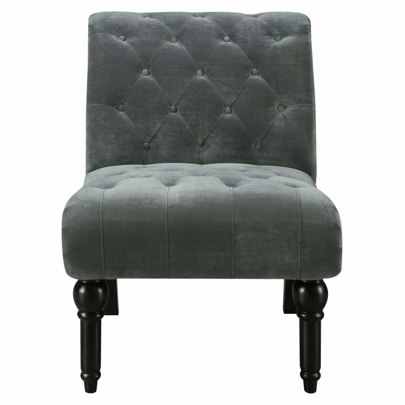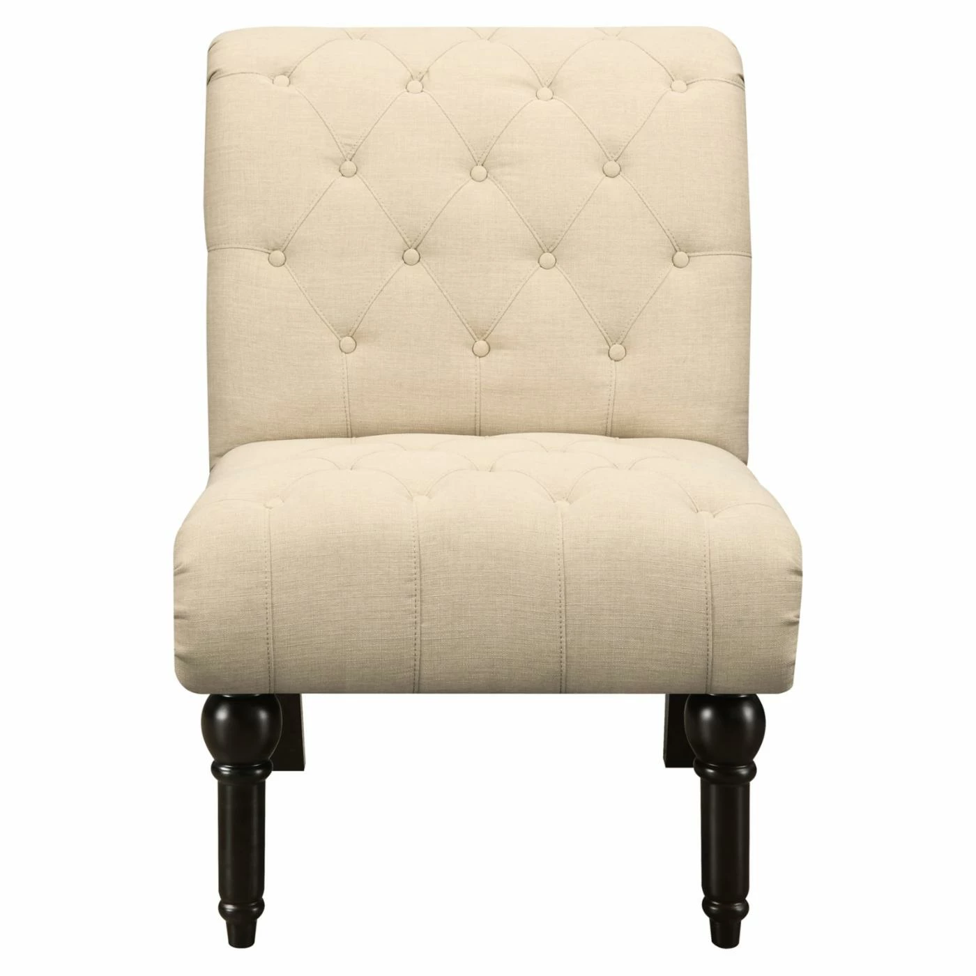 Tall, stately, and elegant, the Picket House Furnishings Twine Armless Upholstered Accent Chair offers traditional style with modern construction. The diamond button tufted detail on the back and seat is a classic touch while the extra thick cushioning is a more updated detail. The armless style creates a visual vertical line, which is extended by dark espresso turned wood legs. Enjoy as additional seating or as part of the Twine Collection.
