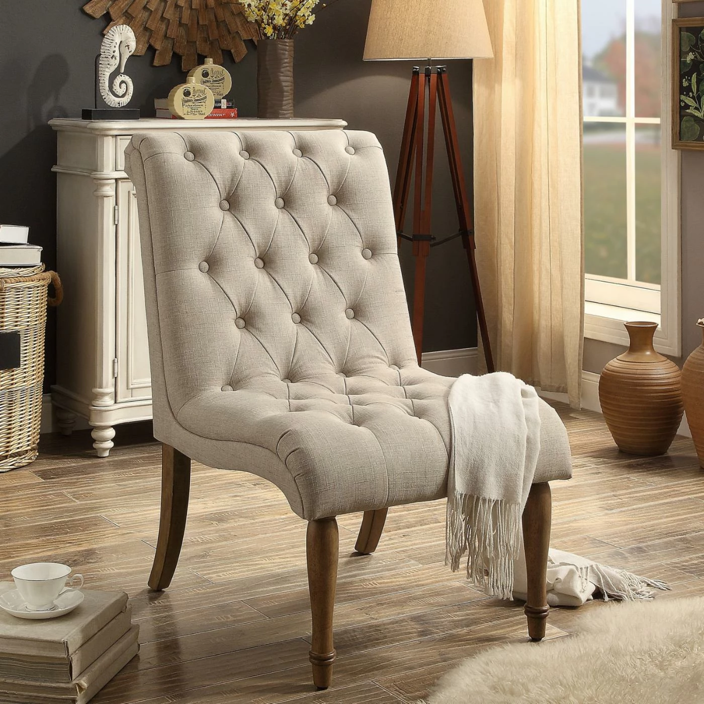 Give your home a sophisticated touch with the Rosevera Elvira Armless Accent Chair. This accent chair has an armless construction for space-saving convenience. Use it to elevate your dining room, office area, reading nook, or vanityβthe options are endless. This gently sloping chair offers ergonomic comfort and a durable wooden frame for lasting enjoyment. The soft beige hue ensures styling versatility, and tufted button accents complete the traditional look.