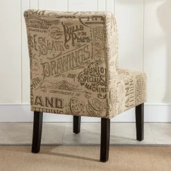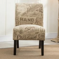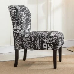 The Roundhill Furniture Capa Chalkboard Print Fabric Armless Contemporary Accent Chair combines the charm of an artisan chalkboard sign with a contemporary design. This armless chair is upholstered in fabric with an all-over print that resembles a chalkboard, complemented by espresso finish wooden legs. The kiln-dried hardwood frame is extra durable and the high-density foam cushion provides comfort. Choose from available finish options.