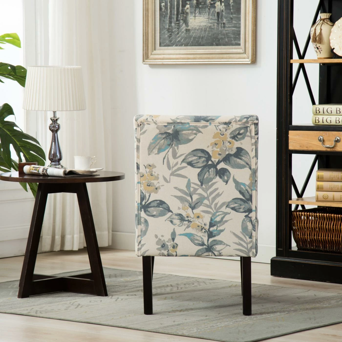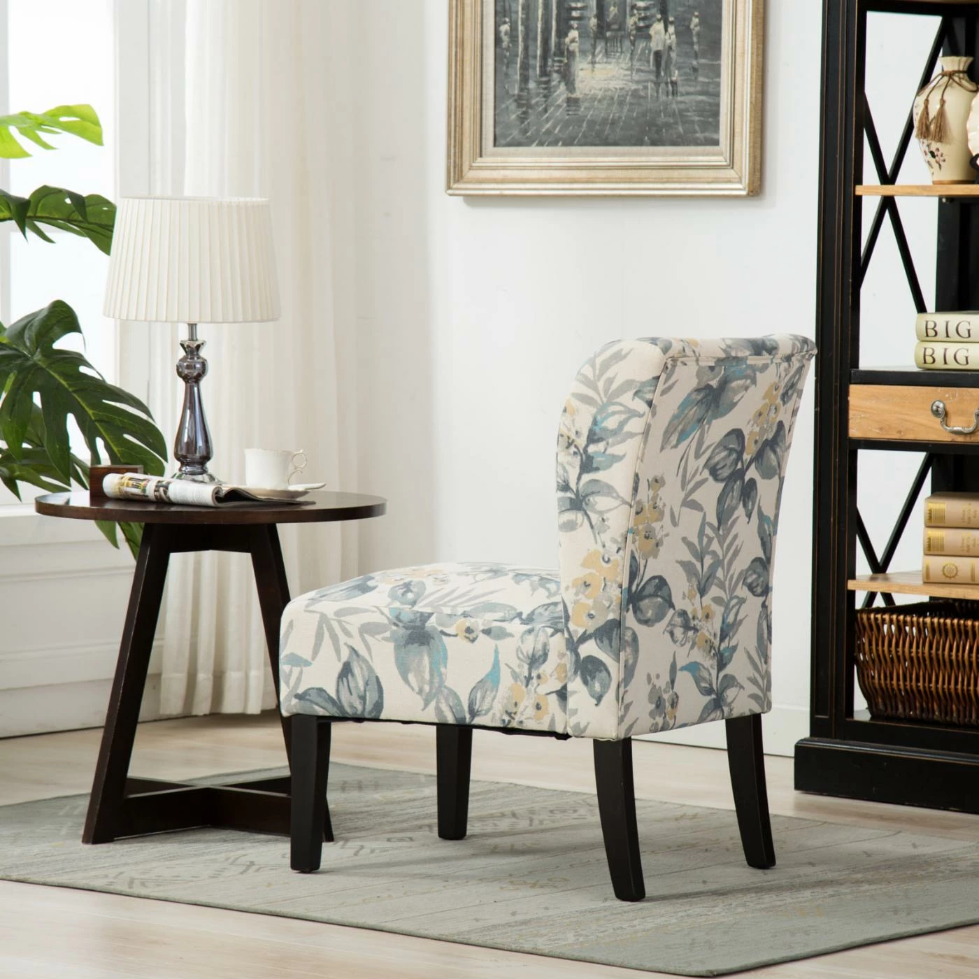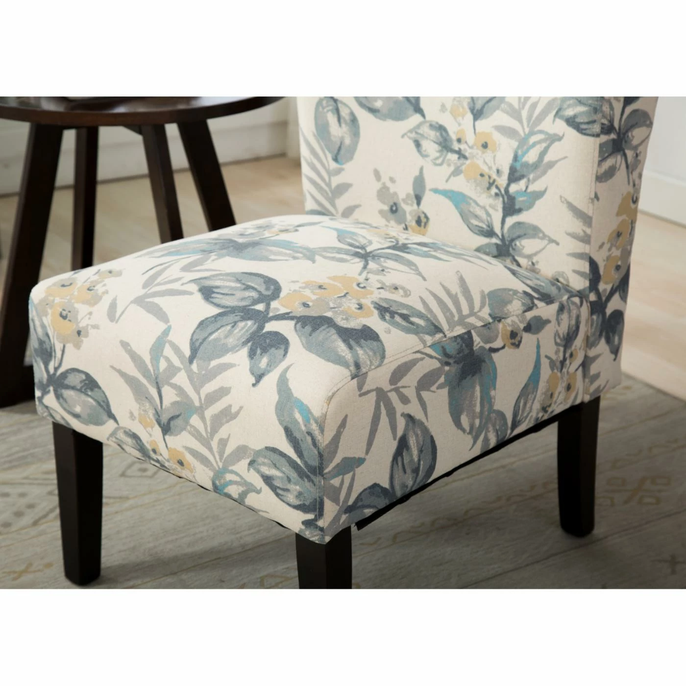 The Roundhill Furniture Capa Leaf Print Fabric Armless Contemporary Accent Chair is a fantastic piece to tie your living room together. The breezy blue-leaf floral-patterned fabric provides a nice contrast to the espresso-finished hardwood, and the chair’s foam-padded seat is extra comfortable. This lightweight, armless accent chair will be perfect when all you want to do is sit by the window on a sunny day.