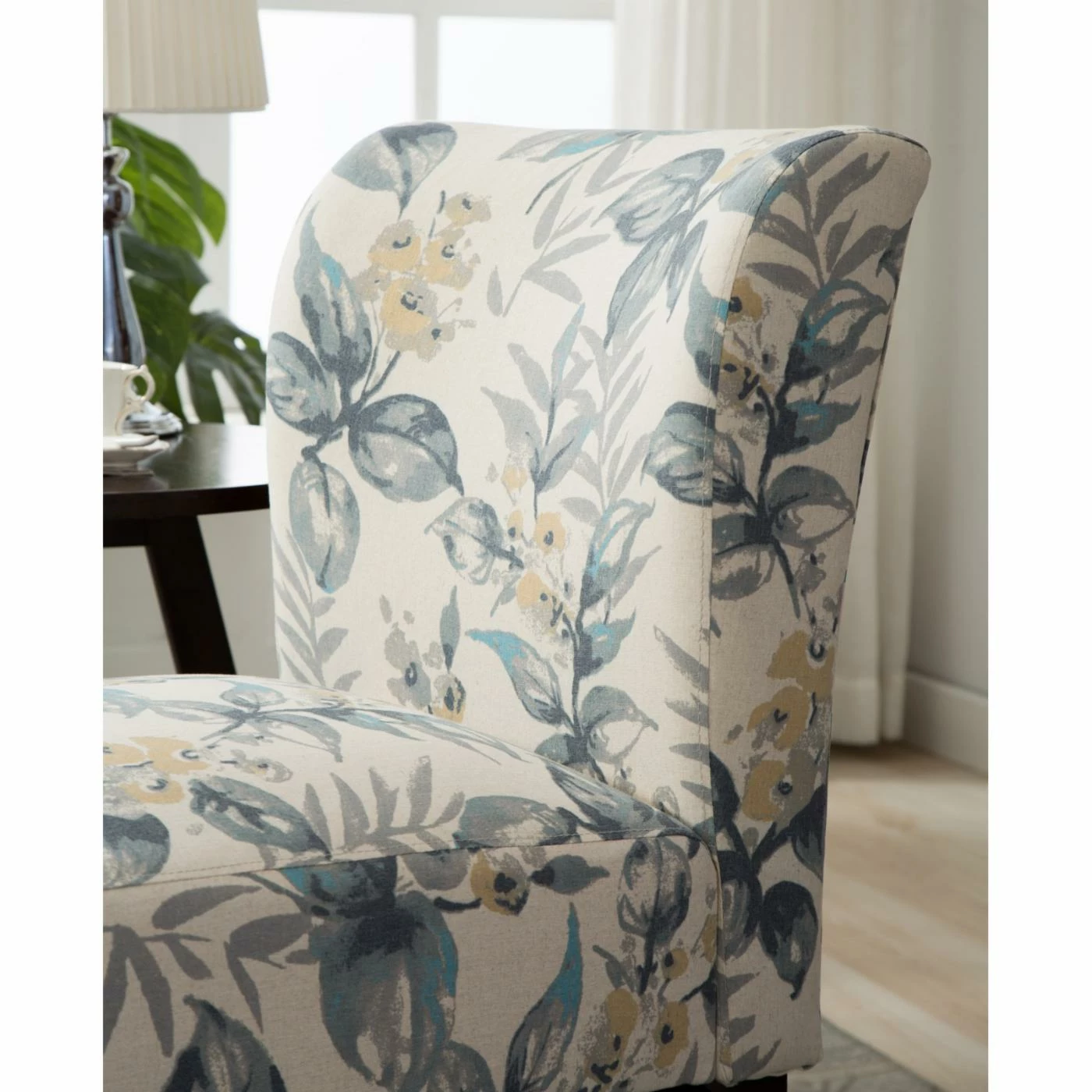 The Roundhill Furniture Capa Leaf Print Fabric Armless Contemporary Accent Chair comes with a manufacturer’s 30-day warranty. Some assembly is required. To keep it looking nice, we recommend you clean this armless accent chair with a damp cloth and skip the strong liquid cleaners.