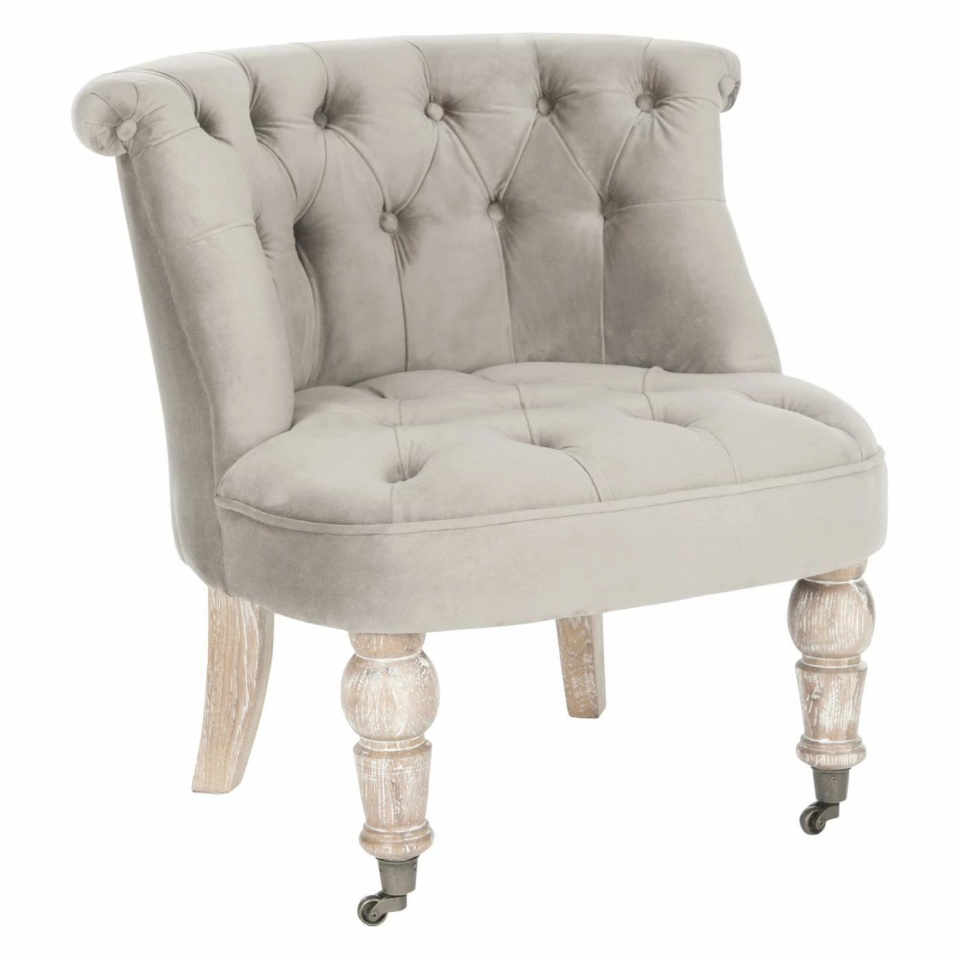 The Safavieh Carlin Tufted Chair features a wide seat and curved back with tufted detailing for an elevated look. This ultra-comfortable chair is highlighted by smooth, soft cotton velvet upholstery in a versatile taupe hue. Turned birch wood legs in a white-washed finish are enhanced with casters for easy movement throughout your home.