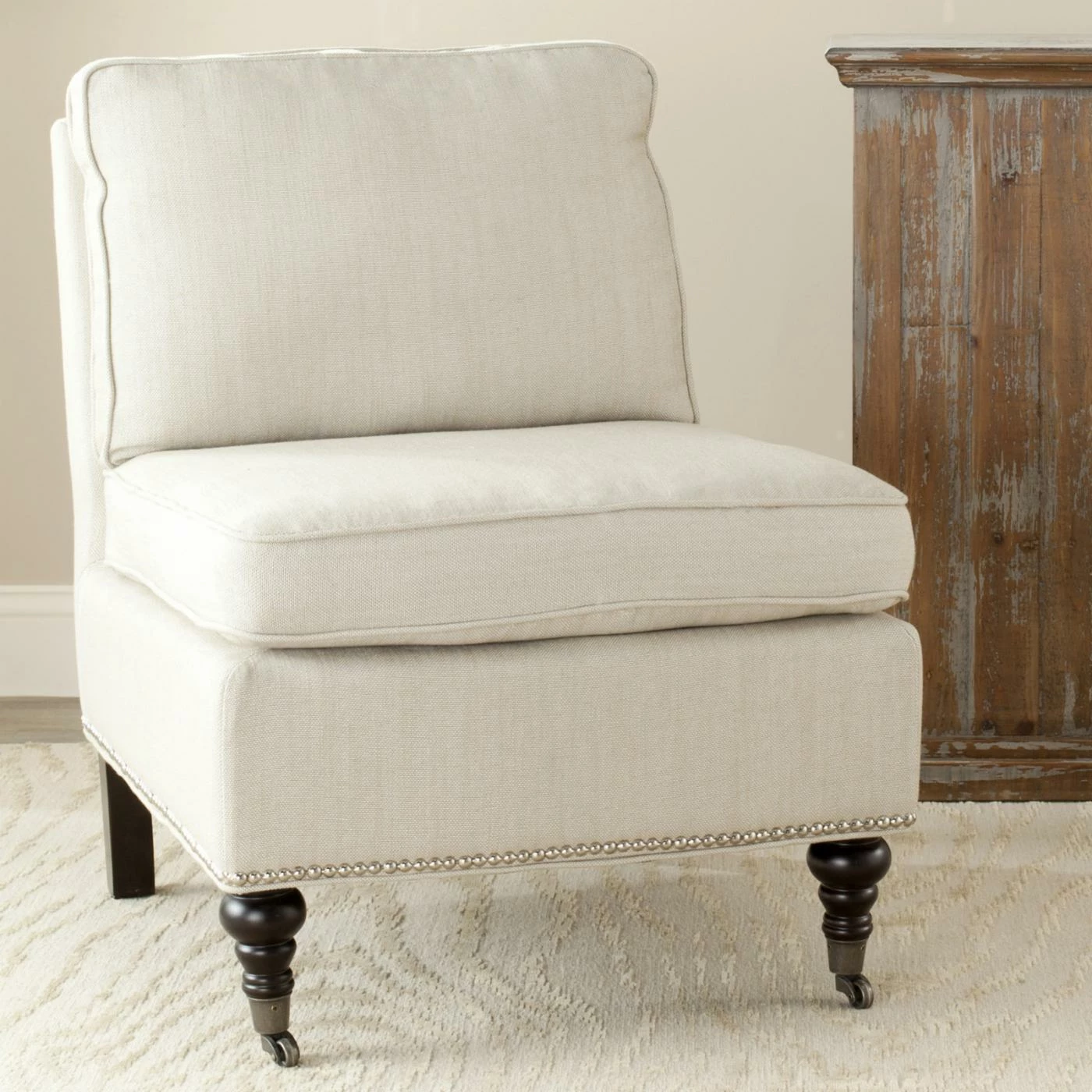 Clean lines lend a contemporary look to the Safavieh Randy Slipper Chair, completed in soft linen upholstery. This versatile slipper chair provides you with exceptional comfort thanks to the generously cushioned back and seat. Birch wood legs in a rich espresso finish give it a grounded look, and casters offer easy mobility throughout the room.