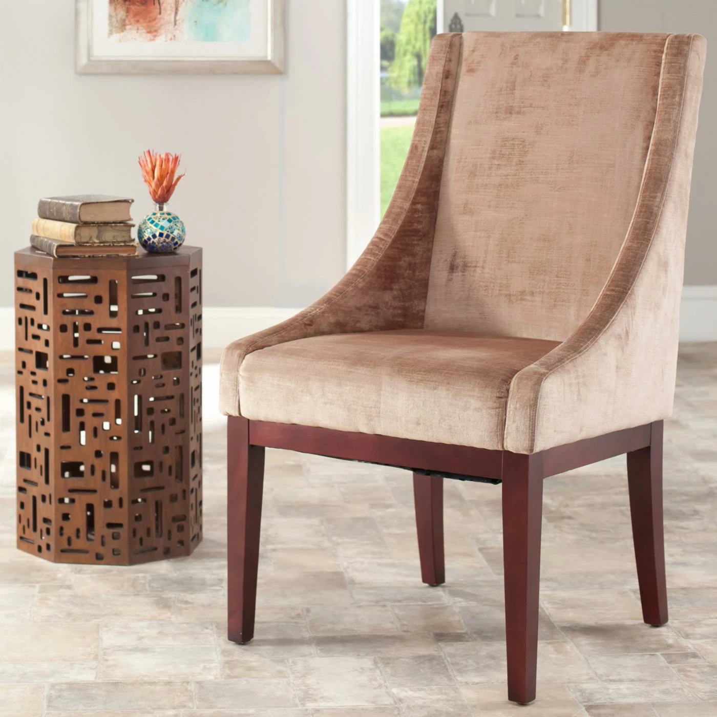 Bring a little luxury into your space with the Safavieh Velvet Sloping Arm Chair, covered in ultra-soft velvety fabric upholstery in a luxe mink brown color. This chic chair boasts sloped arms and a sleek silhouette for a transitional appearance in your chosen room. The durable frame and legs are crafted of birch wood and feature a cherry mahogany finish that completes the rich, warm look.