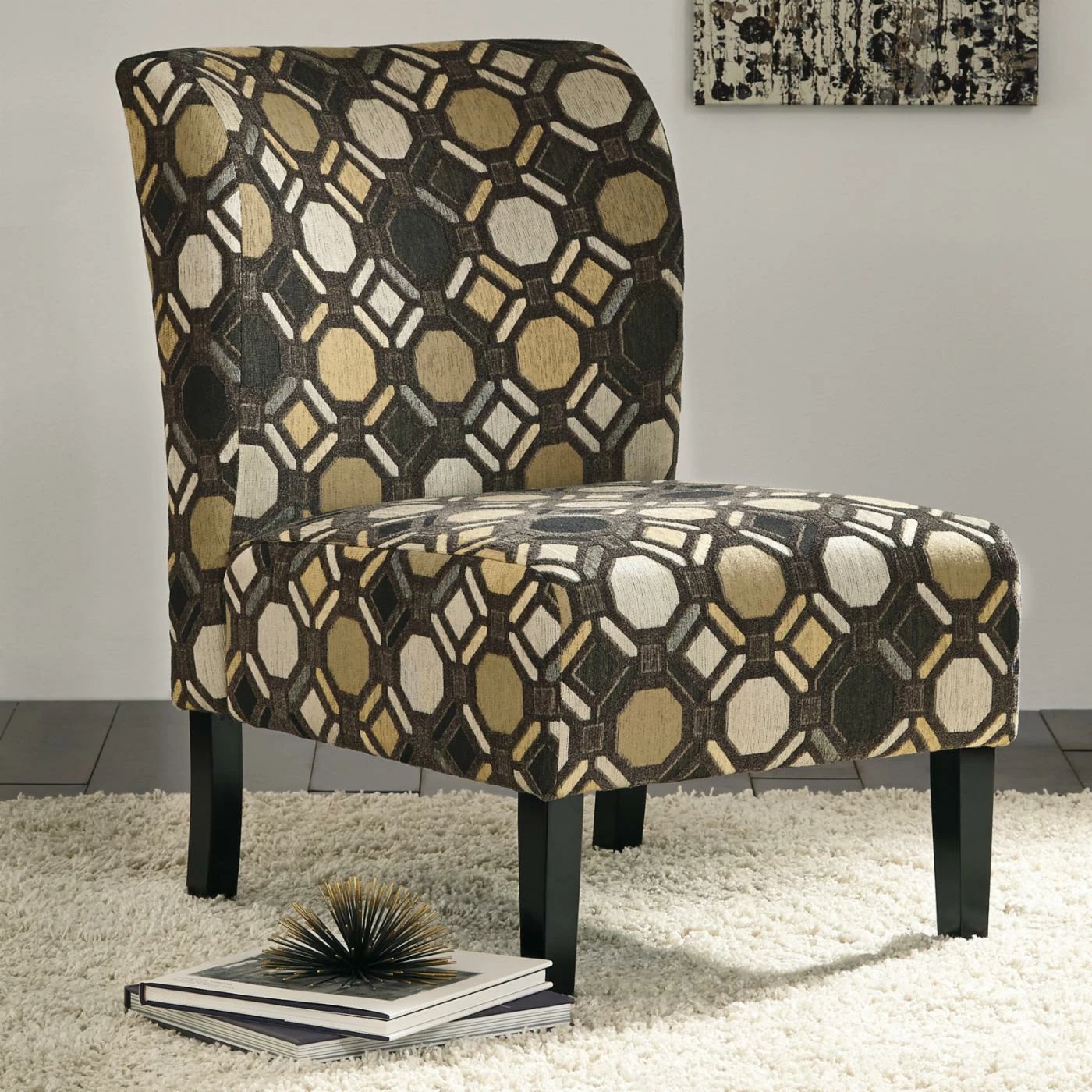 The classic slipper chair is right at home in any space – just look at the Signature Design by Ashley Tibbee Accent Chair. High-resiliency foam cushions wrapped in thick poly fiber ensures ultra comfort, while the clean lines create simplicity. The durable polyester fabric features a modern geometric print for a truly updated appeal. Contrasting exposed legs in faux-wood finish the look.