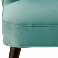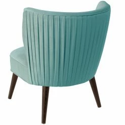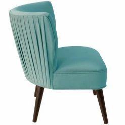 Create a cozy corner with mid-century flair with the Skyline Furniture Pleated Slipper Chair, a marble-topped table, and a gold-finished globe lamp. This slipper chair has a compact, armless design so that it fits into any space, but it doesn’t skimp on comfort. The back and over-stuffed seat are padded with polyester foam core and fill for plenty of support while you relax, chat, or read. The pleated backside of the chair adds texture and combines with the angled wood legs for plenty of mid-century style. A serene Caribbean blue polyester fabric adds some inviting color to any room.