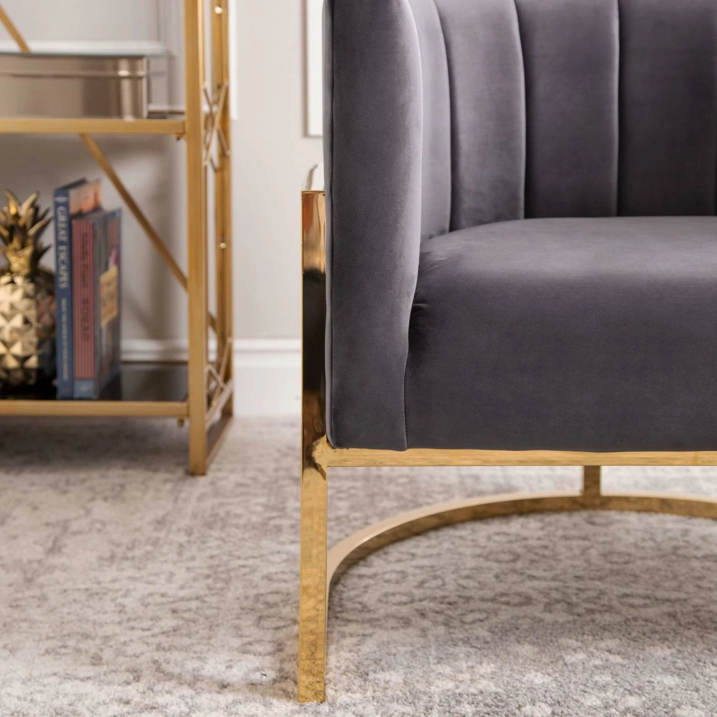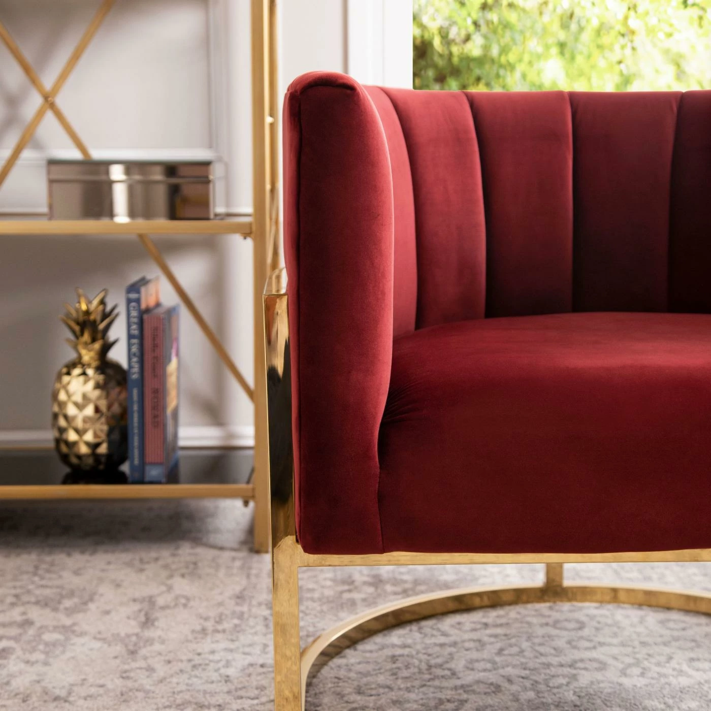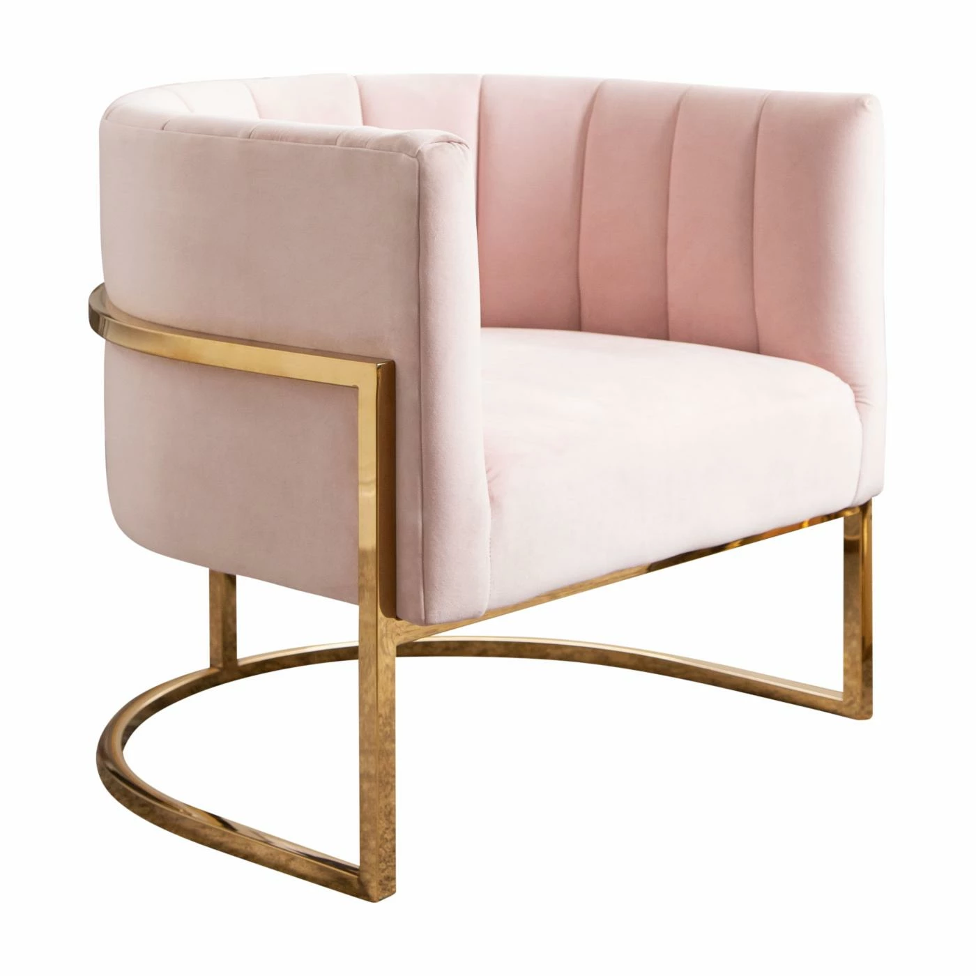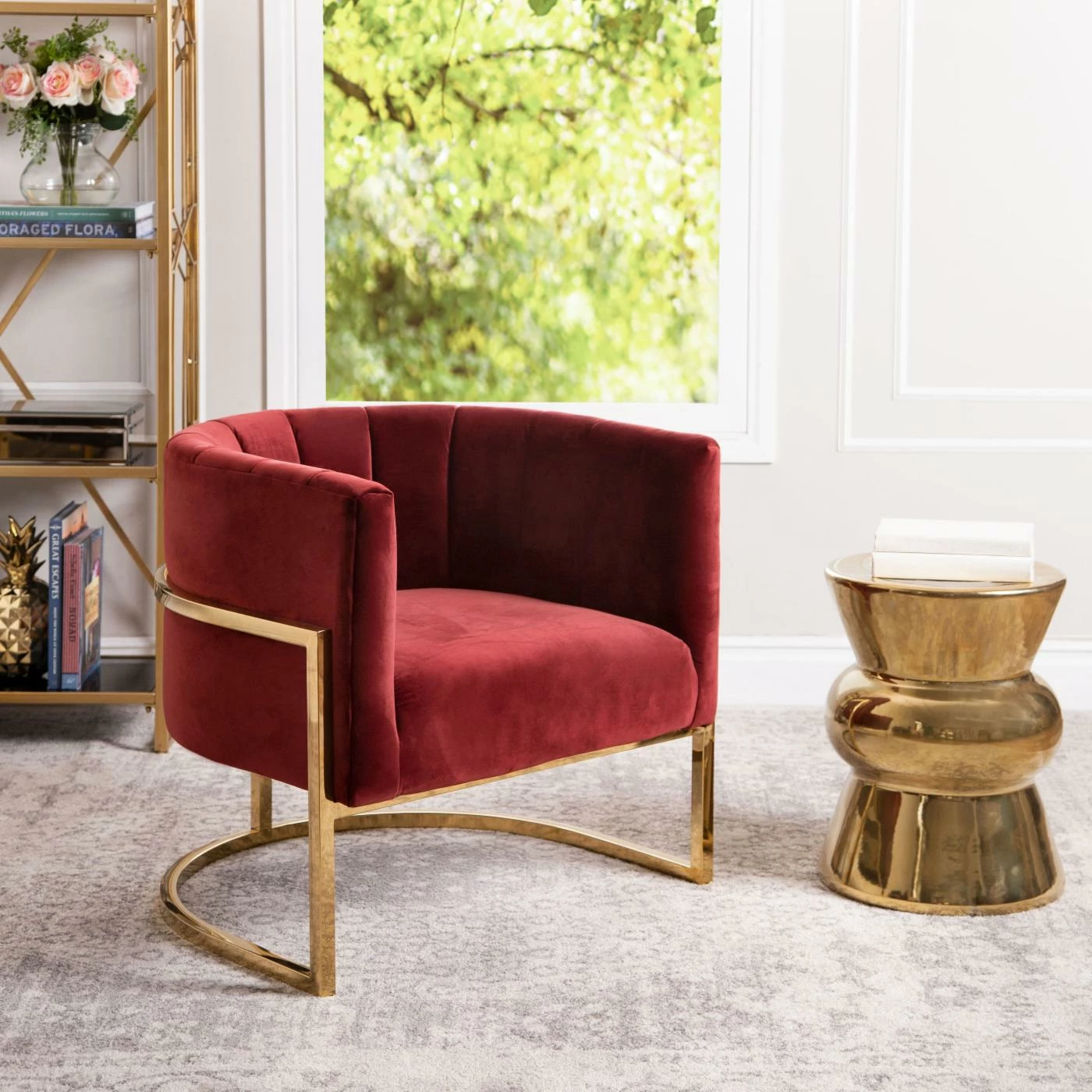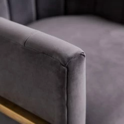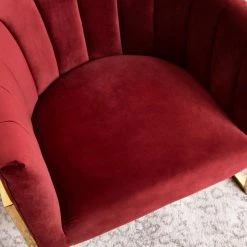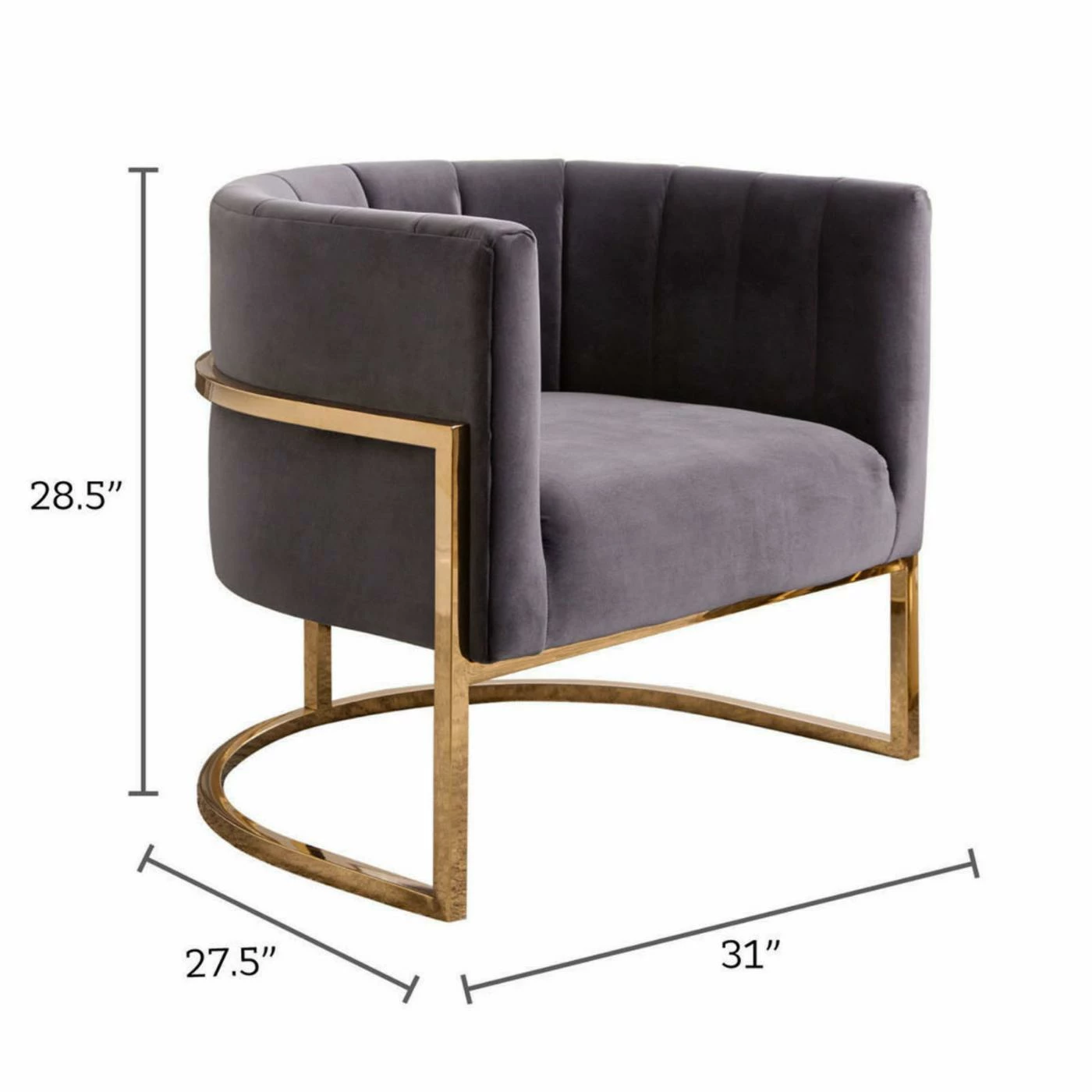 Craft a distinguished accent corner in your living room with the Abbyson Celine Barrel Arm Chair. This barrel chair is built from hardy wood with a curved base made from squared metal. A bright polished gold finish accents the base. High-density foam pads the frame, upholstered in velvet fabric with channel-tufted lines. Match the chair to your dΓ©cor by choosing among the available color options.
