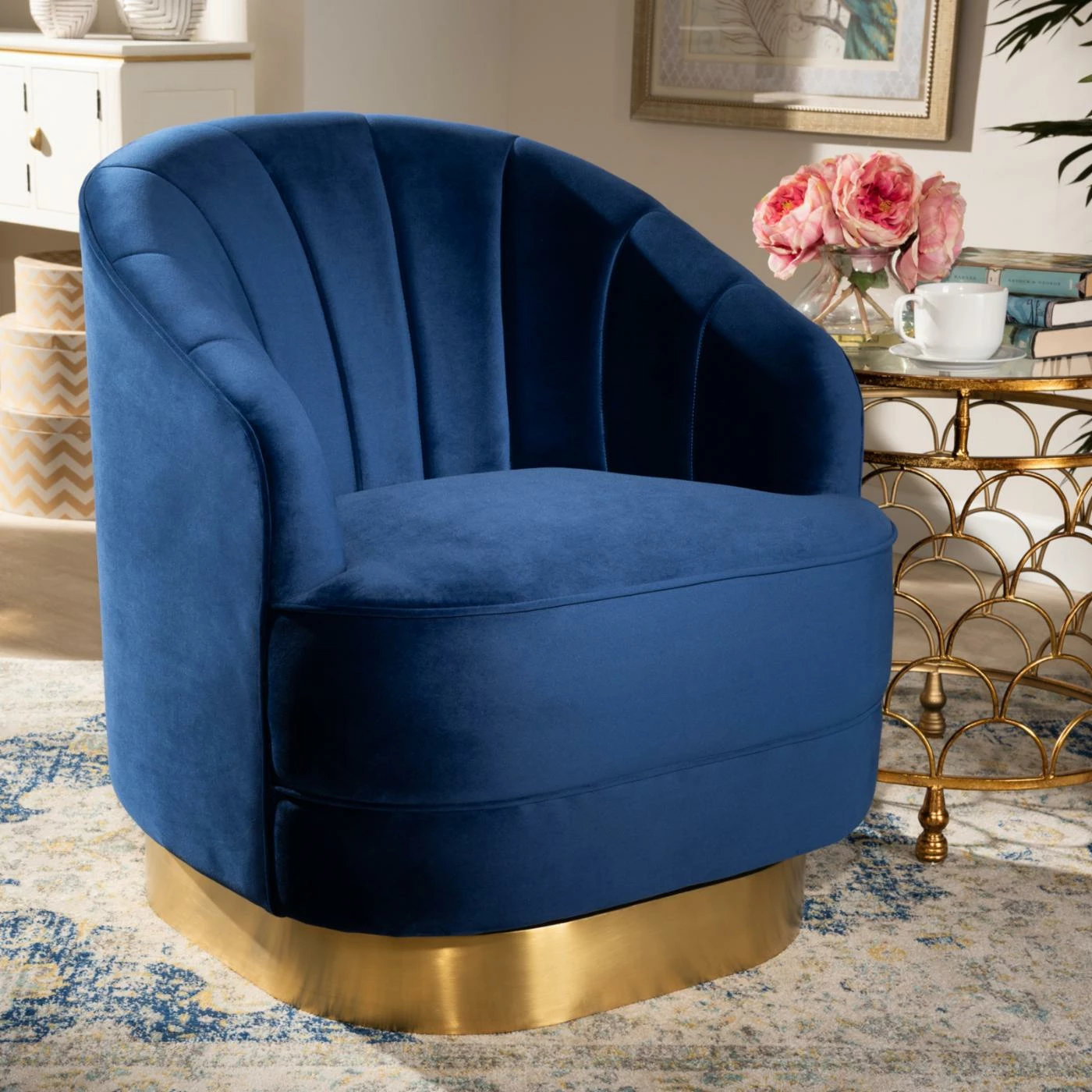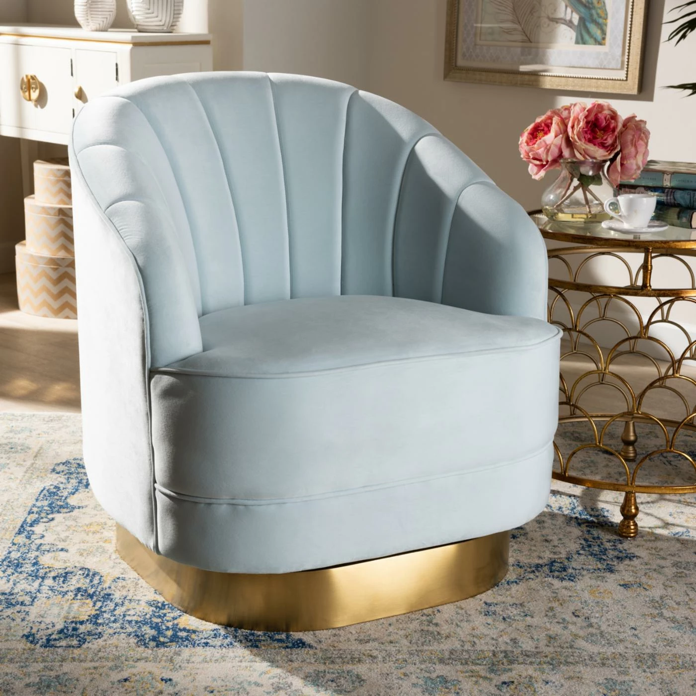 Create a seaside ambiance in your living room with the Baxton Studio Fiore Glam / Luxe Velvet Upholstered Swivel Accent Chair. This seashell-shaped chair is generously stuffed and upholstered in velvet, making it super-comfortable for lounging around. The gold-colored base contrasts beautifully with your choice from available shades of blue. This piece will be a stylish hit in your home.
