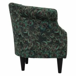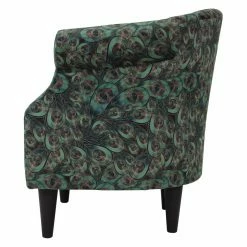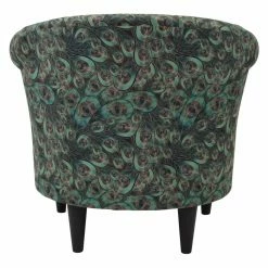 Enliven the room with this Fox Hill Nikole Peacock Print Club Chairβs mod retro vibe. This armchairβs inviting βbucketβ silhouette is clad in a captivating peacock feather print. Assemblyβs a twist β just install the tapered legs. The seat cushion lifts out for convenient cleaning. Made in the USA.