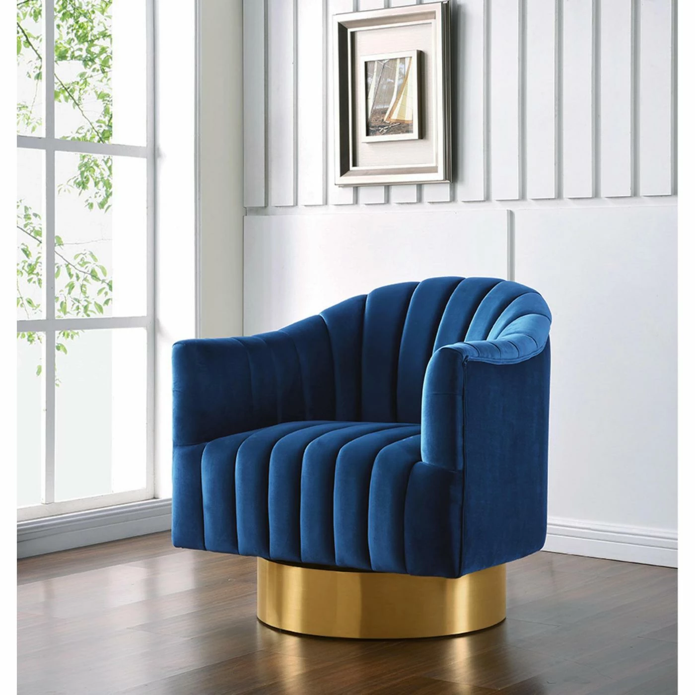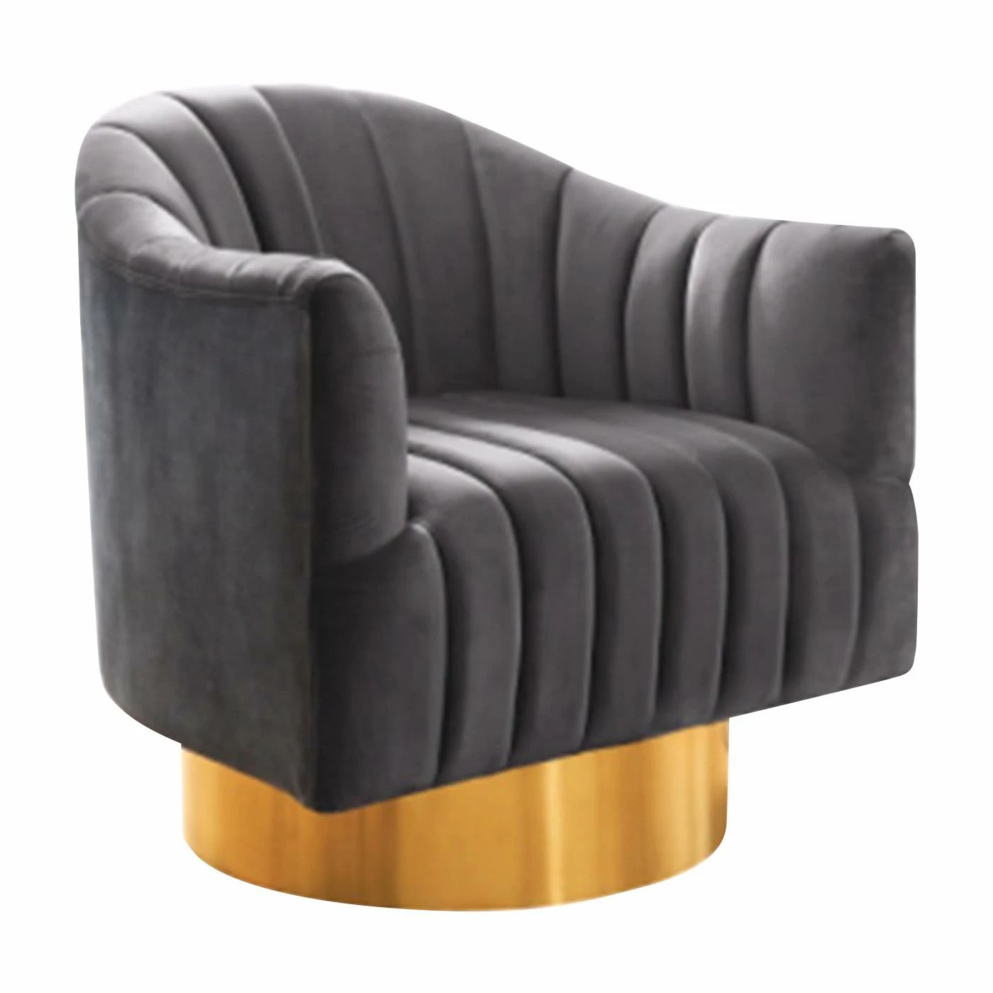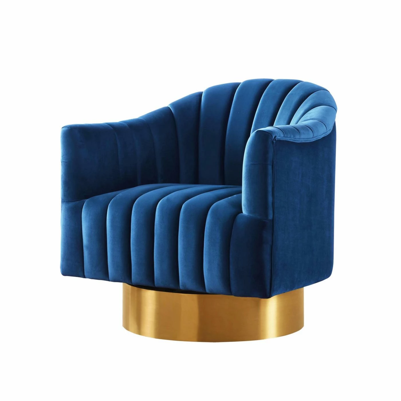 Settle into the luxuriously comfy feel of the Hi-Line Gift Ltd. Velvet Chair with Gold Swivel Base. This chair’s bold, contemporary look is complemented by a sleek, swiveling base and an oversized, barrel design. A plush, padded seat is wrapped in ultra-soft velvet material in your choice of available colors. A gold, circular base supports this chair’s deep vertical channeling and an elegant topstitch detailing along the seams. Add your choice of throw pillow or other accessories (not included) to customize this modern accent.