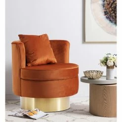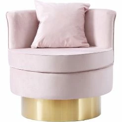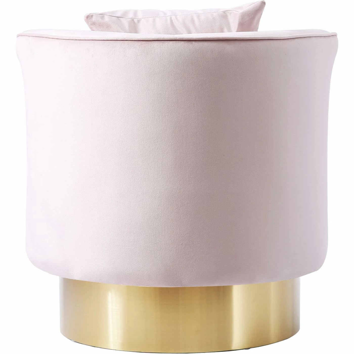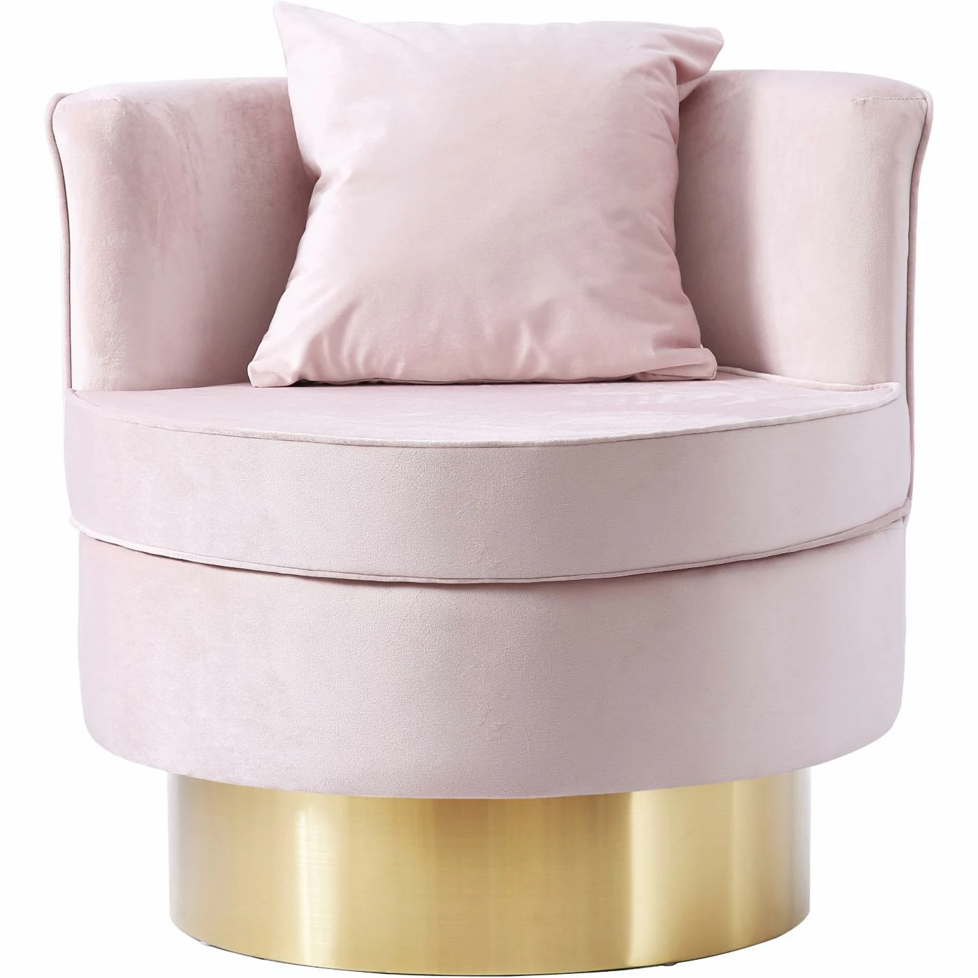 A gold-finished steel column base adds glamour to the Meridian Furniture Inc Kendra Upholstered Accent Barrel Chair. For easy conversations, this barrel chair swivels smoothly. Its comfortably curved backrest and shaped seat are upholstered in your choice of available velvet color. A matching velvet accent pillow adds a polished finishing touch.