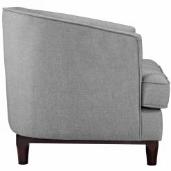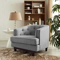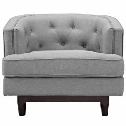 The classic barrel shape of the Modway Coast Armchair is detailed by deep button tufting and smart piping trim. This armchair is upholstered in easy-care polyester customized by your choice of color. Dense foam cushioning offers supreme comfort. Walnut-stained rubberwood legs and base rail enhance the sophisticated look of this armchair.