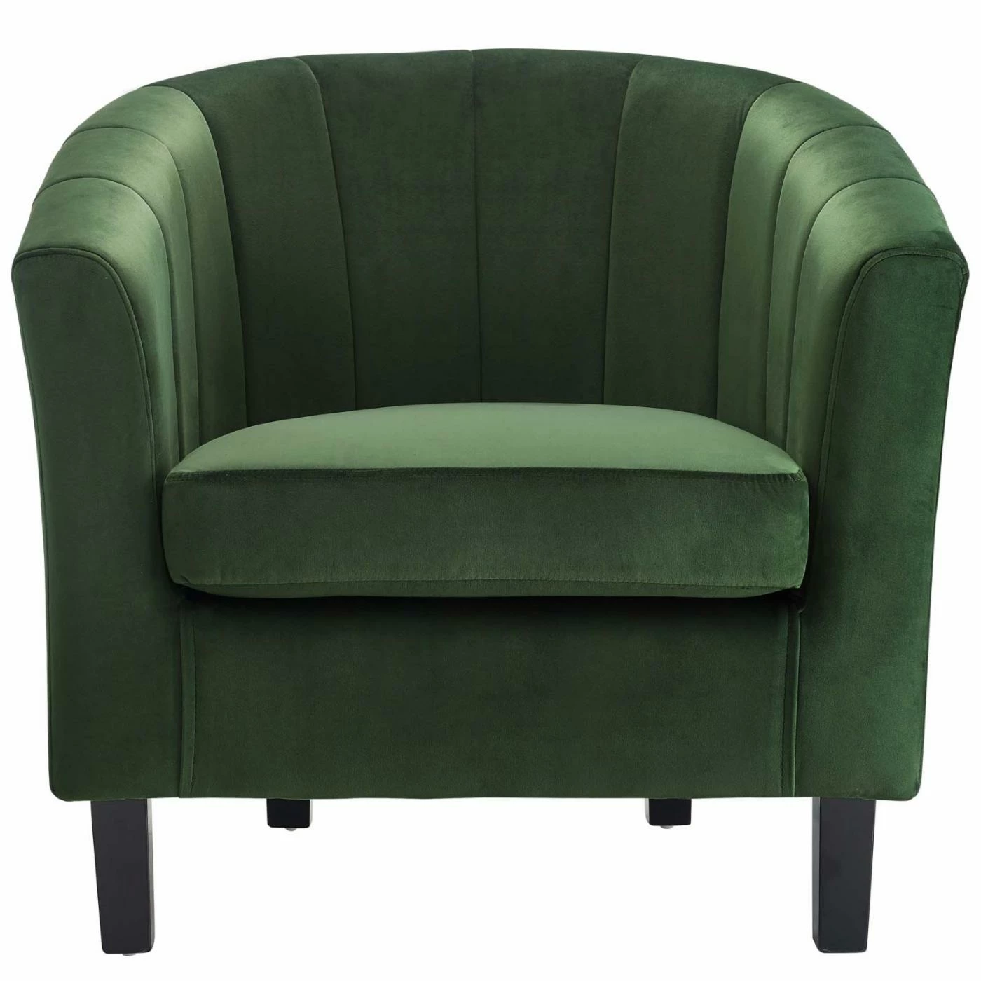 Take a seat on the Modway Prospect Channel Tufted Upholstered Velvet Arm Chair and transport to the glamorous past. Subtle channel tufting is featured on the U-shaped back and arms of this accent chair. Stain-resistant velvet polyester upholstery, in your choice of available color, covers the pinewood and plywood frame. The removable seat is foam padded for comfort. The black straight legs complete the design of this arm chair.
