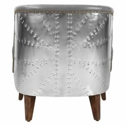 Ivory-tower style meets DIY edginess in the Moes Home Collection Cambridge Club Chair. At different times, British fashion has embodied both classical formalism and visceral emotion, shown here in the nailhead-accented top-grain leather and hardwood legs juxtaposed against the airplane aluminum wrapping. The riveted design on the back is laid out in a subtle union jack pattern. The high-quality design and complementary pairing of these styles makes this chair a suitable showpiece in any dΓ©cor.
