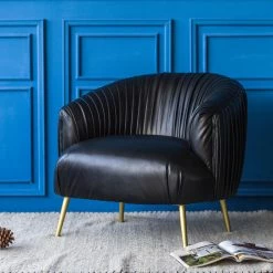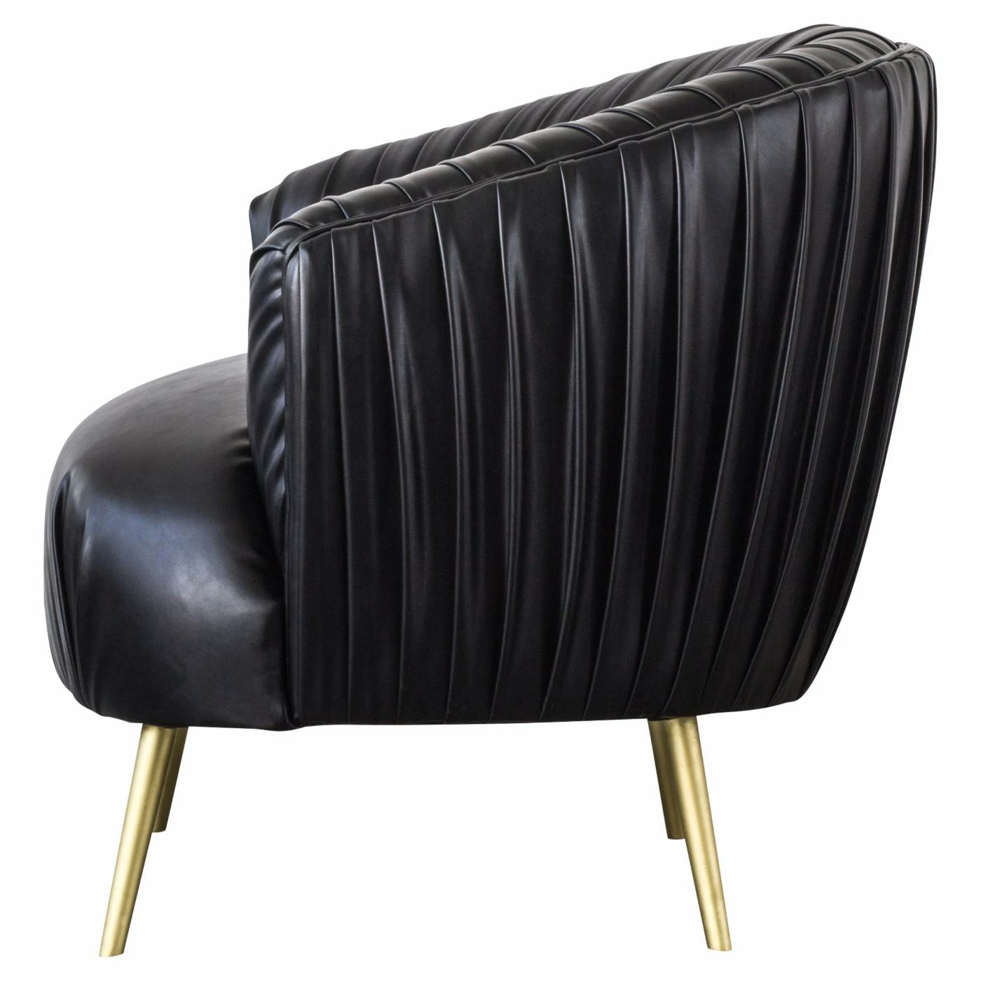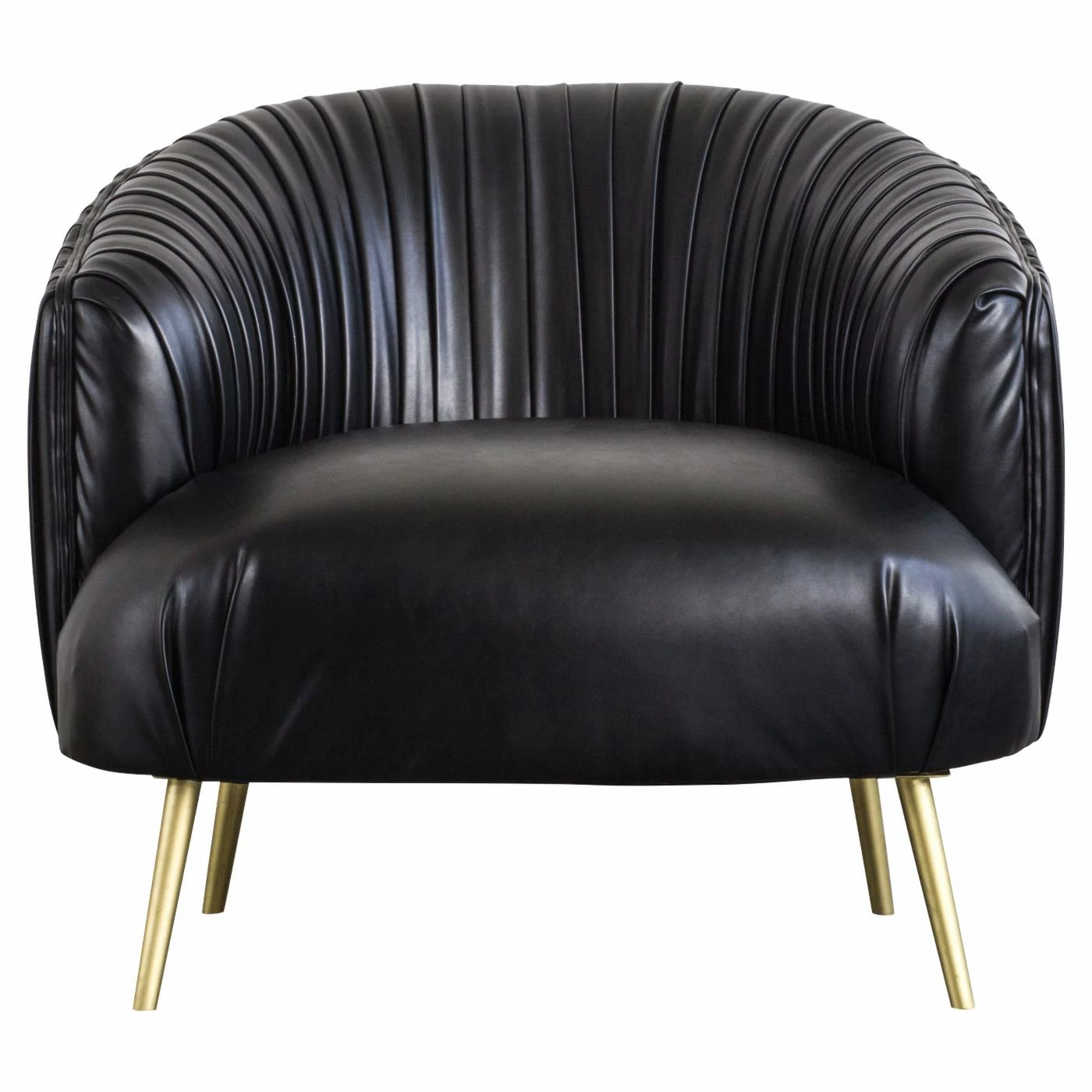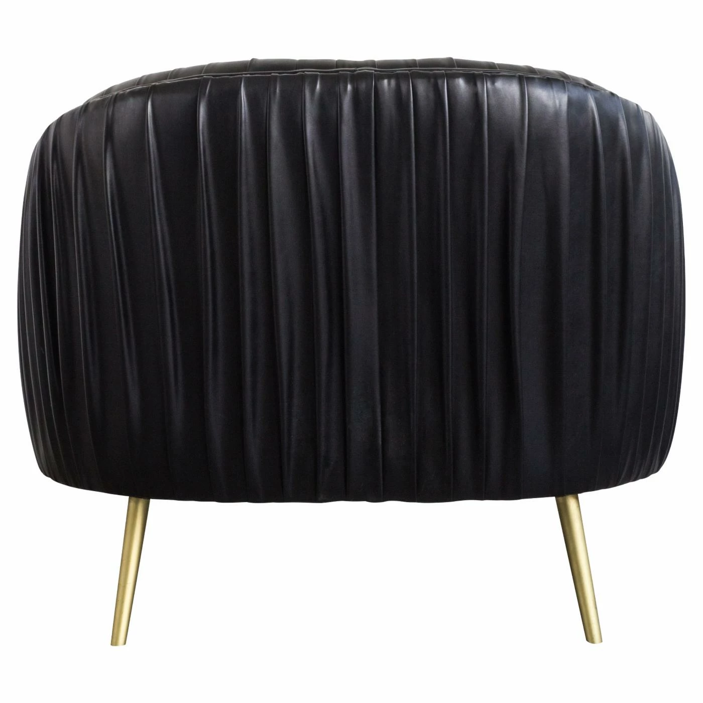 A dramatically pleated barrel back and overstuffed seat make the New Pacific Direct Inc Anna Upholstered Pleated Accent Chair a visual art statement that’s also ultra comfortable. This accent chair is upholstered in treasure black faux leather paired with gold-finished metal legs. It’s sure to be the focal point of any room.