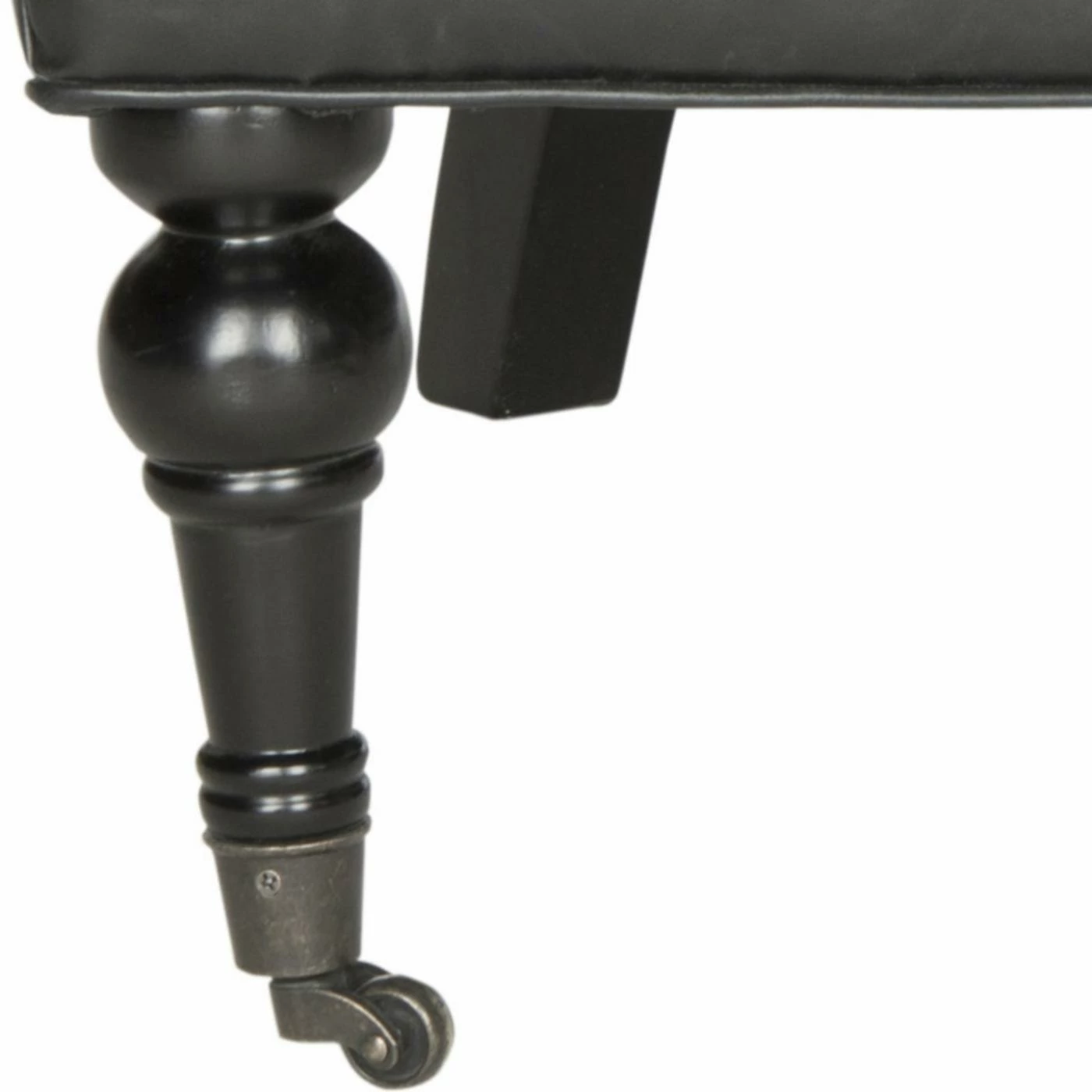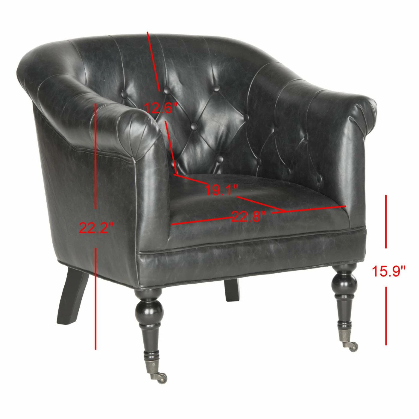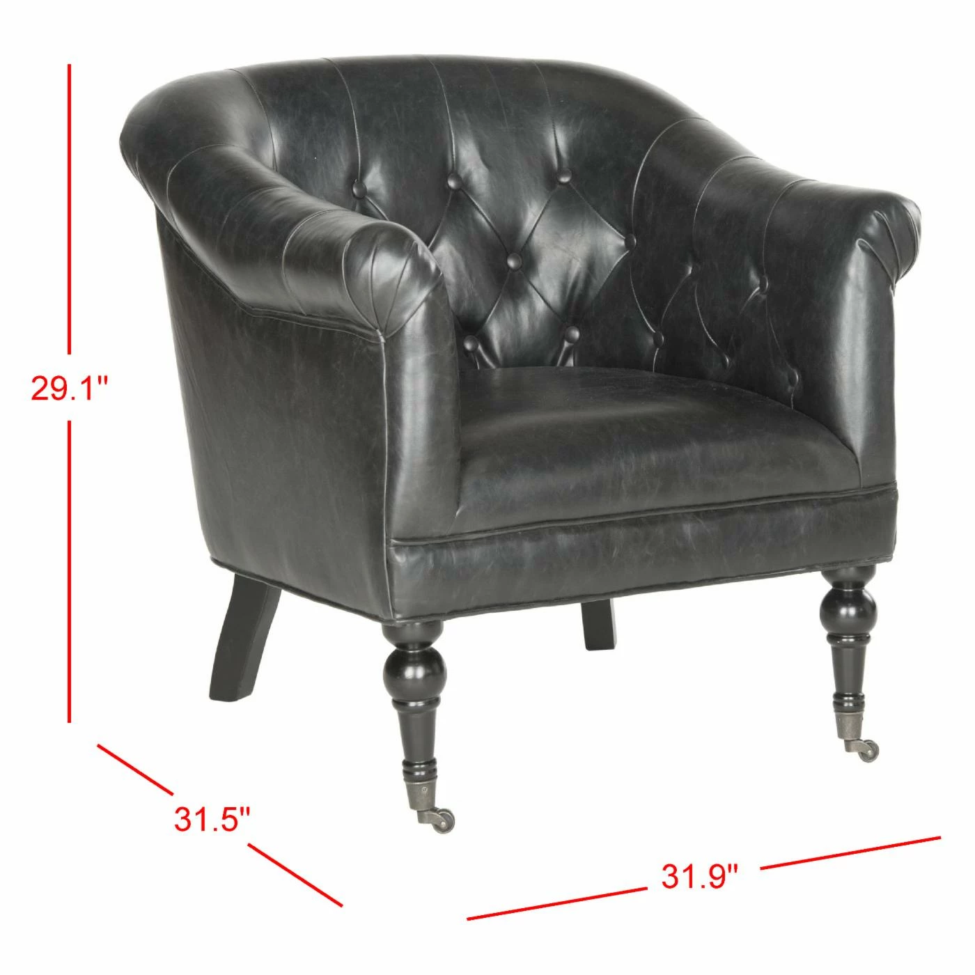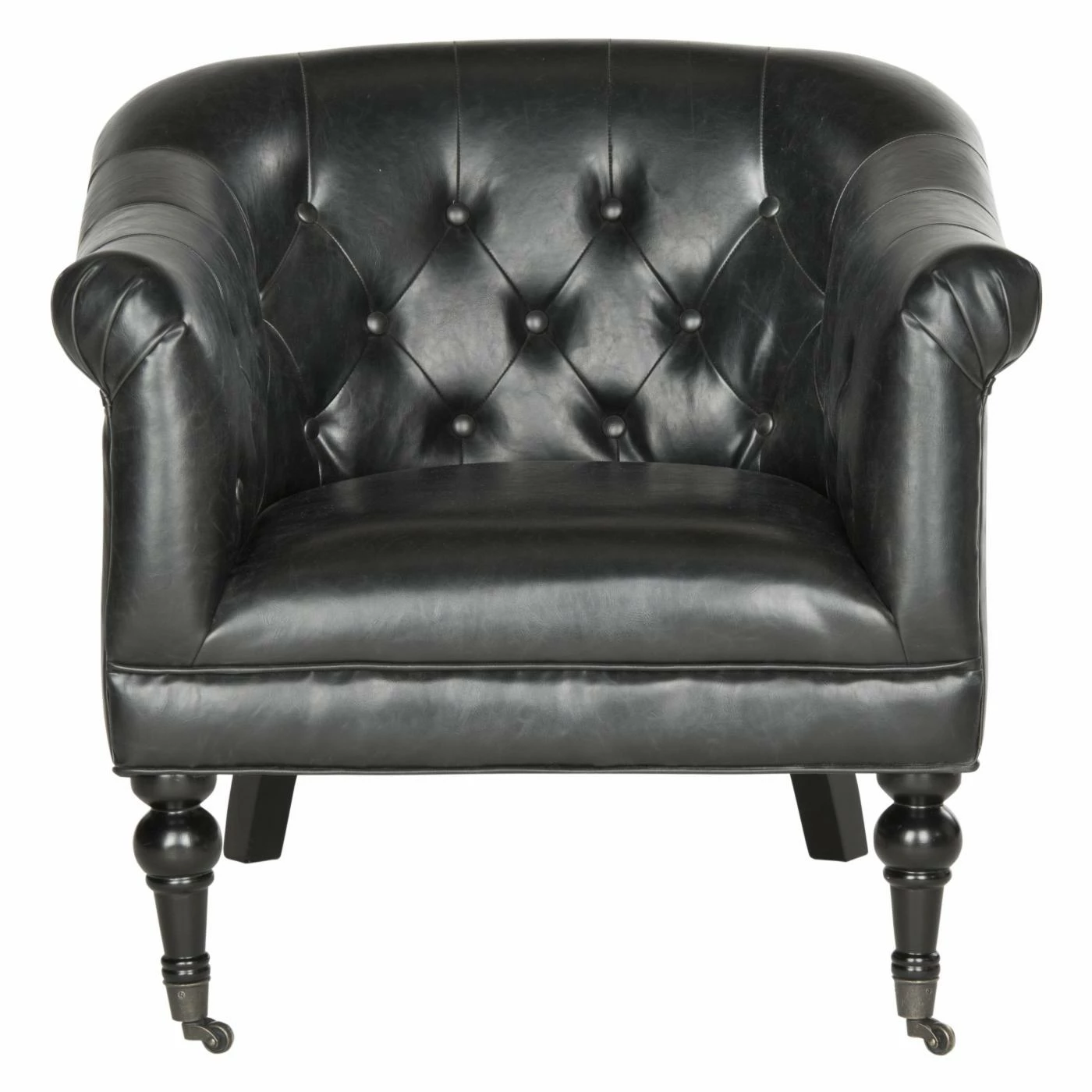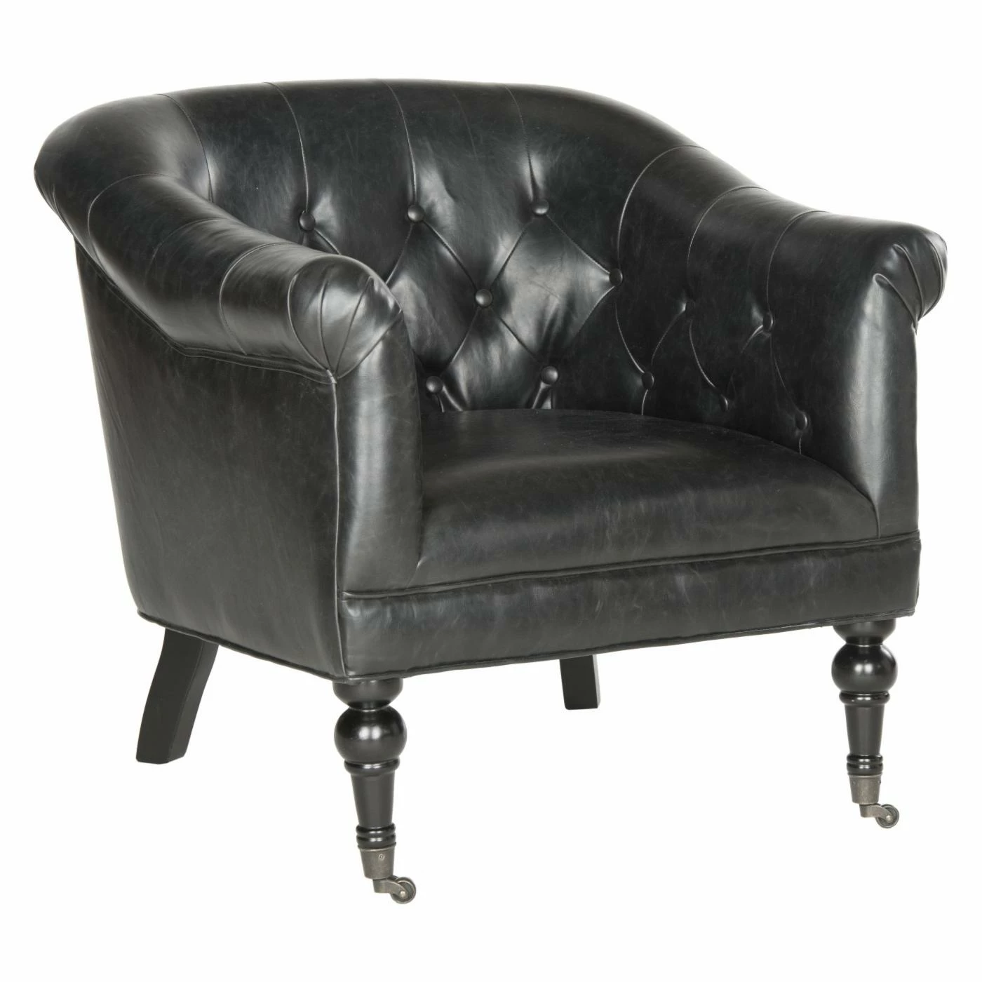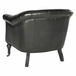 The richly appointed Safavieh Nicolas Tufted Club Chair will be the go-to seat in your living space, library, or boudoir. Draped and rolled arms, a rolled back, and interior button tufting give this club chair its chic profile. It’s dressed to impress in antique black bi-cast leather and sits on turned, birch wood legs that end in metal casters.