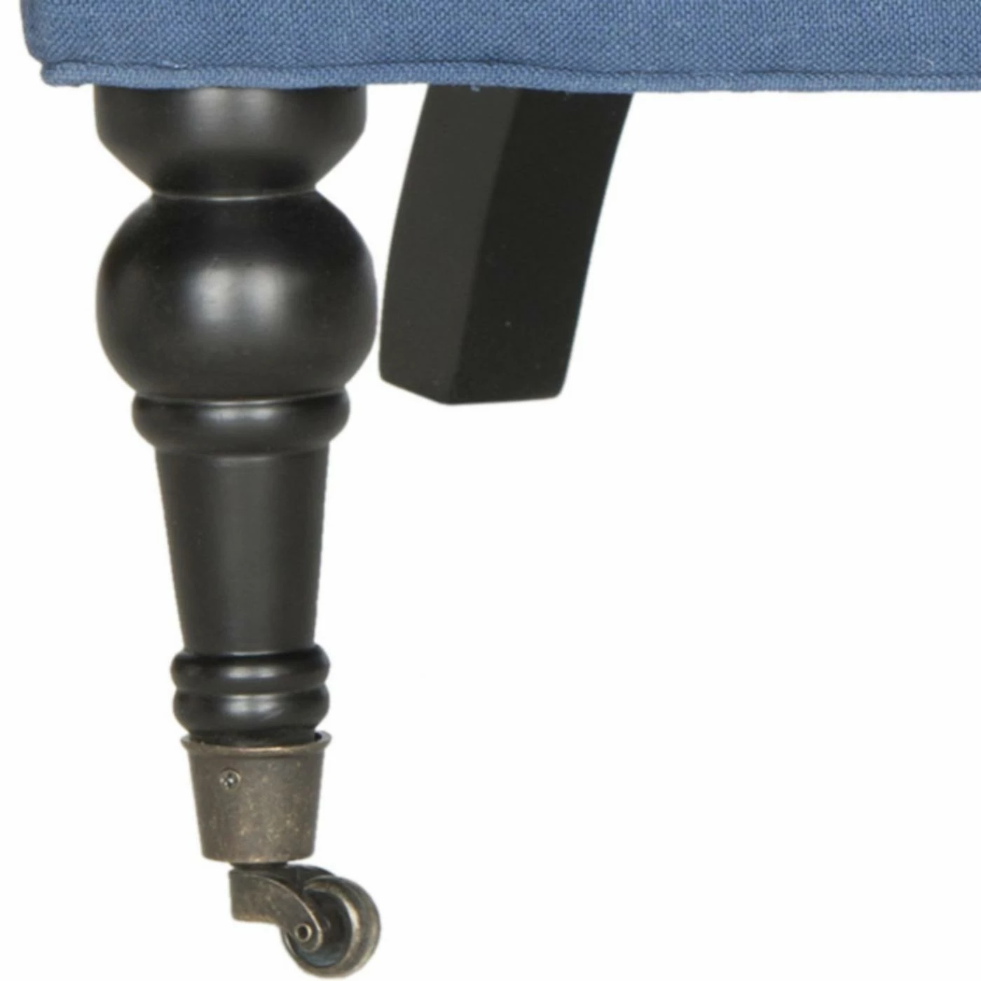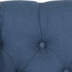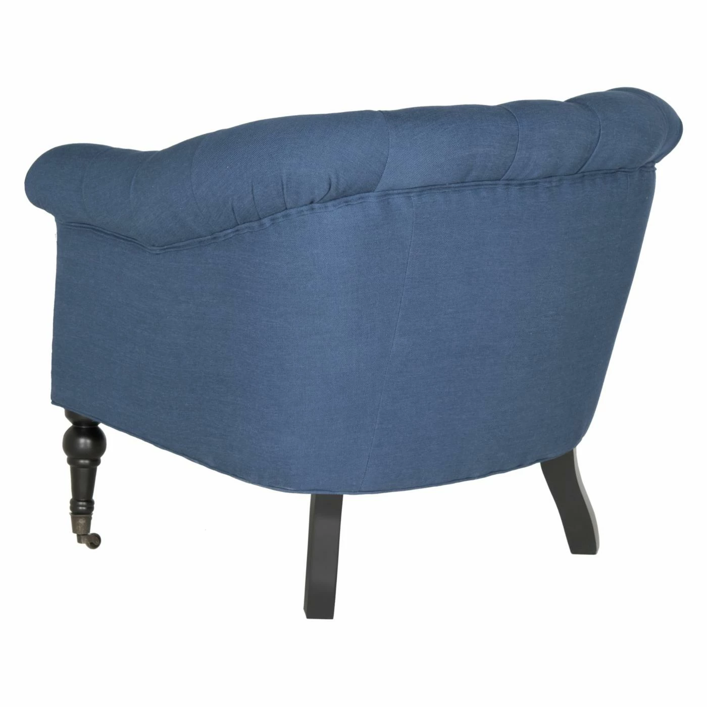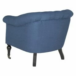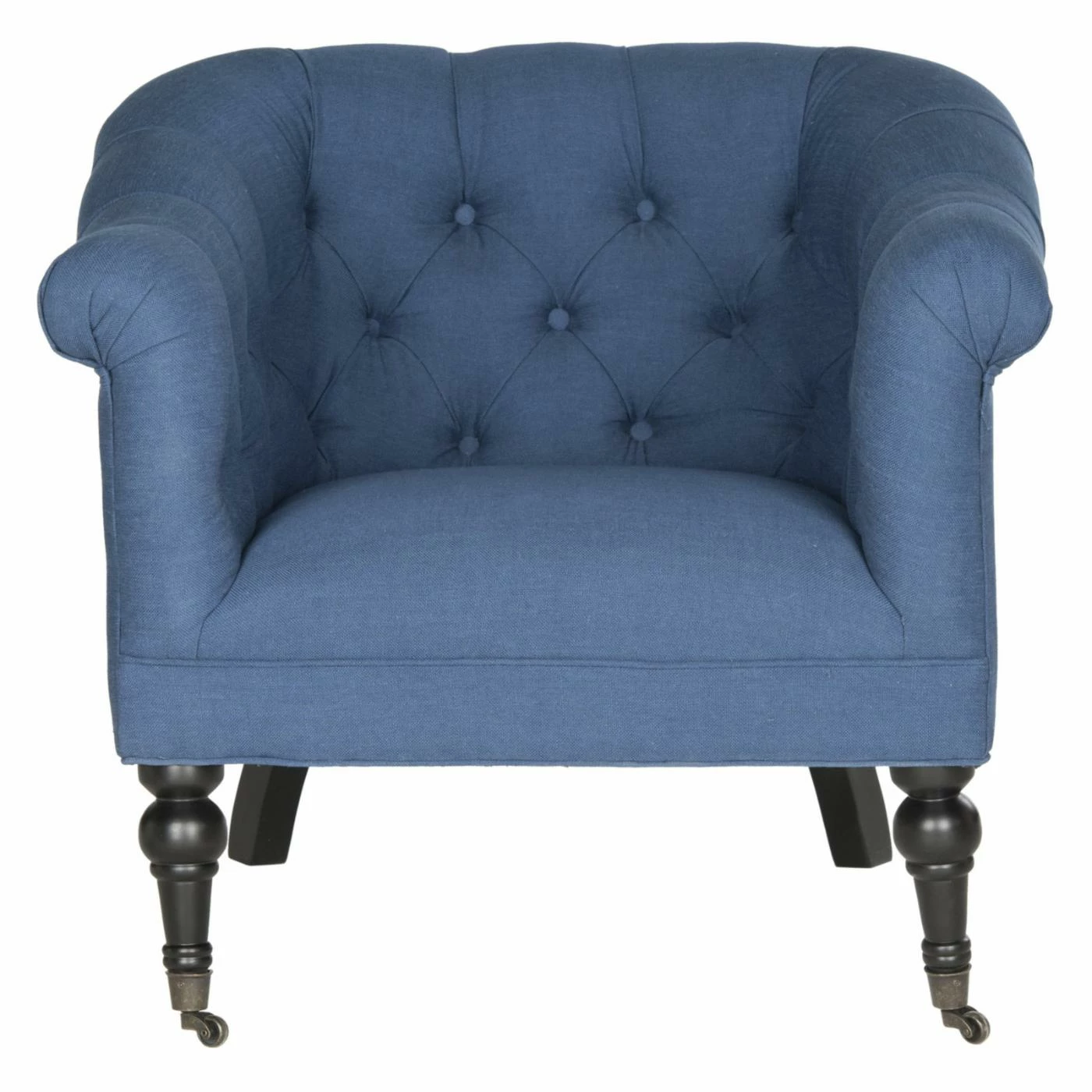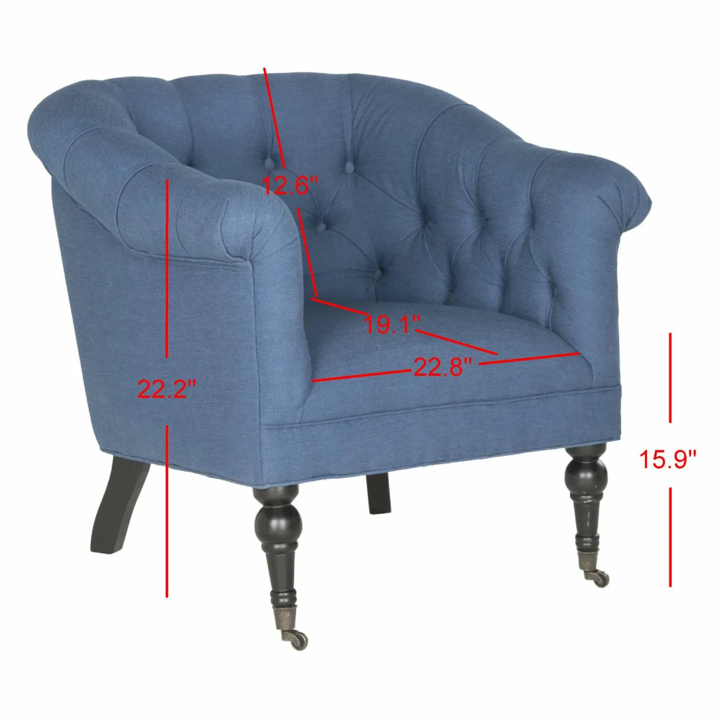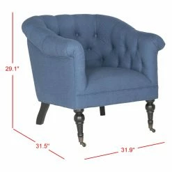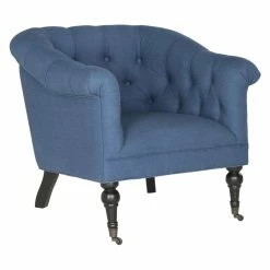 Graciously inviting and classically appointed, the Safavieh Nicolas Tufted Fabric Club Chair is sure to upgrade your sitting area, den, or boudoir. Draped and rolled arms, a rolled back, and interior button tufting give this club chair its chic silhouette. It’s dressed in neutral blue fabric and sits on turned birch wood legs that end in metal casters.