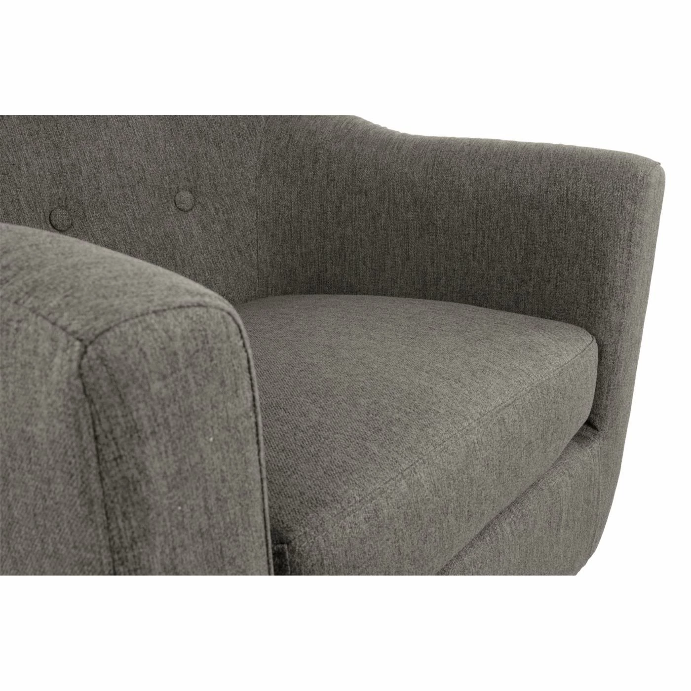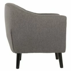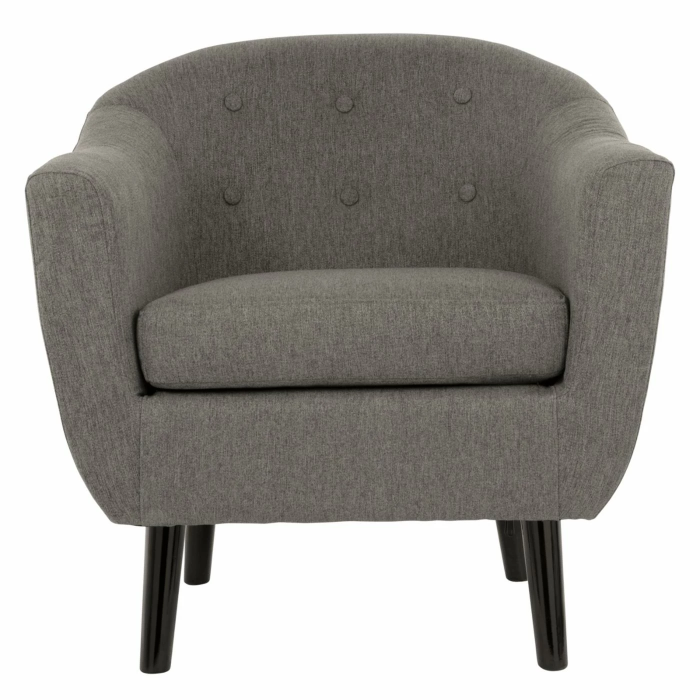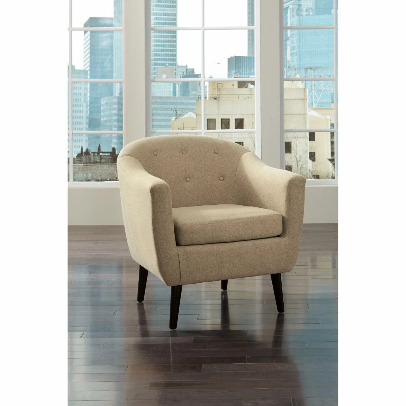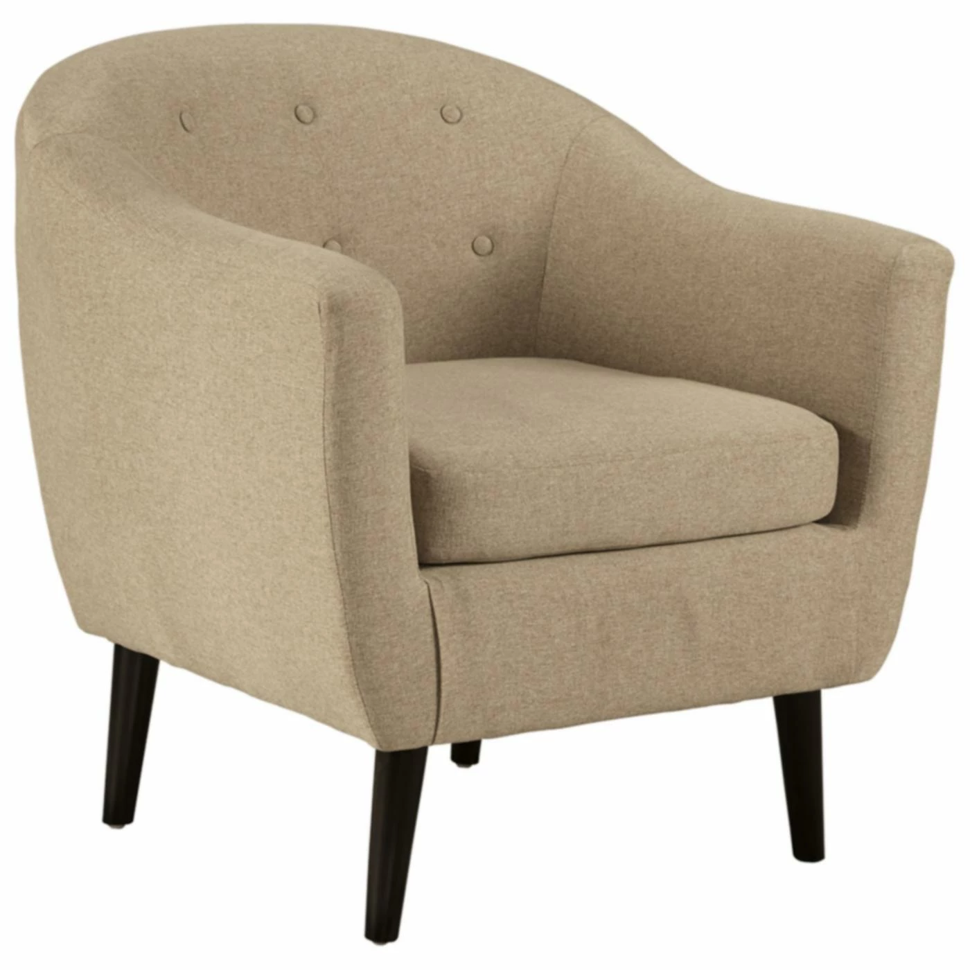 Bring mid-century style to your home with the well-designed Signature Design by Ashley Klorey Accent Chair. The chic barrel shape is complemented by a textured polyester fabric. A button-tufted back and loose seat cushion add welcome detail, while the tapered exposed legs with faux-wood finish provides contrast. Choose from available colors.
