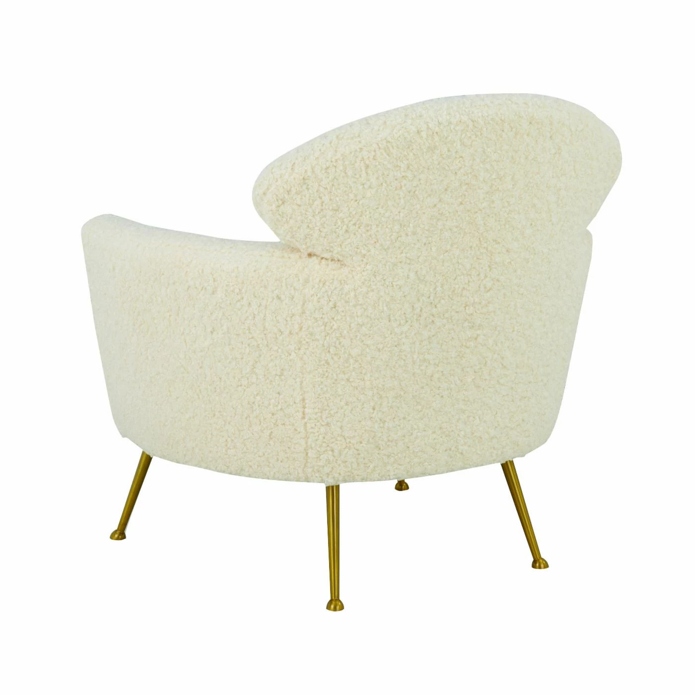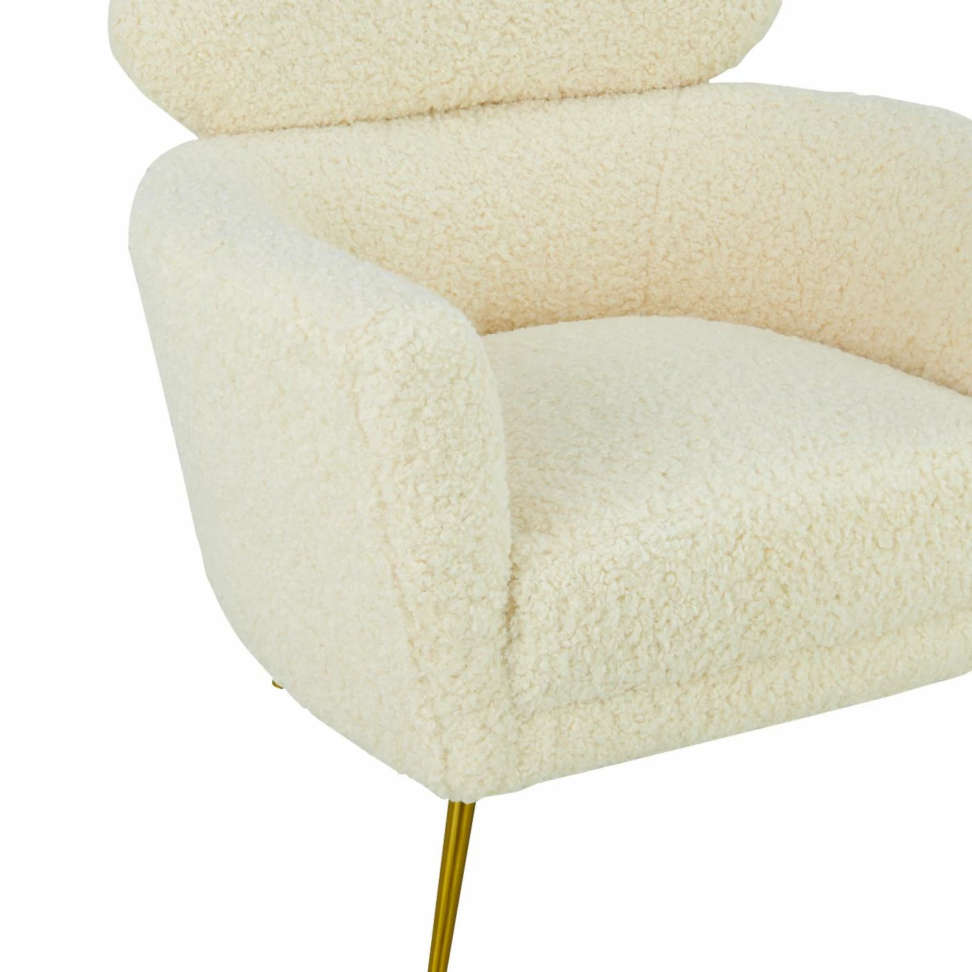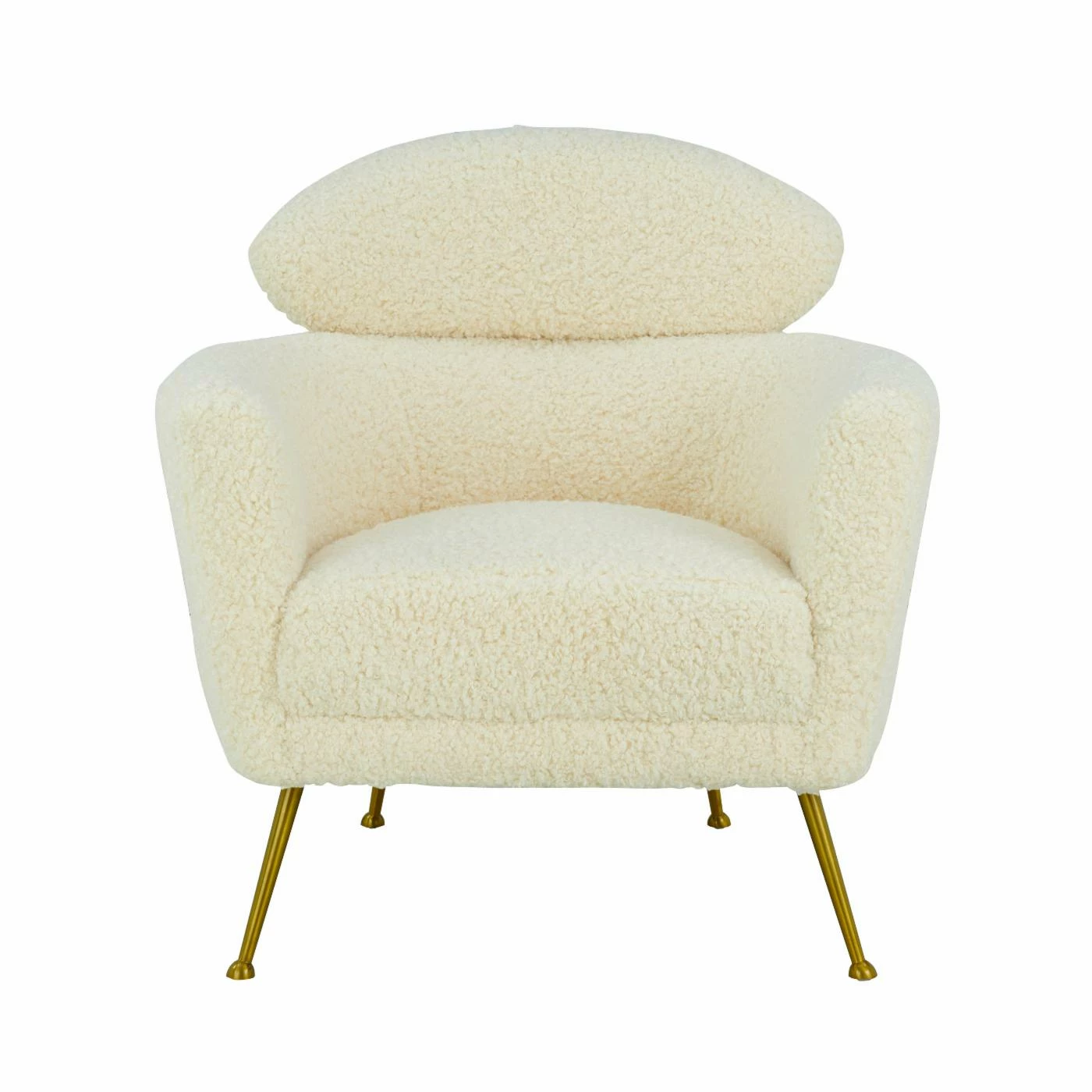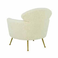 Sink into the TOV Furniture Welsh Barrel Accent Chair and lean your head on the curved headrest. This barrel seat accent chair has a kiln dried wood frame that is upholstered with fluffy fabric upholstery in a neutral beige color. The stainless steel legs are finished in a matte gold and have small round feet.