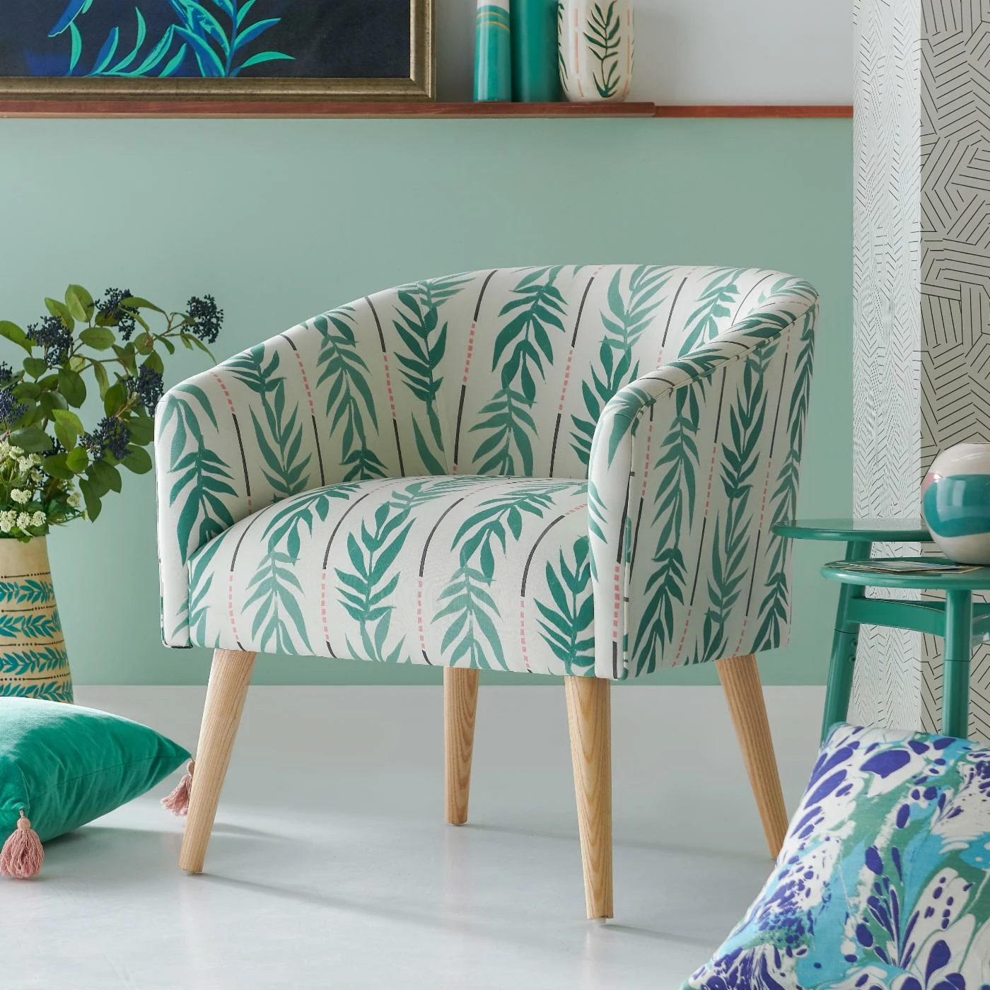 You’ll feel like you’re lounging oceanside every day with the fresh and breezy Vintage Palm Barrel Accent Chair by Drew Barrymore Flower Home. This barrel-shaped chair’s exclusive Vintage Palm print gives a fun, tropical feel that can be easily paired with a loveseat or sofa to create a bright, relaxed sitting space. With a cushiony polyester fill and a smooth 55% cotton and 45% linen finish, it’ll be love at first sit with this warm, cozy accent chair. Strong, tapered legs angle outward in a light, natural-looking wood finish for the cherry on top of this seat-sundae. Complete your home’s vintage vibes with other items from Drew Barrymore Flower Home.