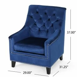 Finish off your seating area with the Jaclyn Velvet Tufted Club Chair for a bold pop of color. The sumptuous polyester velvet fabric is a deep navy blue color that draws the eye. Gleaming chromed nail heads and diamond quilt button tufting enhance the elegance of the overall design. For a mod finishing touch, the chair is supported by birch wood block feet.