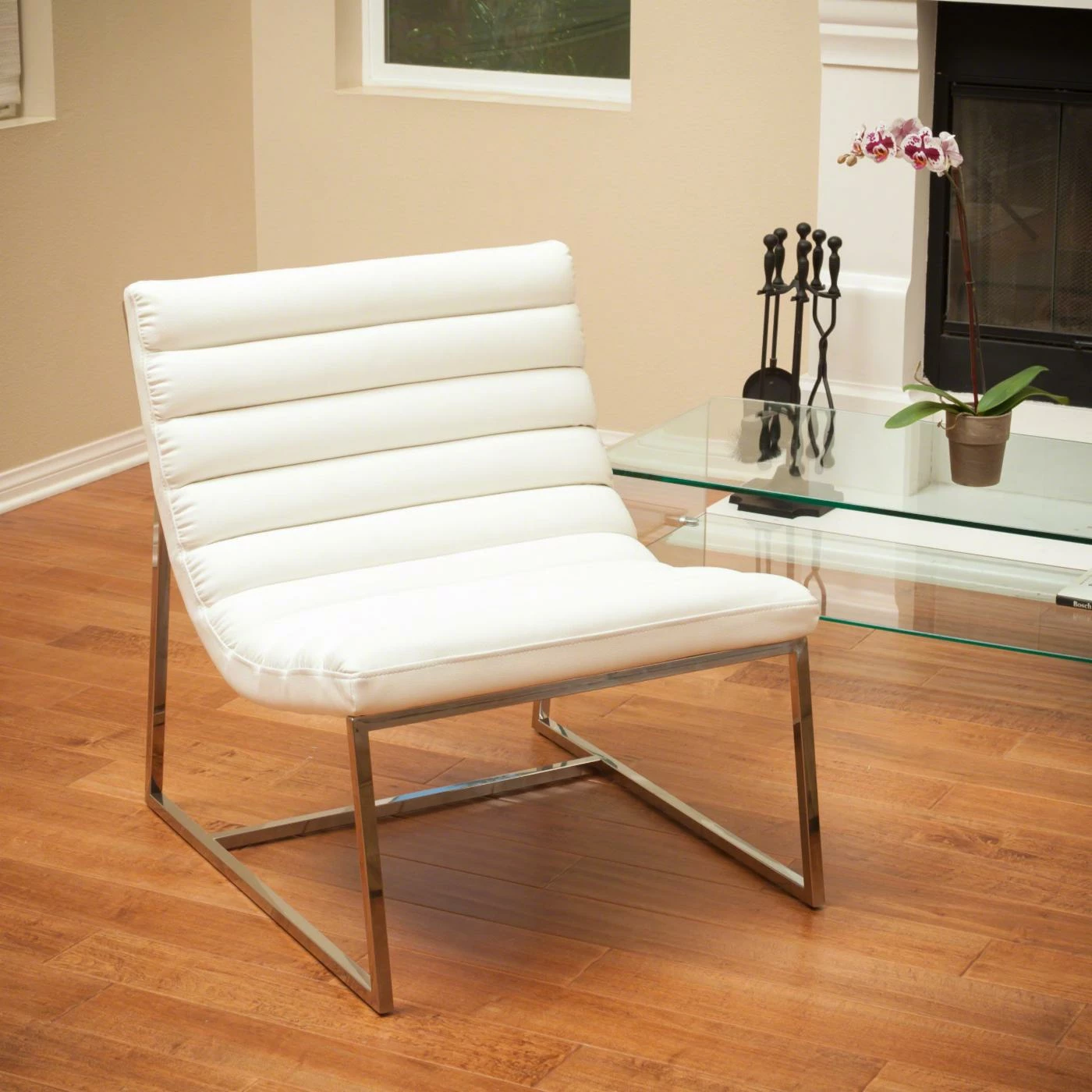 - Modern mix of white leather and polished steel