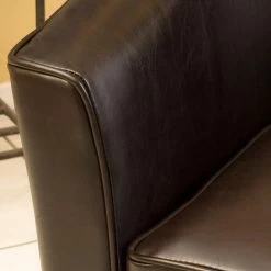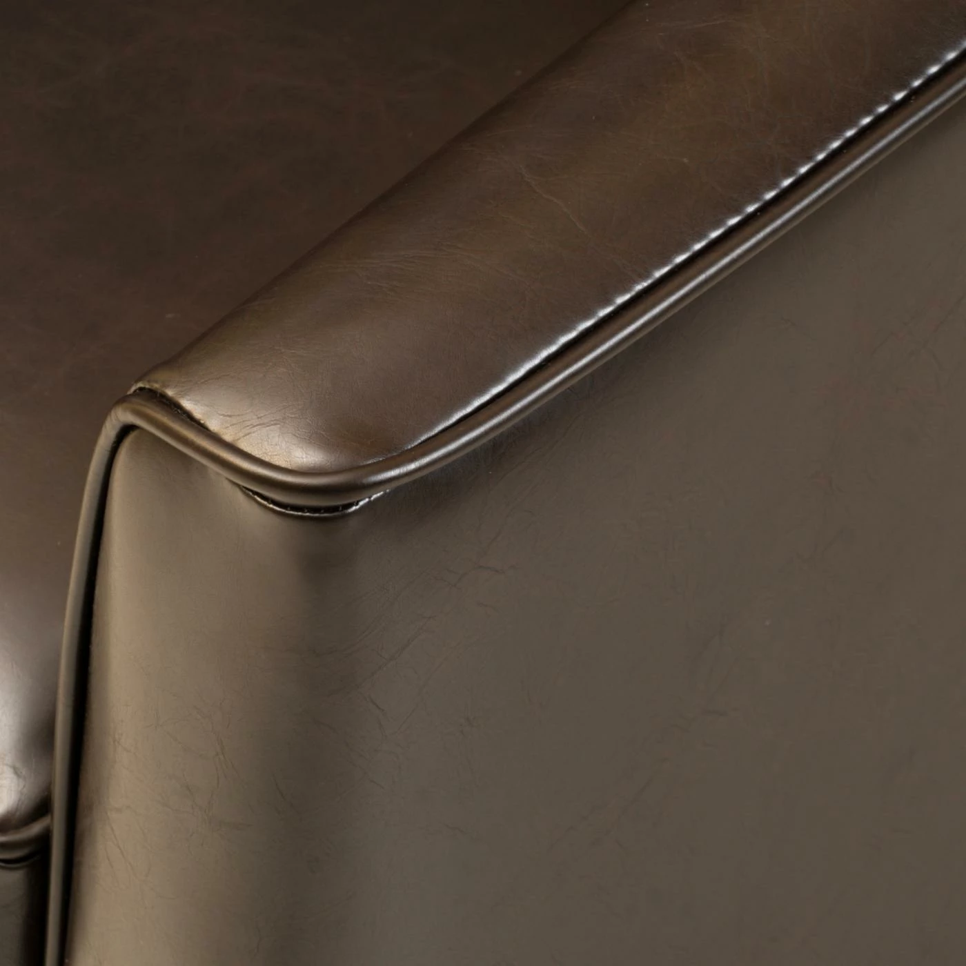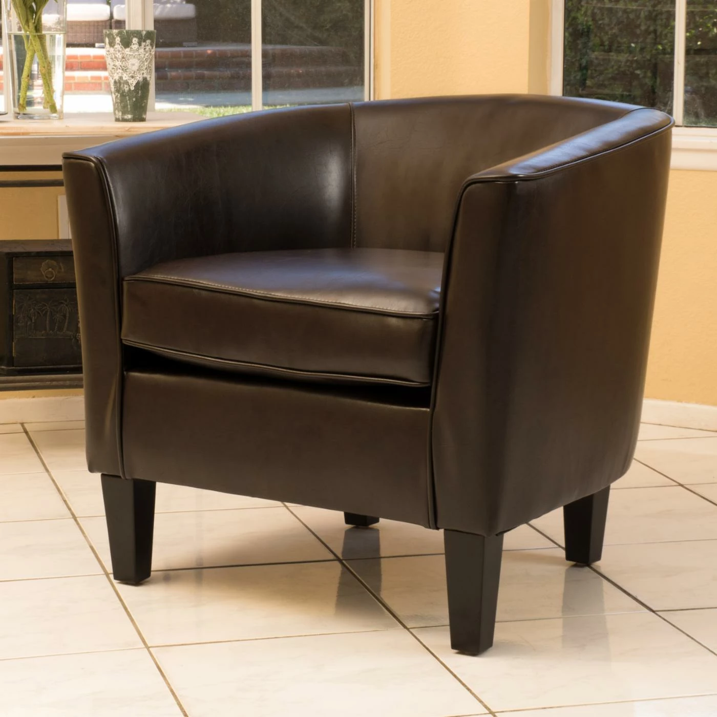 The Jess Barrel Chair brings a luxurious richness to your home with its gorgeous faux leather upholstery finished in a deep, dark brown color. This soft rounded-back chair sits on four solid wooden legs for added stability. The curved shape and padded seat cradle you in comfort, creating a cozy spot to read your favorite novel or watch a film.