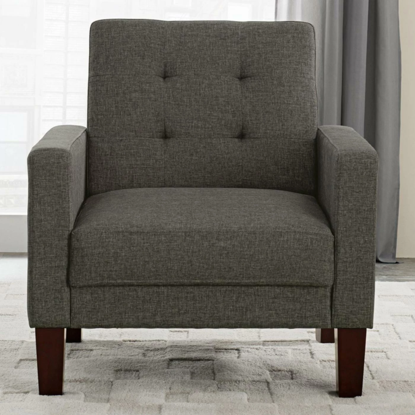 The refined Better Homes & Gardens Porter Upholstered Chair features track arms, tufted details on its seat back, and sits on tapered wood block legs. This chair is graced with linen upholstery in your choice of available color.