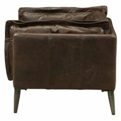 Upgrade seating in your industrial or aviation space by adding the Acme Furniture Porchester Chair into the design mix. This shelter club chair is upholstered in sumptuously soft distressed chocolate top grain leather and boasts down feather fill cushions. For added detail, its cushions feature double flange trim. For a mid-mod silhouette, this club chair sits on tapering metal dowel legs in dark bronze.