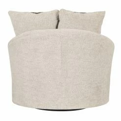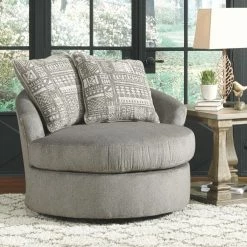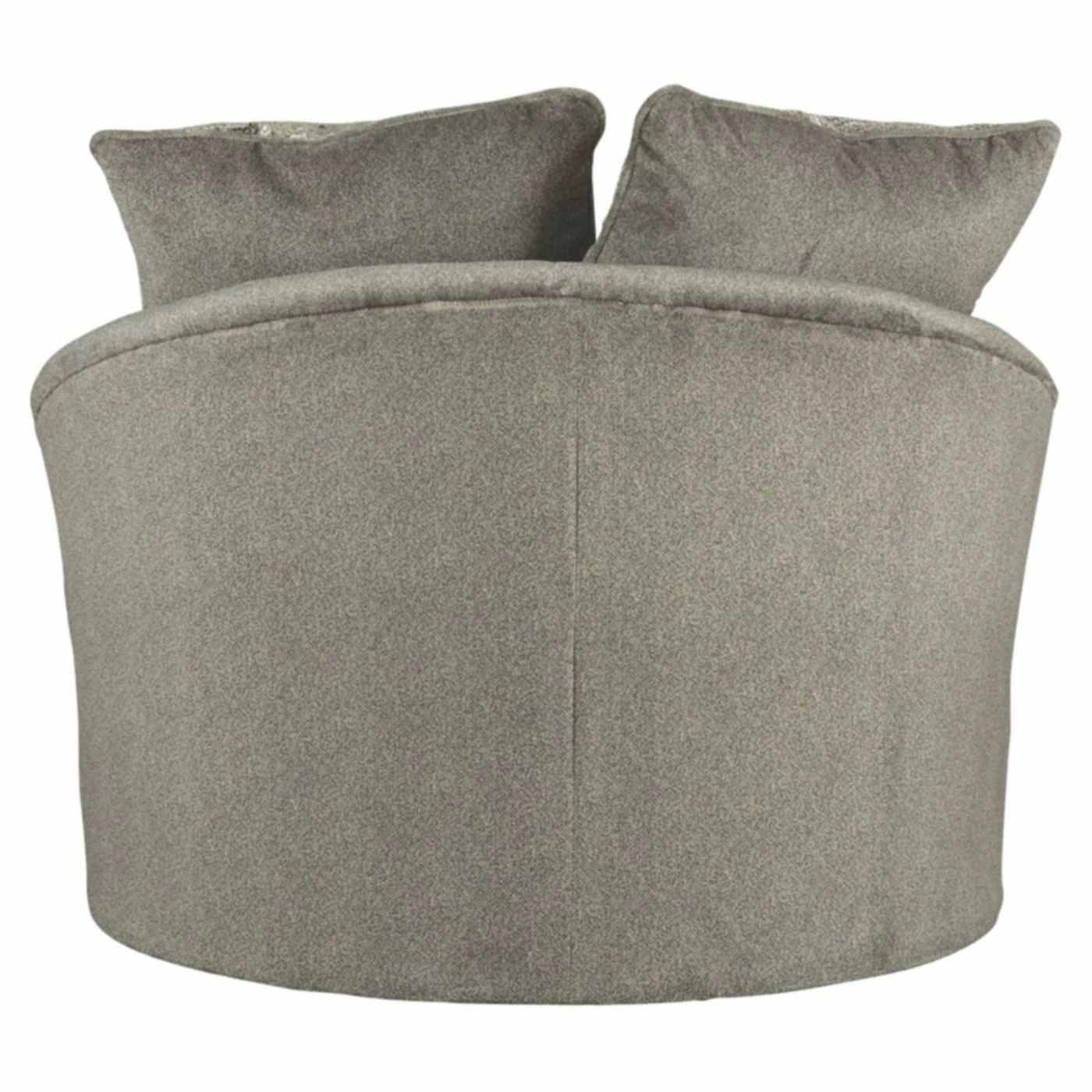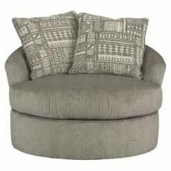 Treat yourself to the comfort and relaxation offered by the Signature Design by Ashley Soletren Accent Chair. This large, round chair features a swivel base that allows you to direct your attention where you need it. Two pattered back pillows stand out against the solid hue of the chair. A foam core provides the soft comfort needed.