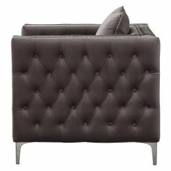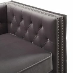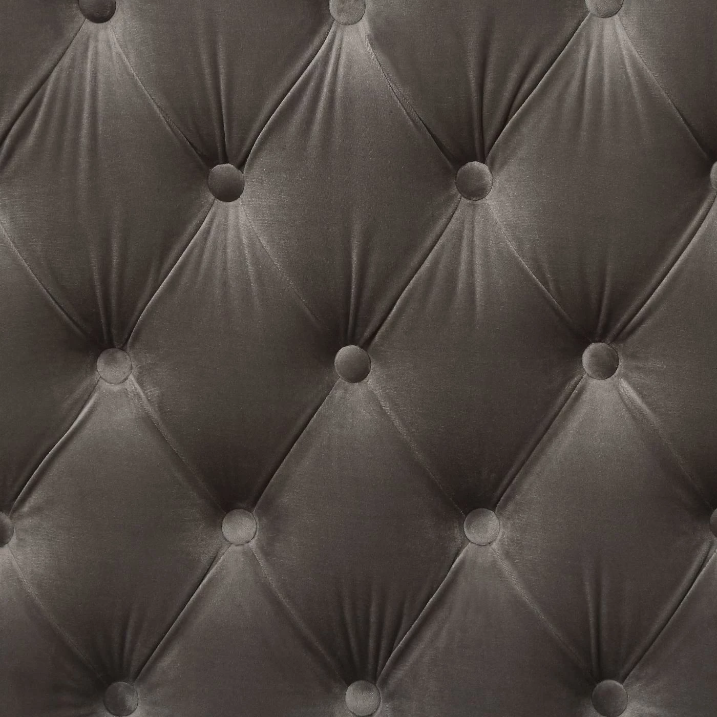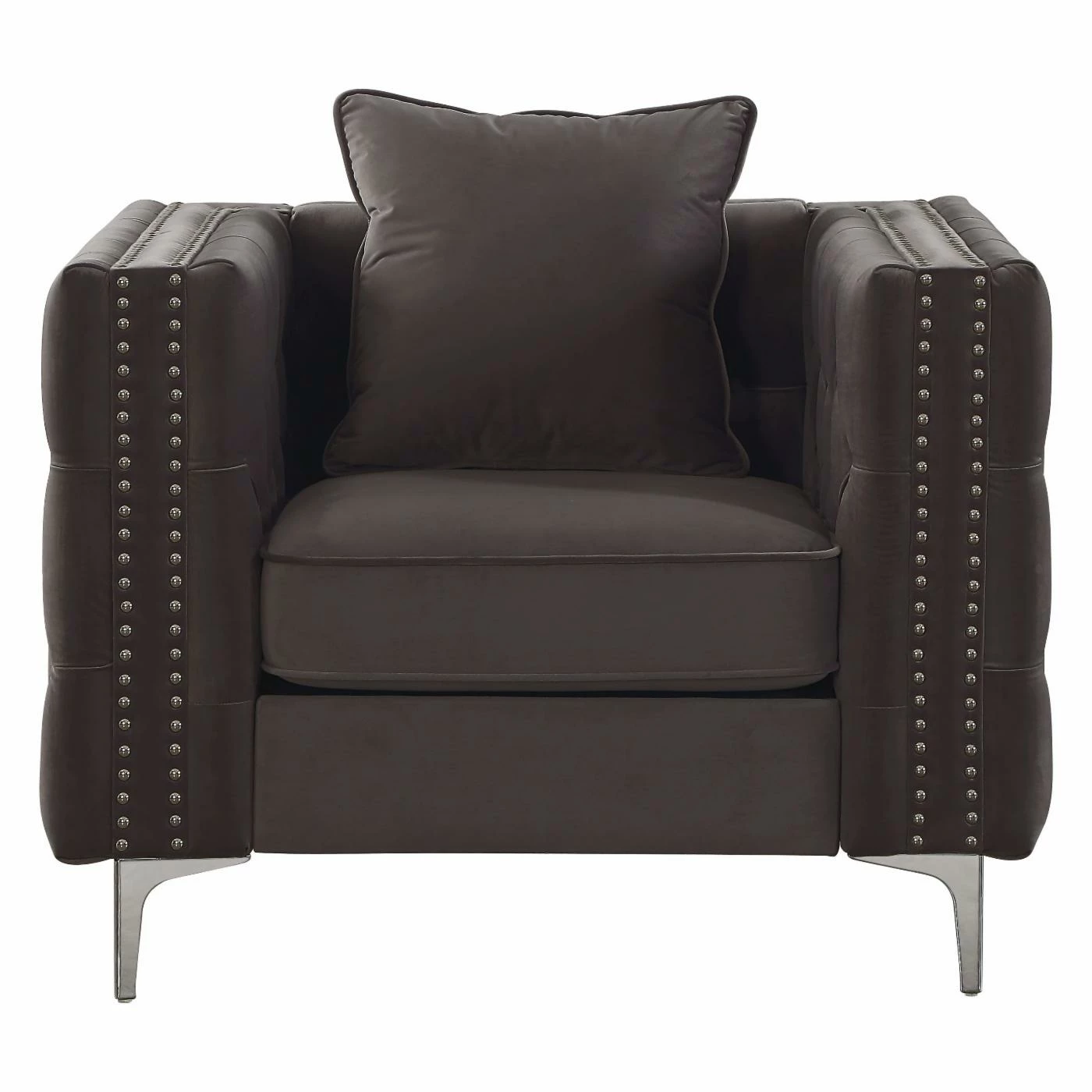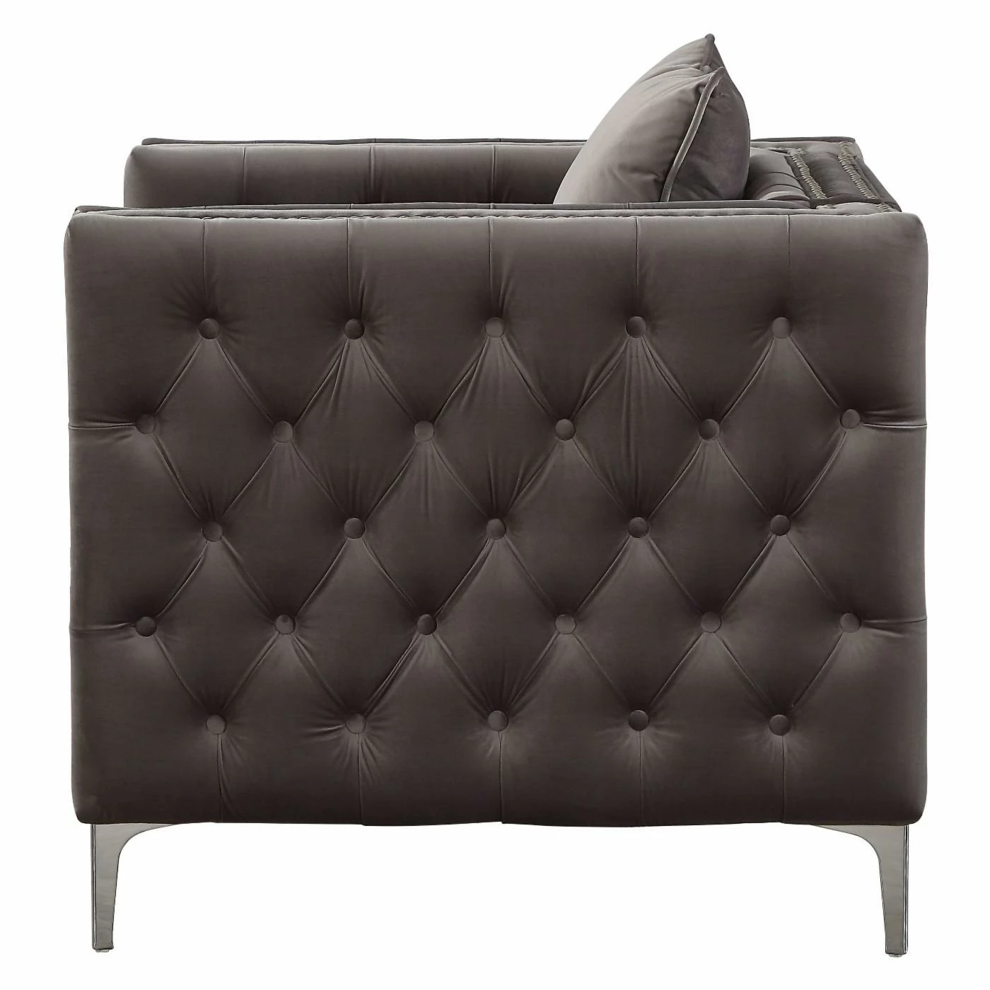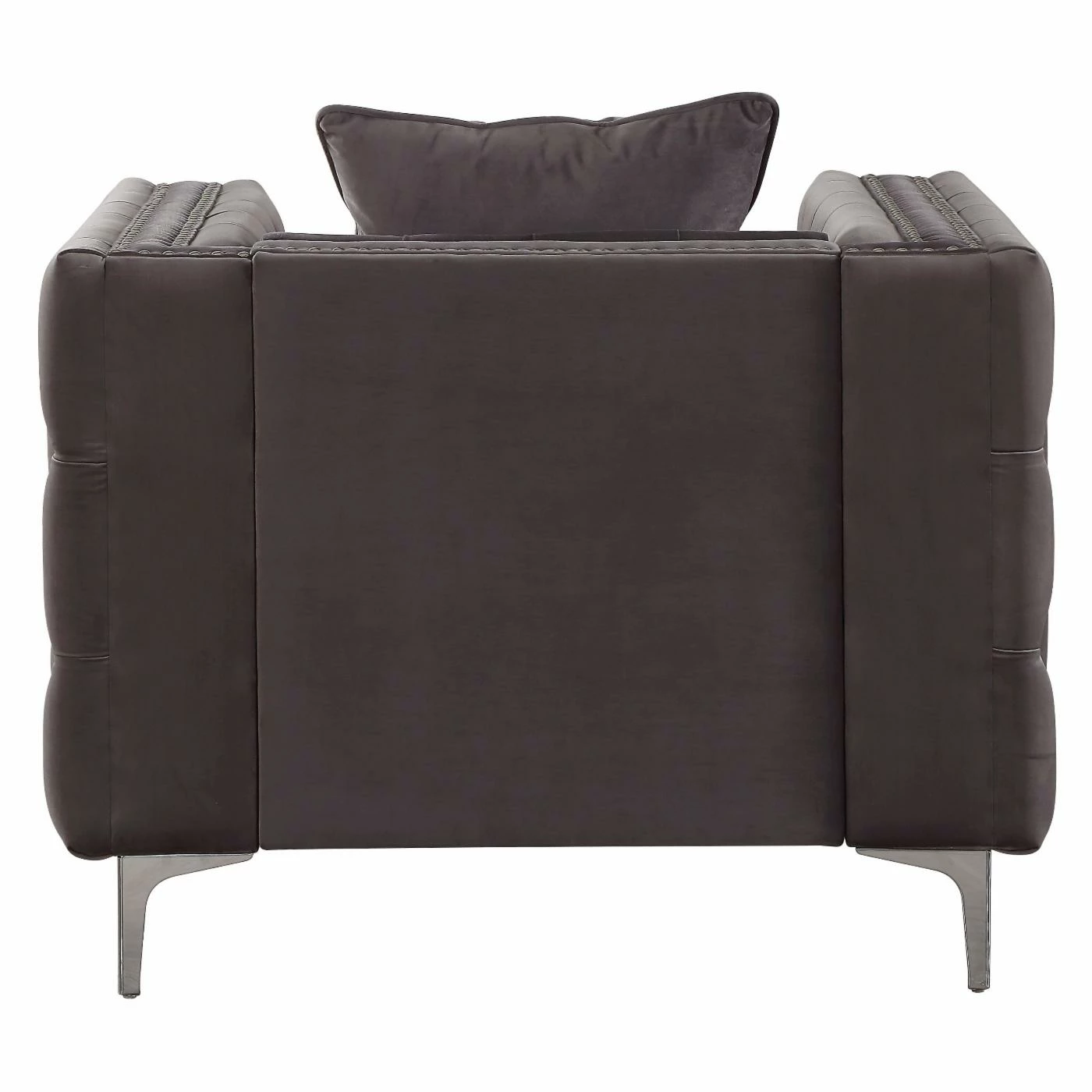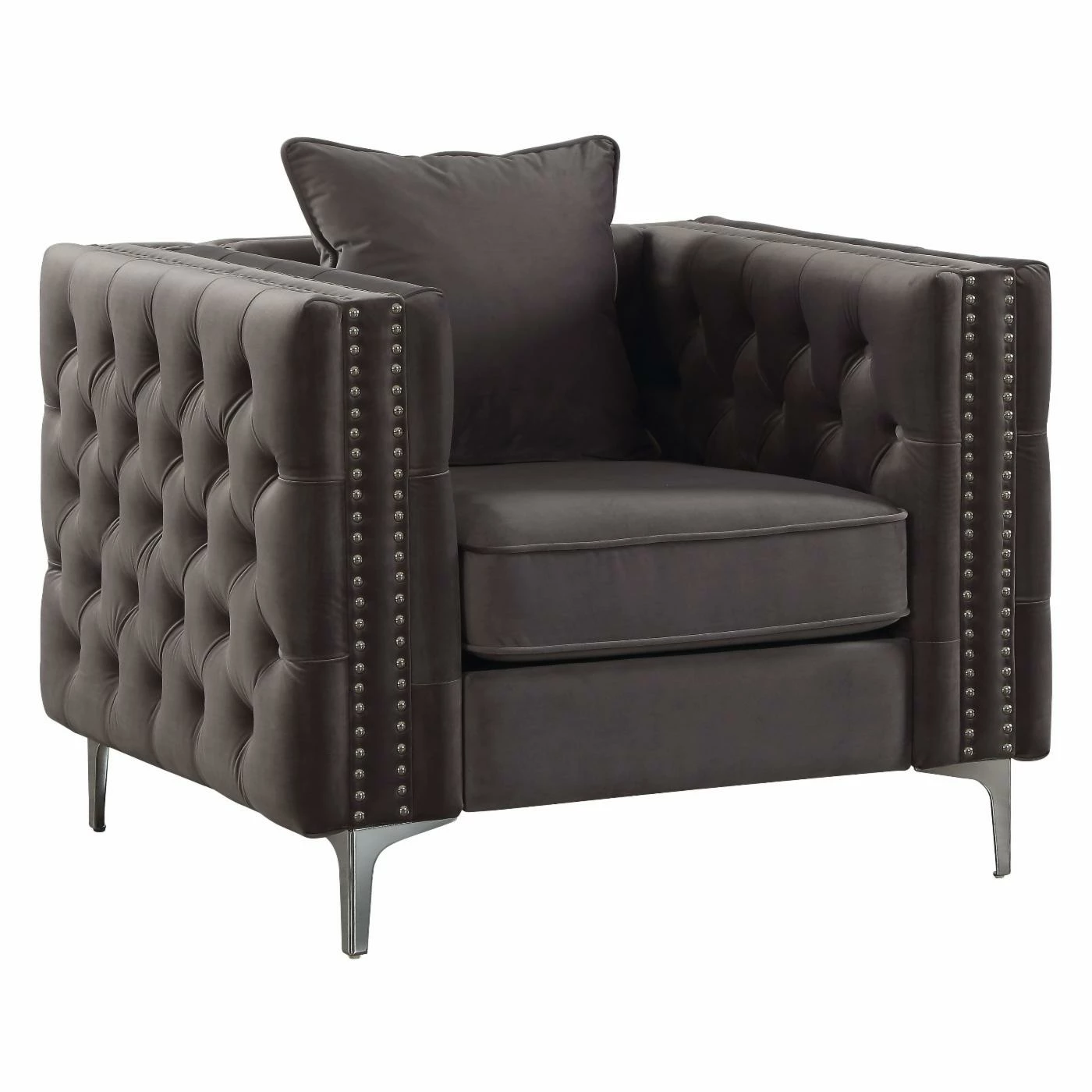 Dark gray velvet upholstery and shelter arms give the Acme Furniture Gillian II Chair its chic luxury. Designer details include deep button tufting, welted trim on the box seat cushion, and double rows of silver-tone nail head trim. A matching velvet throw pillow adds a posh finishing touch to this club chair.