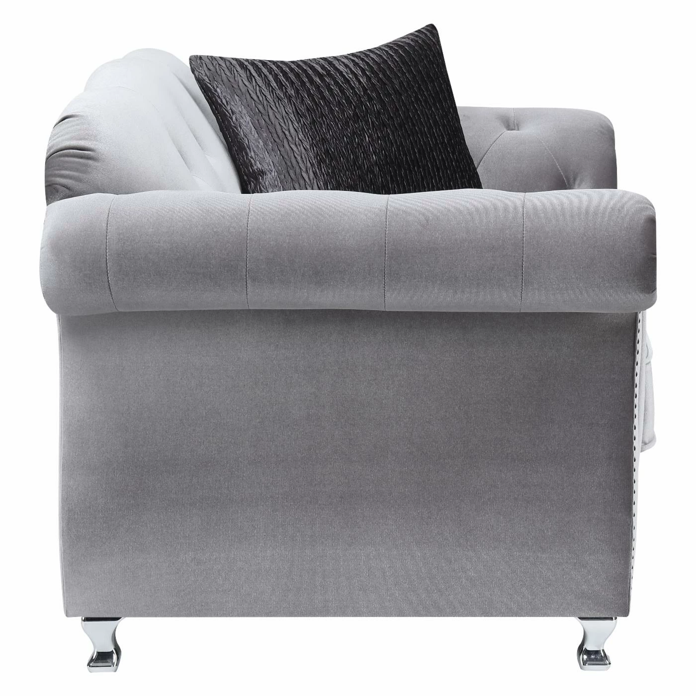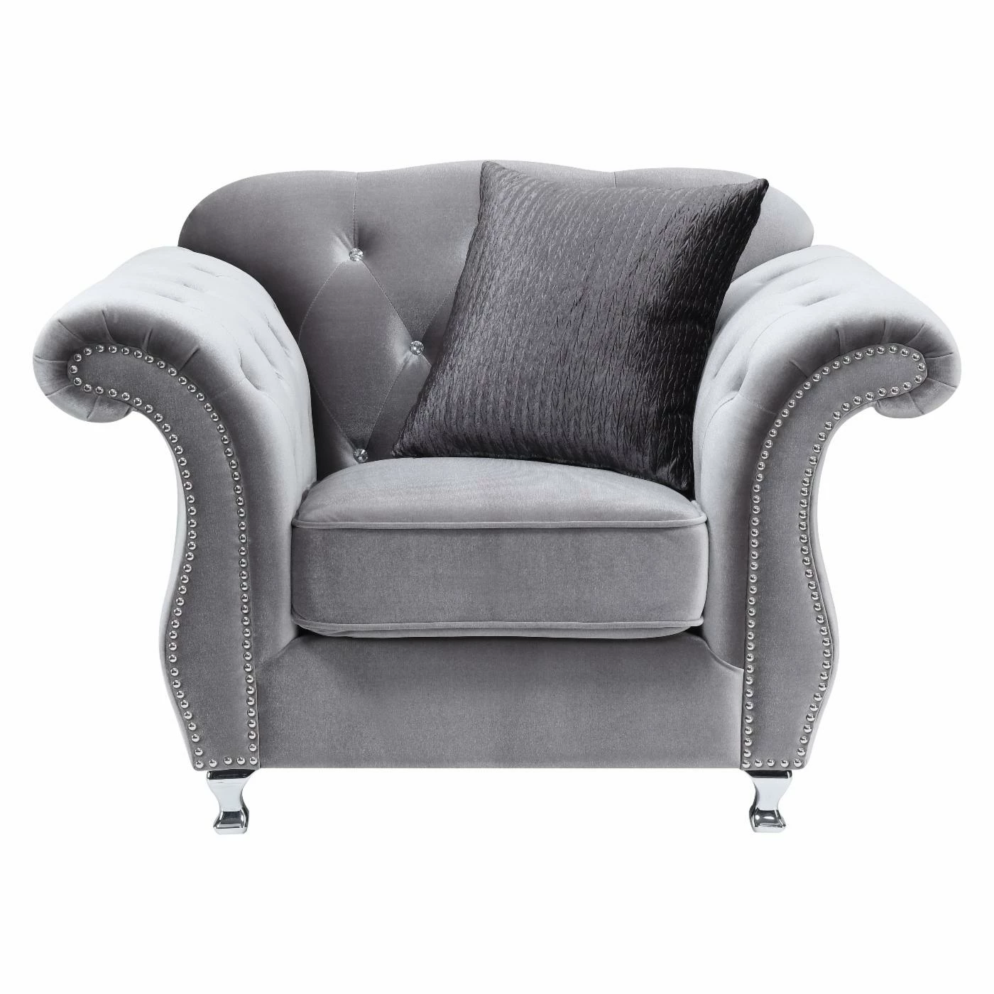 Indulge your love of sparkle and sensuous texture with the velvet-clad Coaster Furniture Frostine Accent Chair. Rounded armrests flare to an extreme; their fronts are dotted with silvery nail head trim. Crystal tufting pops against the suave gray velvet. Updated Queen Anne legs are chrome-finished.