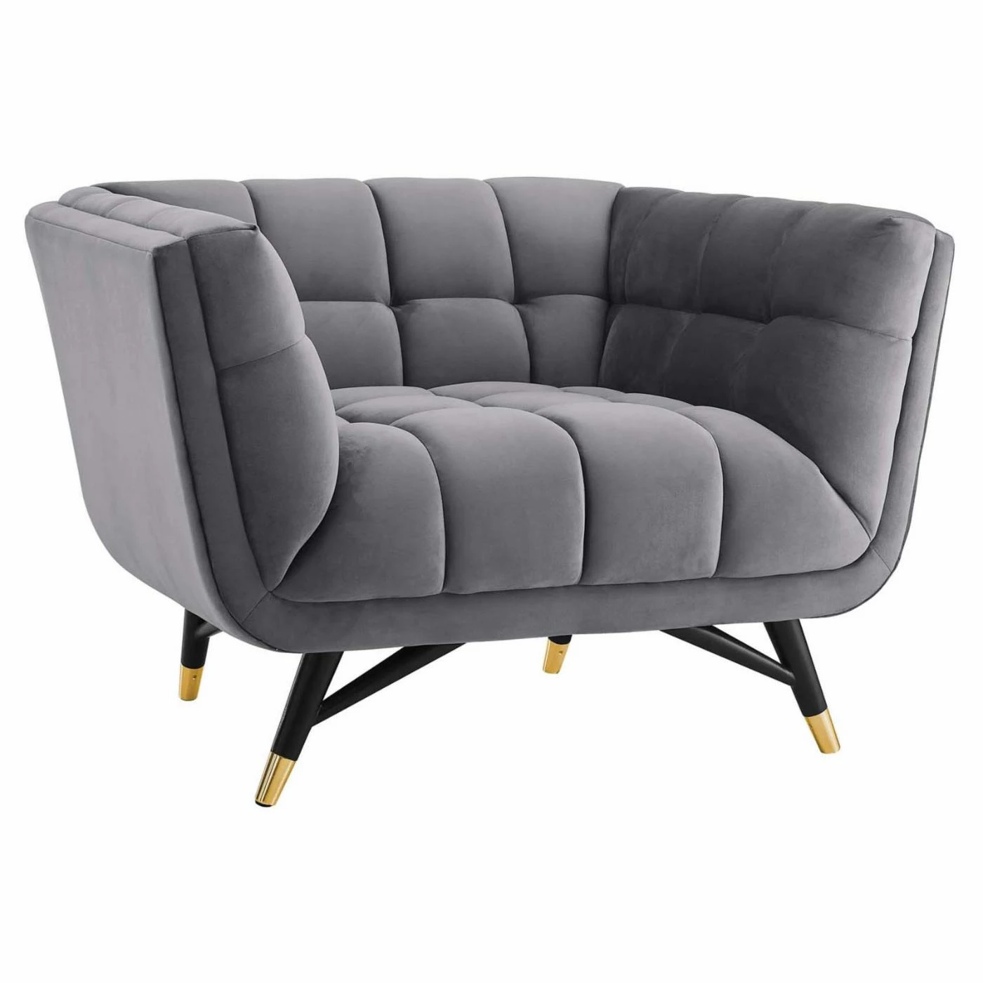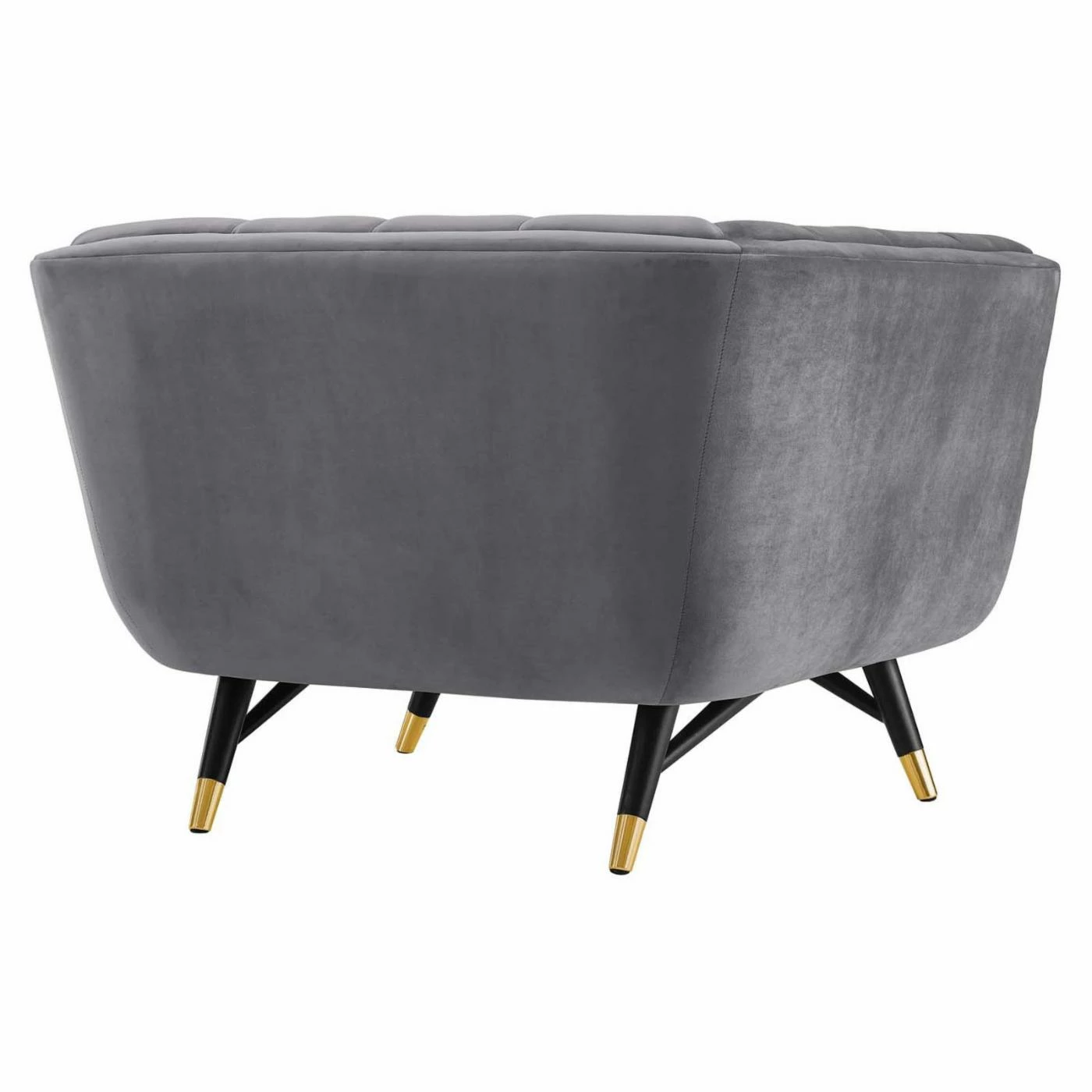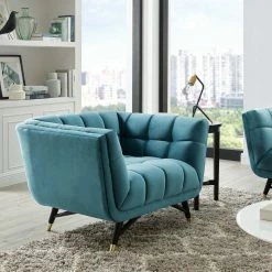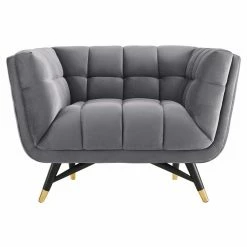 With its wide profile and laid-back design, the Modway Adept Upholstered Velvet Armchair combines coziness with ultra-modern style. Deep tufting and velvet upholstery in your choice of available color makes this armchair a fantastic option for any contemporary space. The chair rests on a birchwood frame and legs finished in black, while gold metal caps bring it a touch of bright, mid-century appeal.