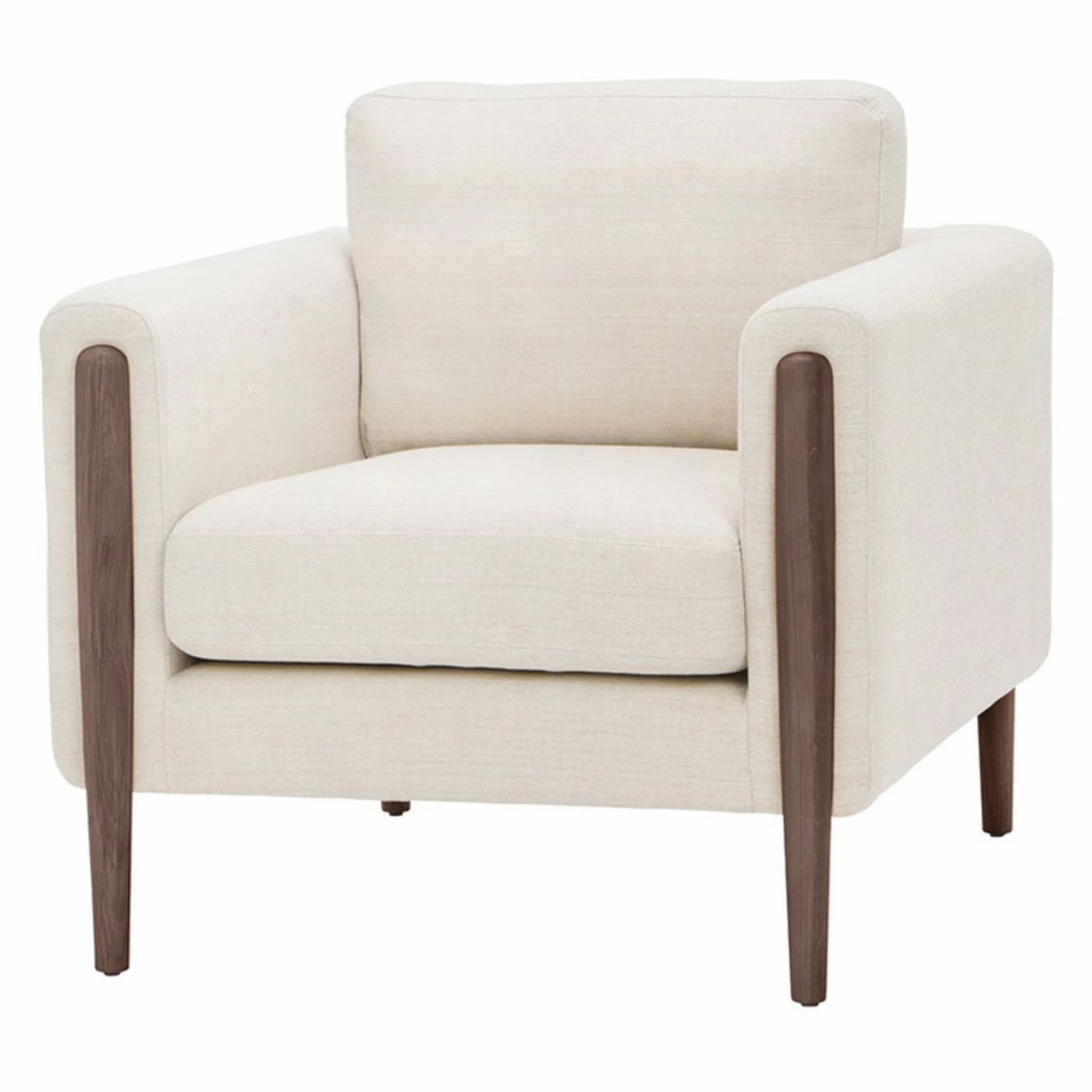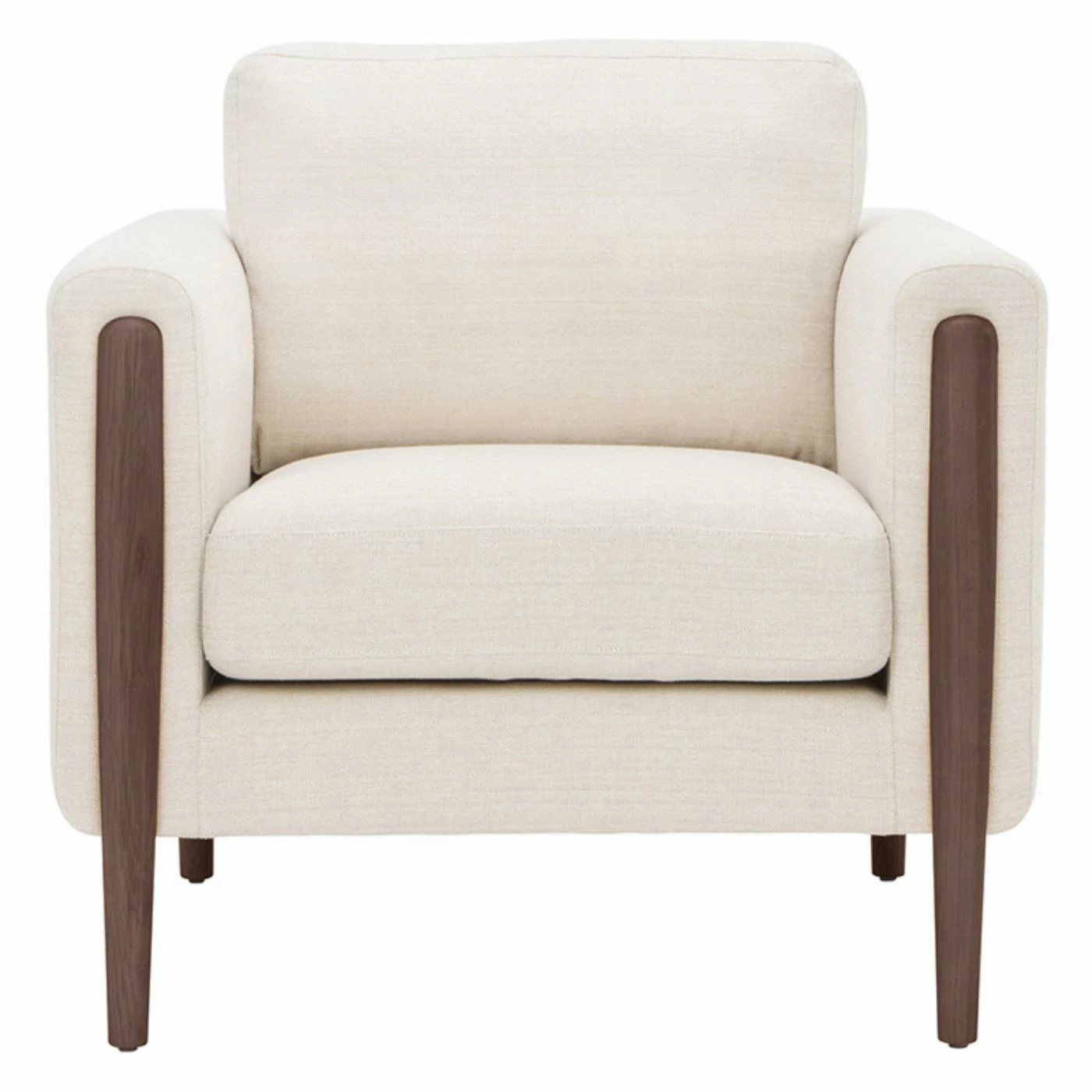 For upright support with a wonderfully plush seat, settle into the Nuevo Steen Accent Arm Chair. This one-seat chair has a modern vintage look, with its light sand fabric and straight, tapered wood legs with walnut finish. The fabric upholstery is 80% polyester and 20% acrylic for a lightly textured effect, while the clean lines and square shape give it a beautifully contemporary silhouette.