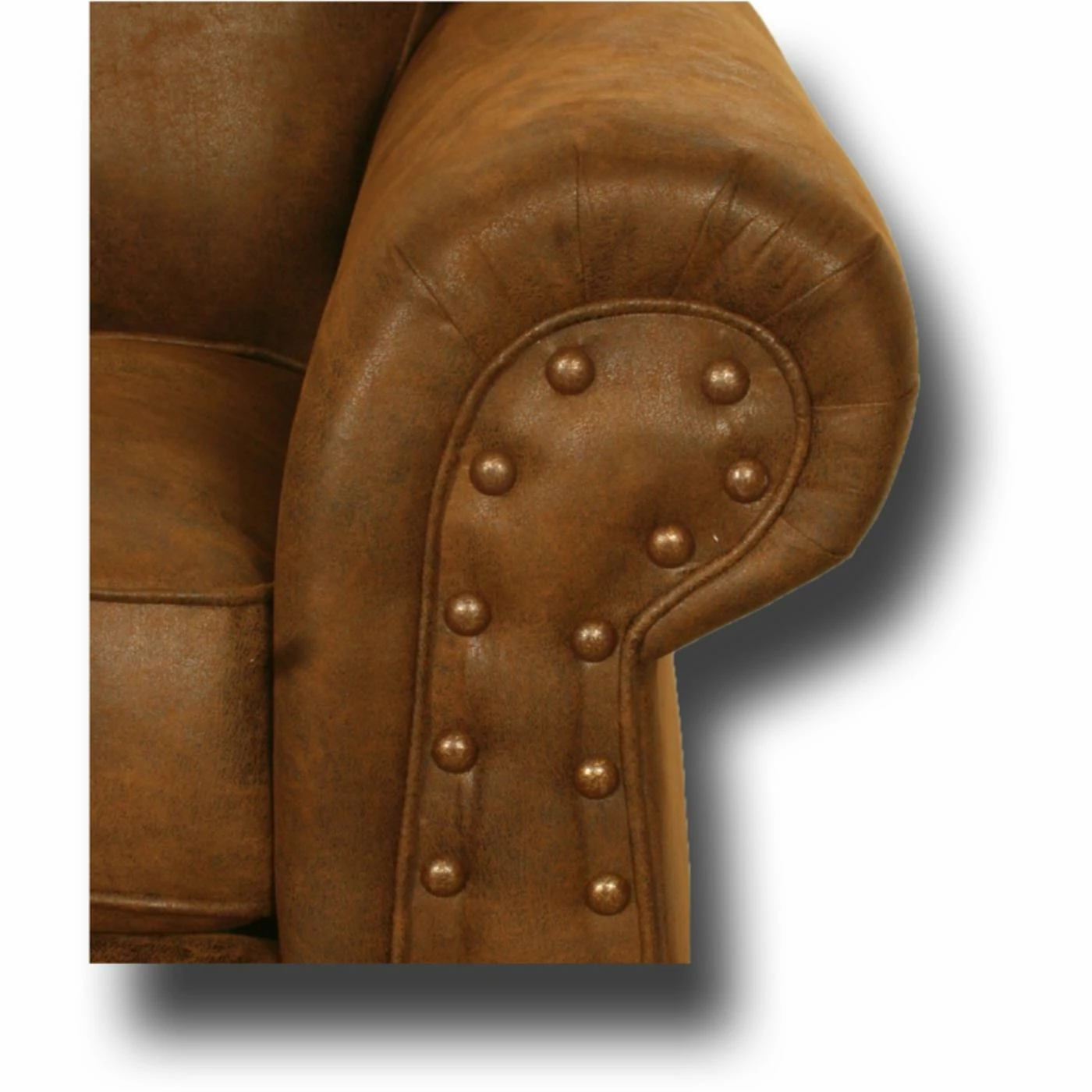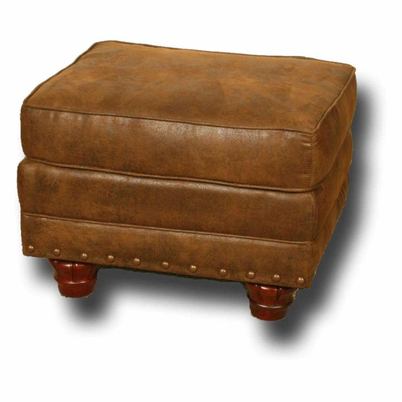 Sure to be your new favorite chair, the Outdoor Leisure Products Sedona Chair and Ottoman is generously scaled and graced with rolled arms and plump fiber-wrapped foam cushions. Its lodge-worthy brown faux leather microfiber looks and feels as soft as leather. nailhead accents enhance the rugged look. This chair and ottoman set is well-built with a solid wood frame and turned bun feet.