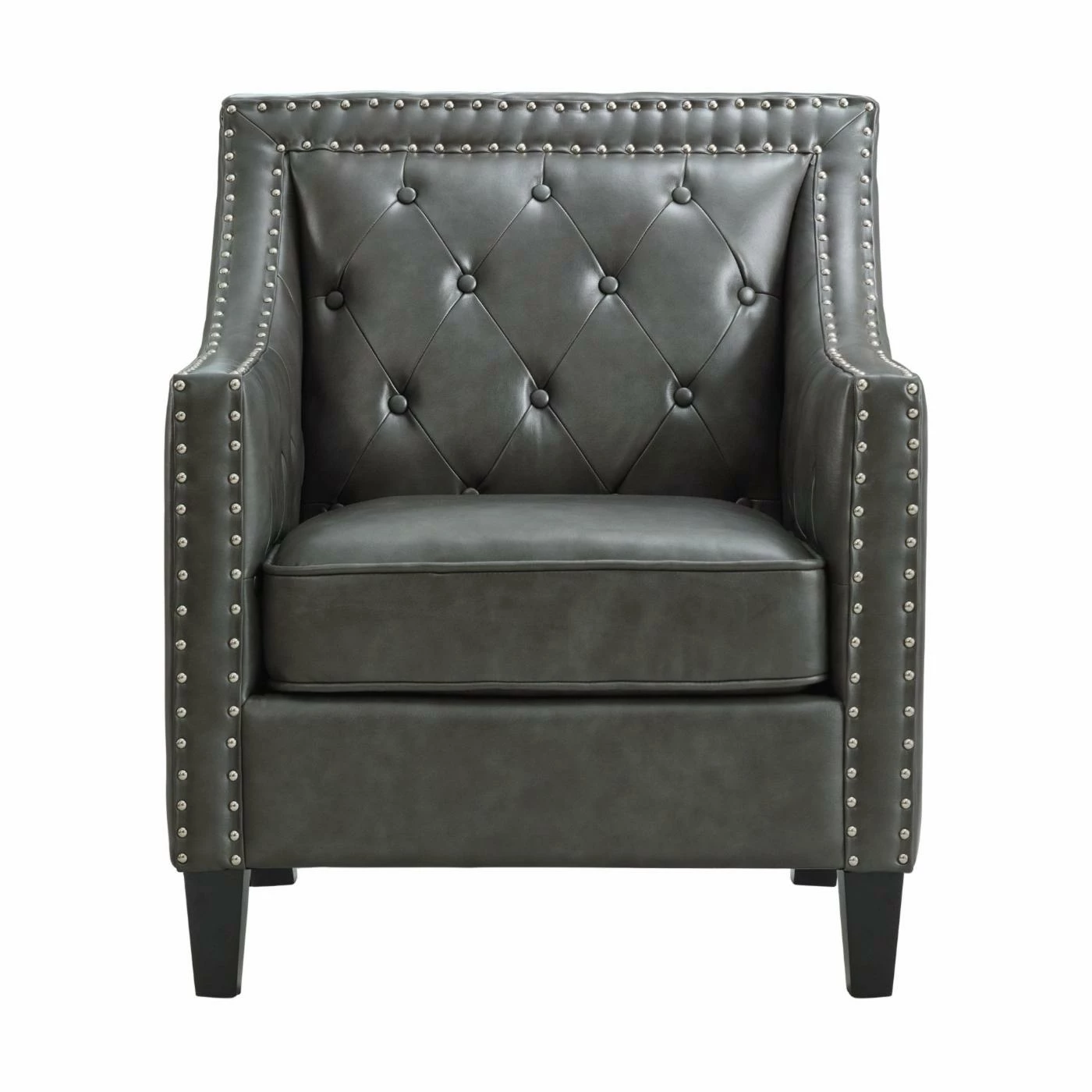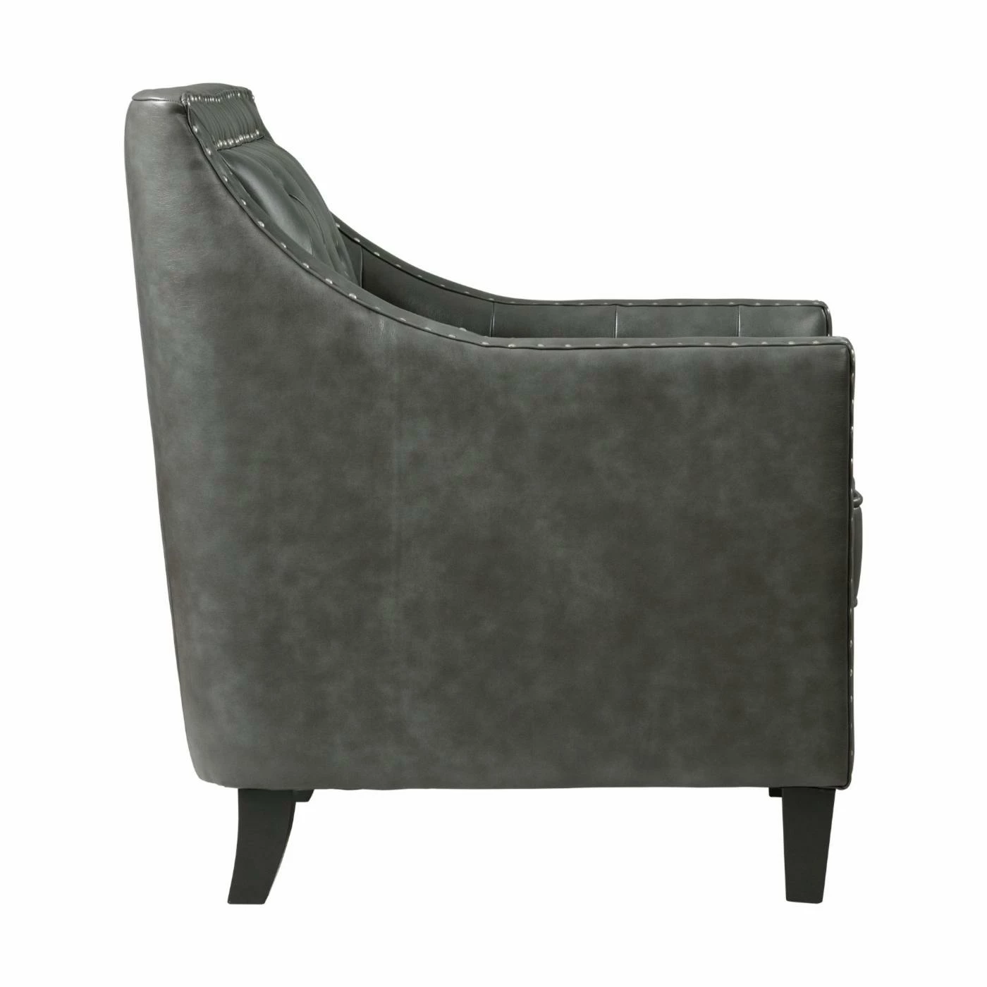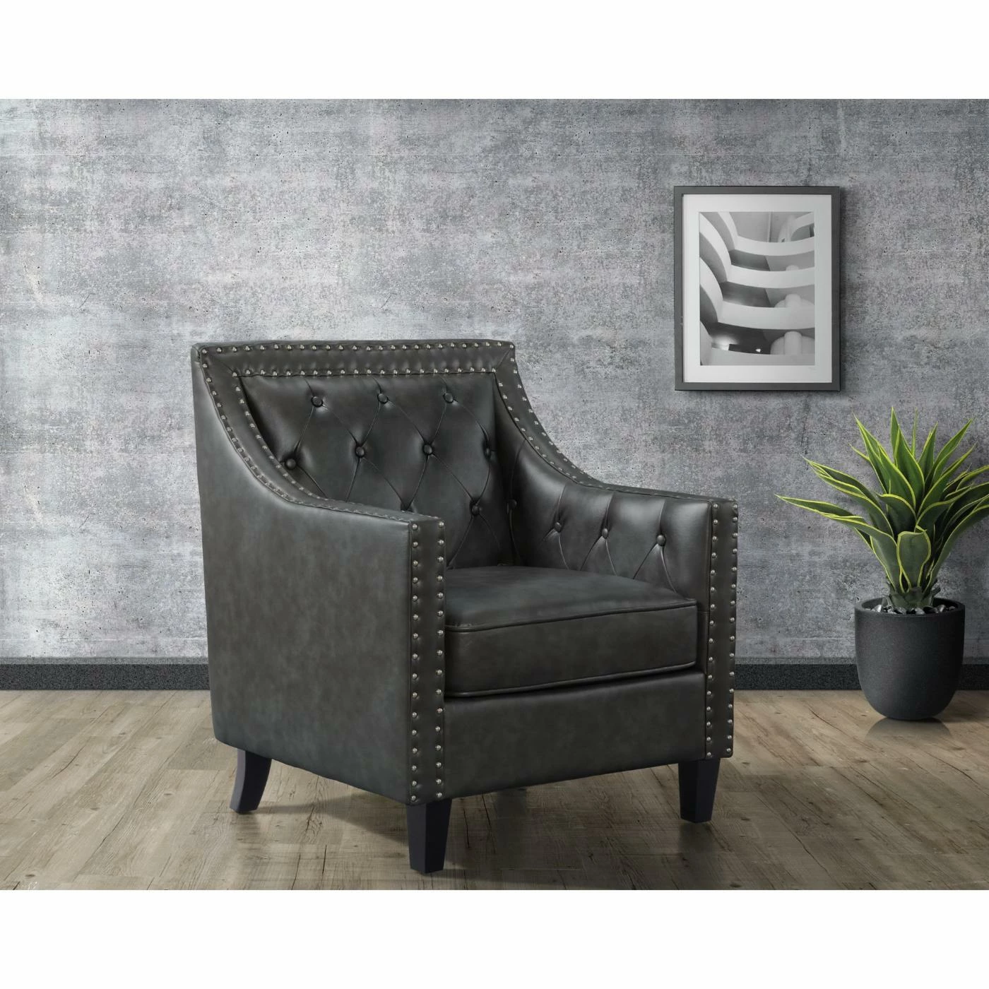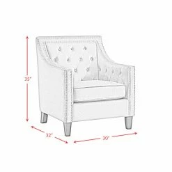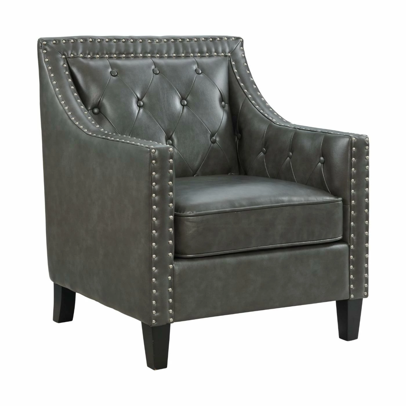 The Picket House Furnishings Tessa Faux Leather Button Tufted Club Chair is the piece you’ve been missing. This chair is perfect for your modern home aesthetics. Crafted in plywood, rubberwood, and upholstered in soft velvet fabric. Adds an interesting touch with its silver nail head trim and diamond tufting at back. Add the Teagan accent chair to your home for a modern touch.
