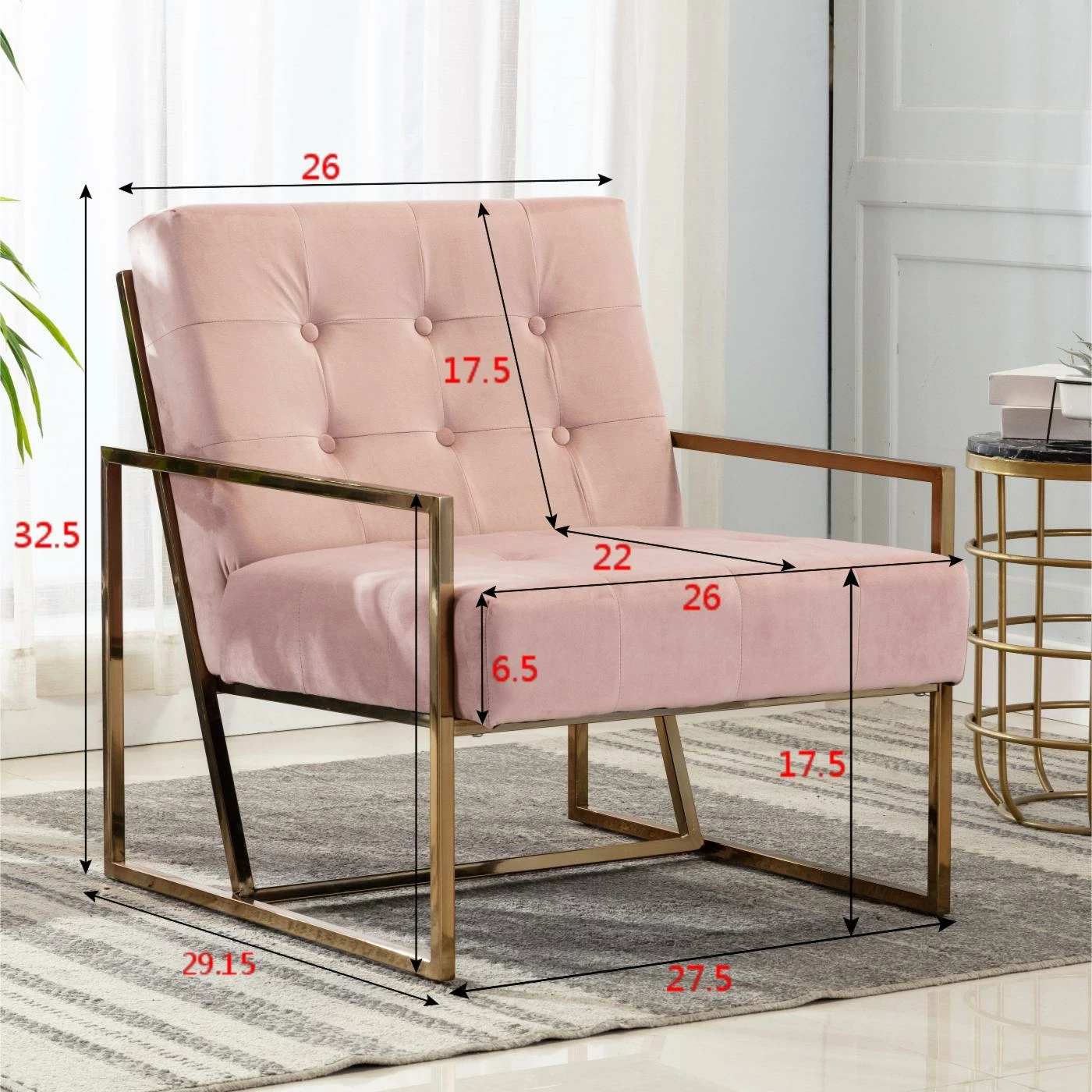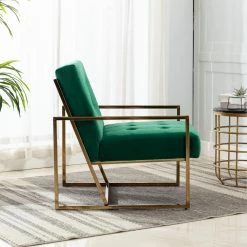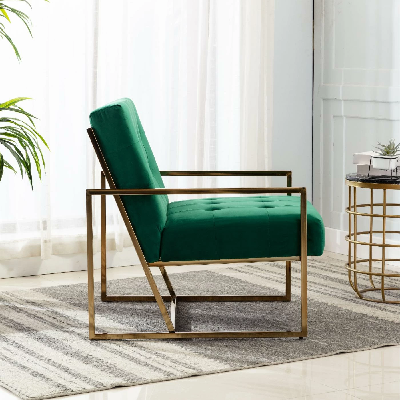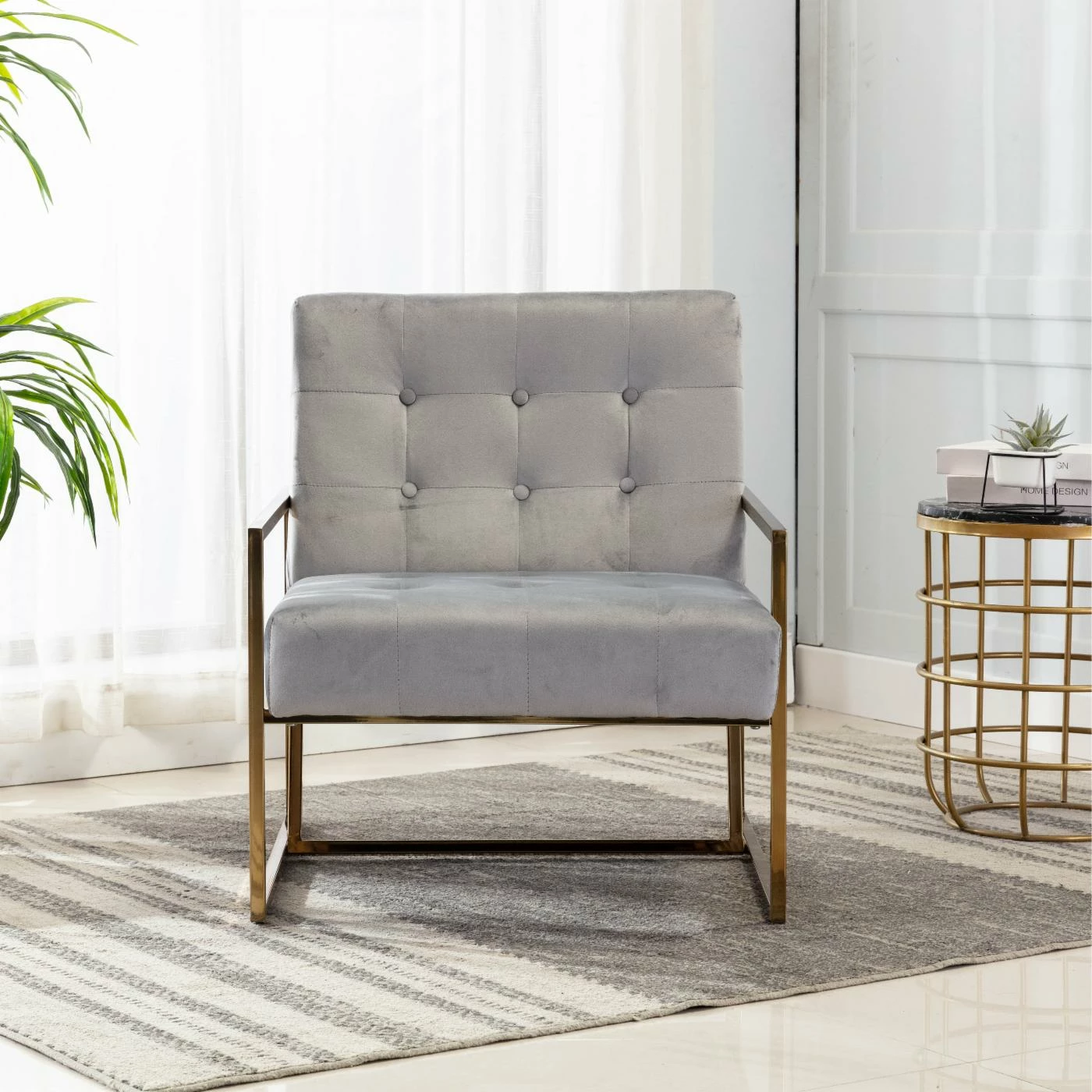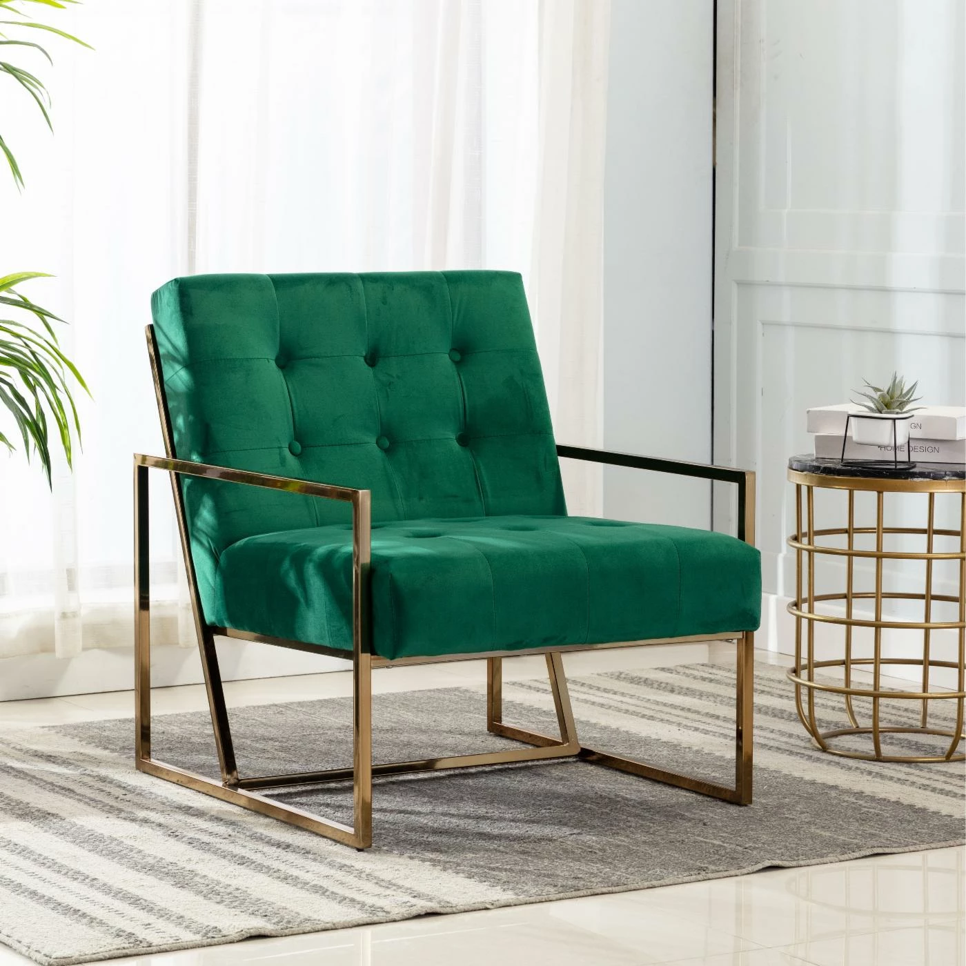 Make your living room, lounge, or waiting room more comfortable with the Roundhill Furniture Ravia Velvet Tufted Accent Chair. This chair has a seat that’s both wide and deep, padded generously with thick foam. Elegant velvet upholsters the seat, deeply tufted with buttons in a diamond design. This chair is constructed with a sturdy metal frame in a golden finish for a chic modern look. Add this chair to the lounge, living room, or any space where relaxation and leisure are to be had. Select color options from the available.