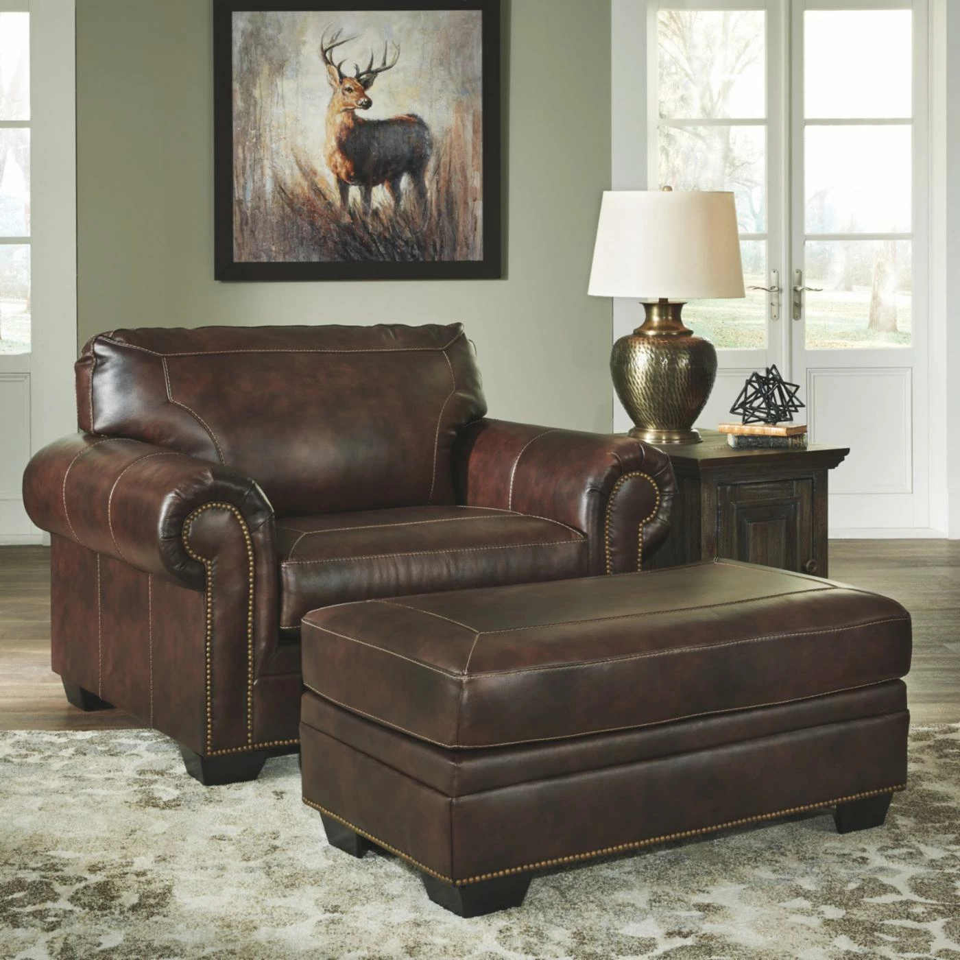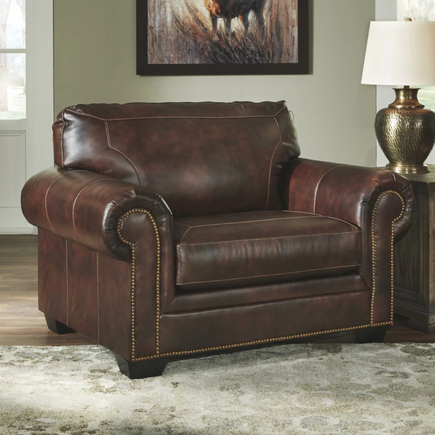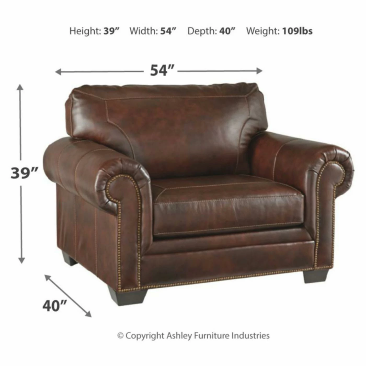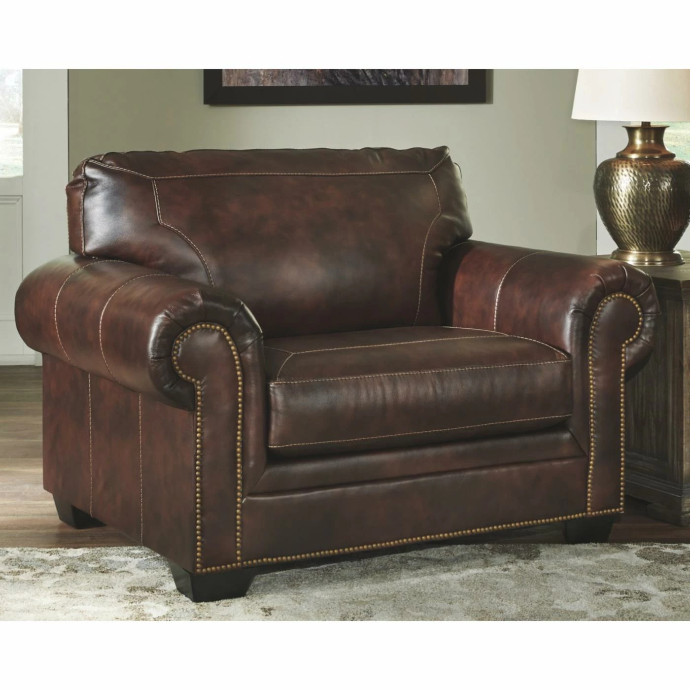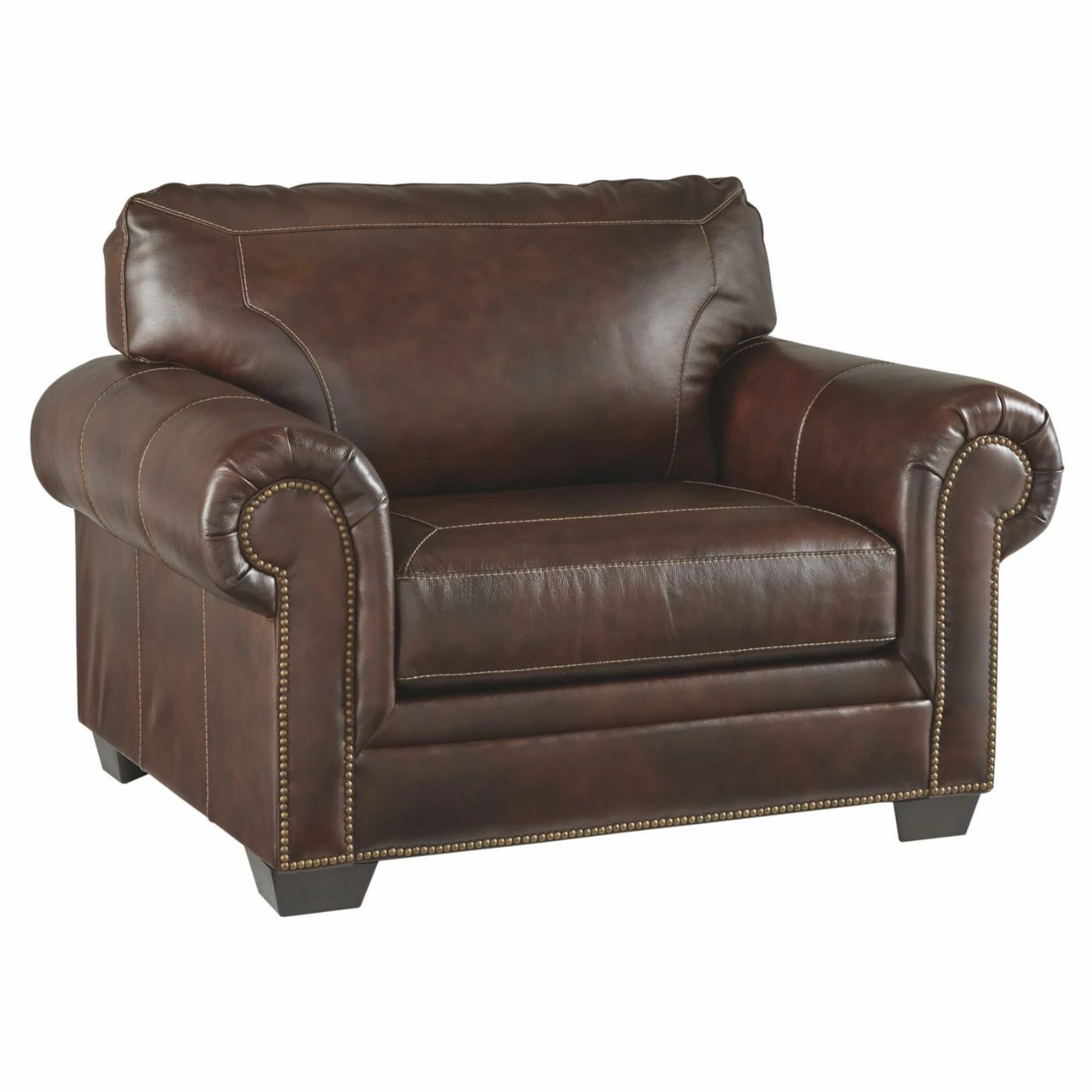 Create a traditional and sophisticated seating area around the Signature Design by Ashley Roleson Oversized Club Chair. This oversized chair features rolled arms accented with nailhead trim details. The warm walnut tone of the faux leather fabric provides a classic look to the spacious design. A rigorously tested framework and platform foundation provides a reliable structure to this chair.