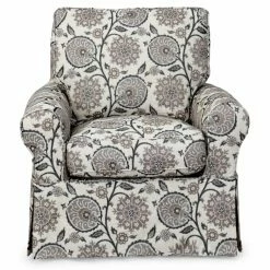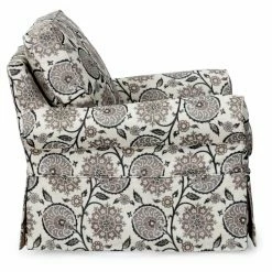 This swiveling chair is designed for comfort with a durable hardwood frame topped with eight-way, hand-tied, heavy-gauge steel spring coils that move independently to maximize comfort. The box seat cushion features 1.8-density foam wrapped in Dacron batting. The shaped back cushion has a feather down blend and is channel-sewn to be ultra comfortable. The removable skirt is also machine-washable. Clean the chair by vacuuming it frequently and spot cleaning when needed.