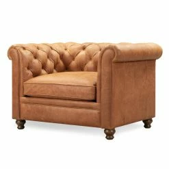 Bring elevated, polished allure to your living room or den with the Poly & Bark Lyon Accent Chair. Crafted in the Chesterfield tradition, our chair features elegant rolled arms and diamond button tufting along the seat back and sides. Its dyed Italian tanned full-grain leather upholstery is a buttery pure-aniline hide accentuated by scuffs and naturally occurring wrinkles and markings, which patinas well with luxurious character. Eight-way hand tied seat support is topped by a high-density foam cushion with feather down for sublime softness. Its kiln-dried wood frame is corner blocked for superior durability, and its beveled wood legs in espresso finish convey enduring sophistication.