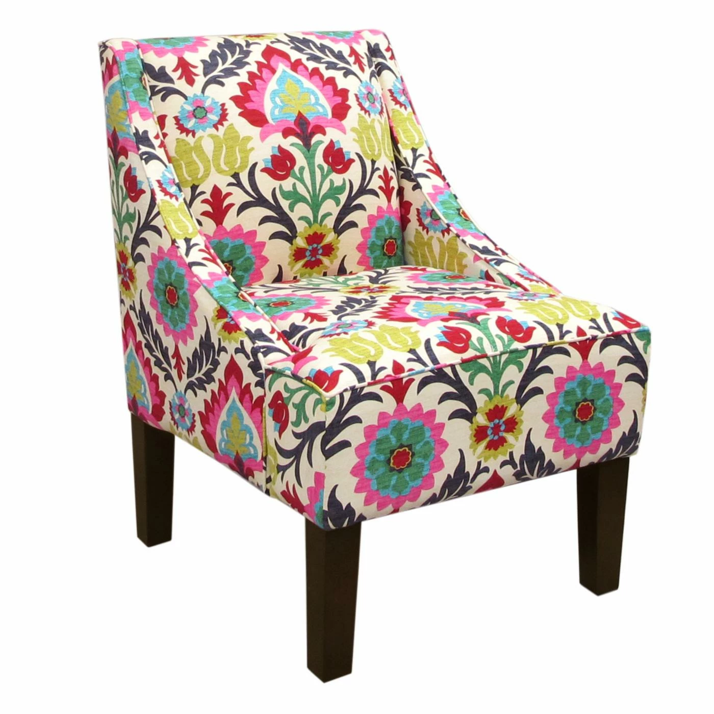 Bold colors and a large-scale floral give the Skyline Swoop Arm Chair in Santa Maria Desert Flower its folk art charm. Designed to bring a pop of color and maximum comfort, this accent chair features deep seating, plush foam padding, and premium cotton upholstery. You’ll love its squared legs and contemporary wingback design.