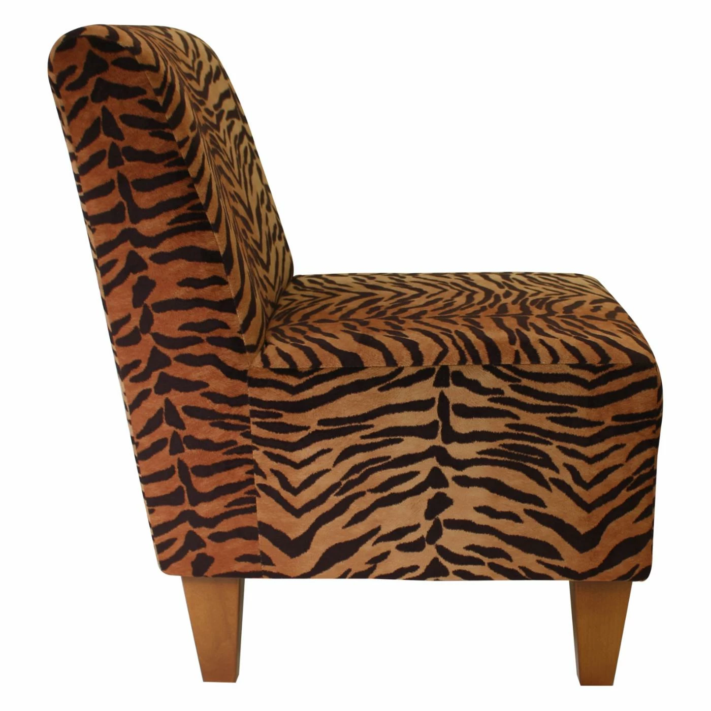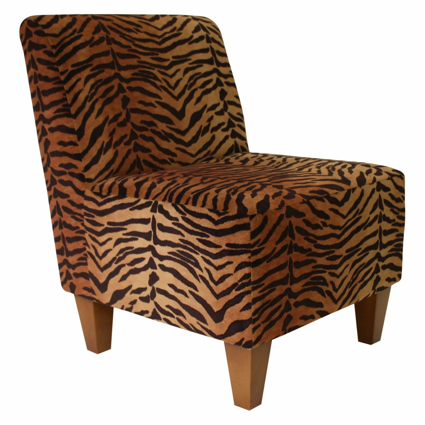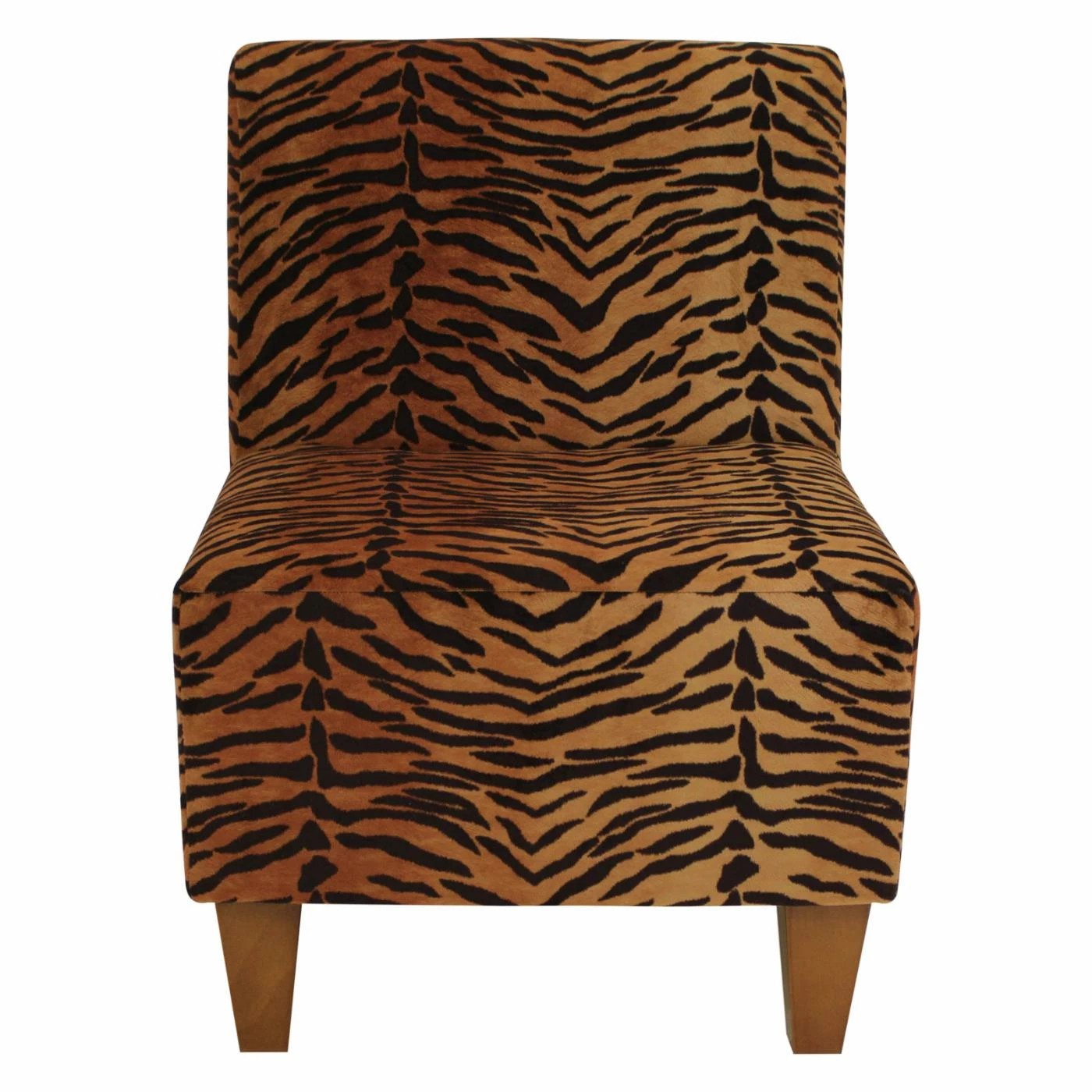Youβll relish the Fox Hill Penelope Tiger Print Armless Slipper Chairβs primal print! Tiger stripes cover this slipper chairβs sleek, contemporary silhouette. Tapered, black wood block legs lend contemporary charm. This wood-framed chair offers ample width and sits slightly lower to the floor than most chairs. Furthermore, itβs made in the USA and arrives almost completely assembled. You just have to screw on the legs.